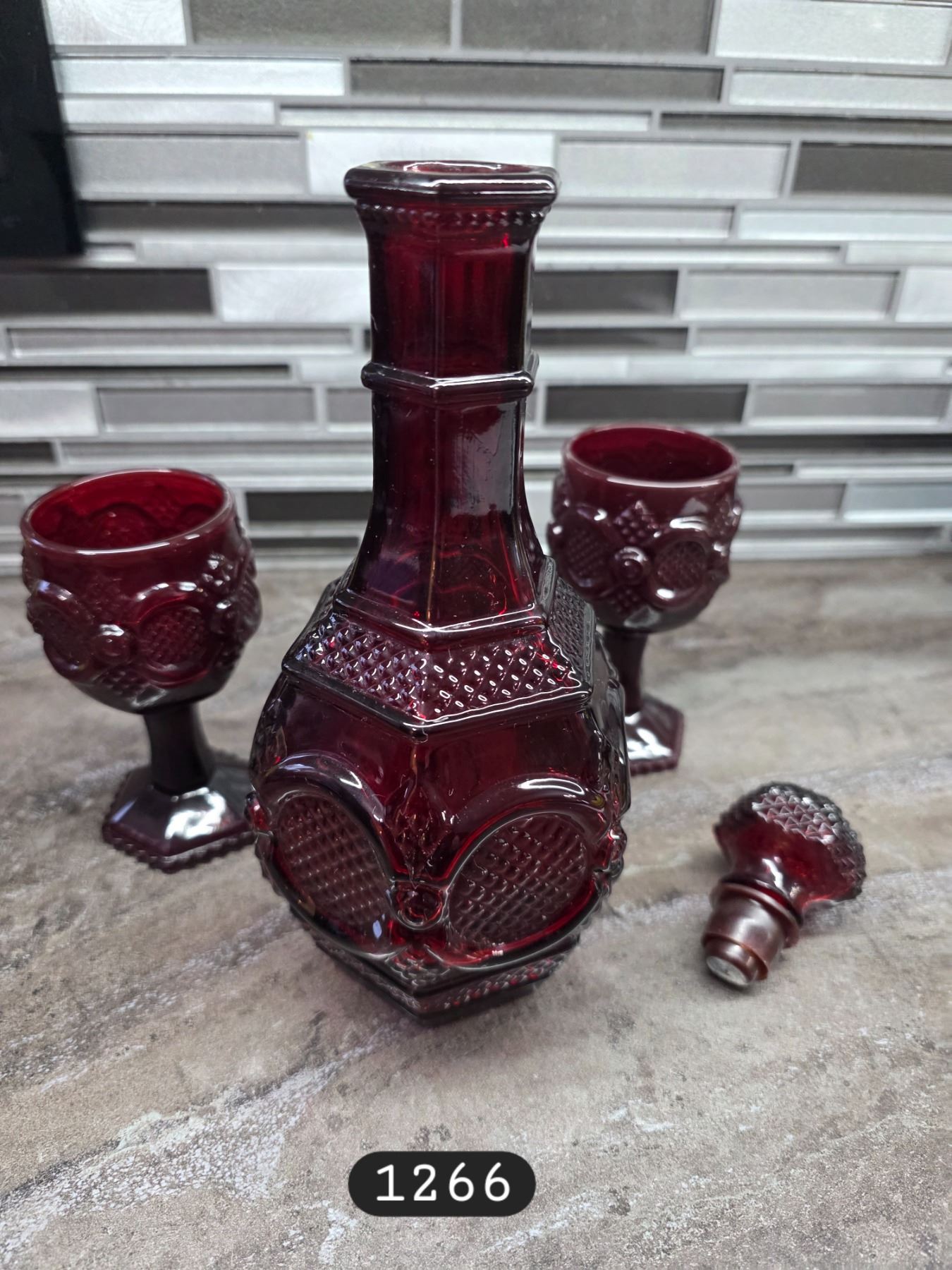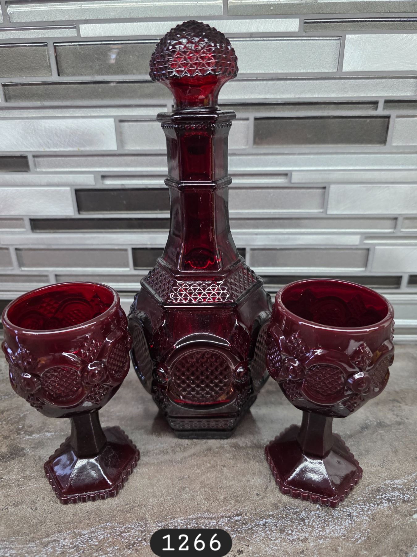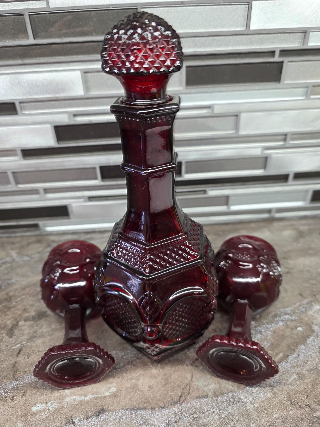Vintage Avon Cape Cod Collection Ruby Red Decanter w/ Stopper & (2) Glasses. No Chips.