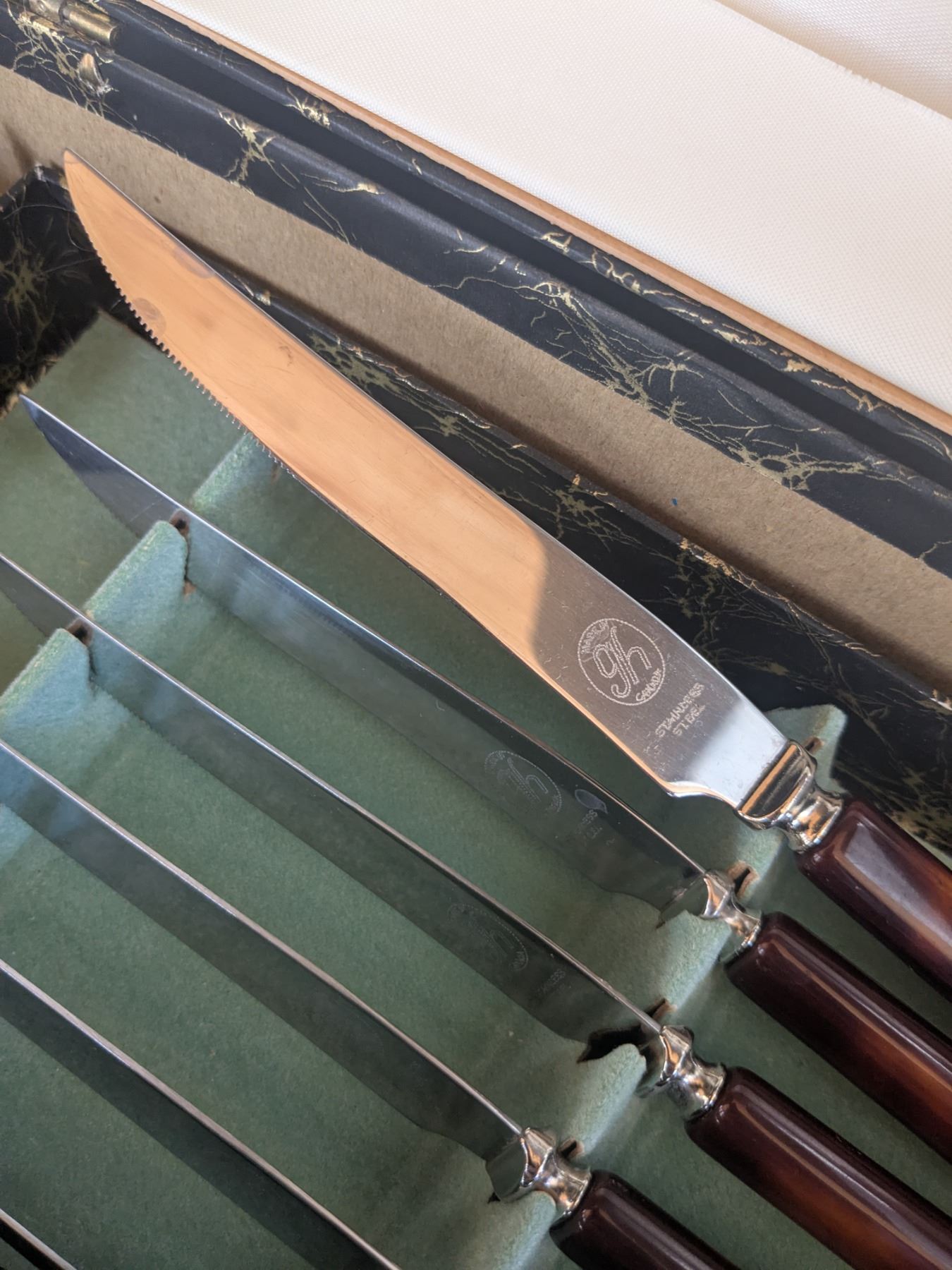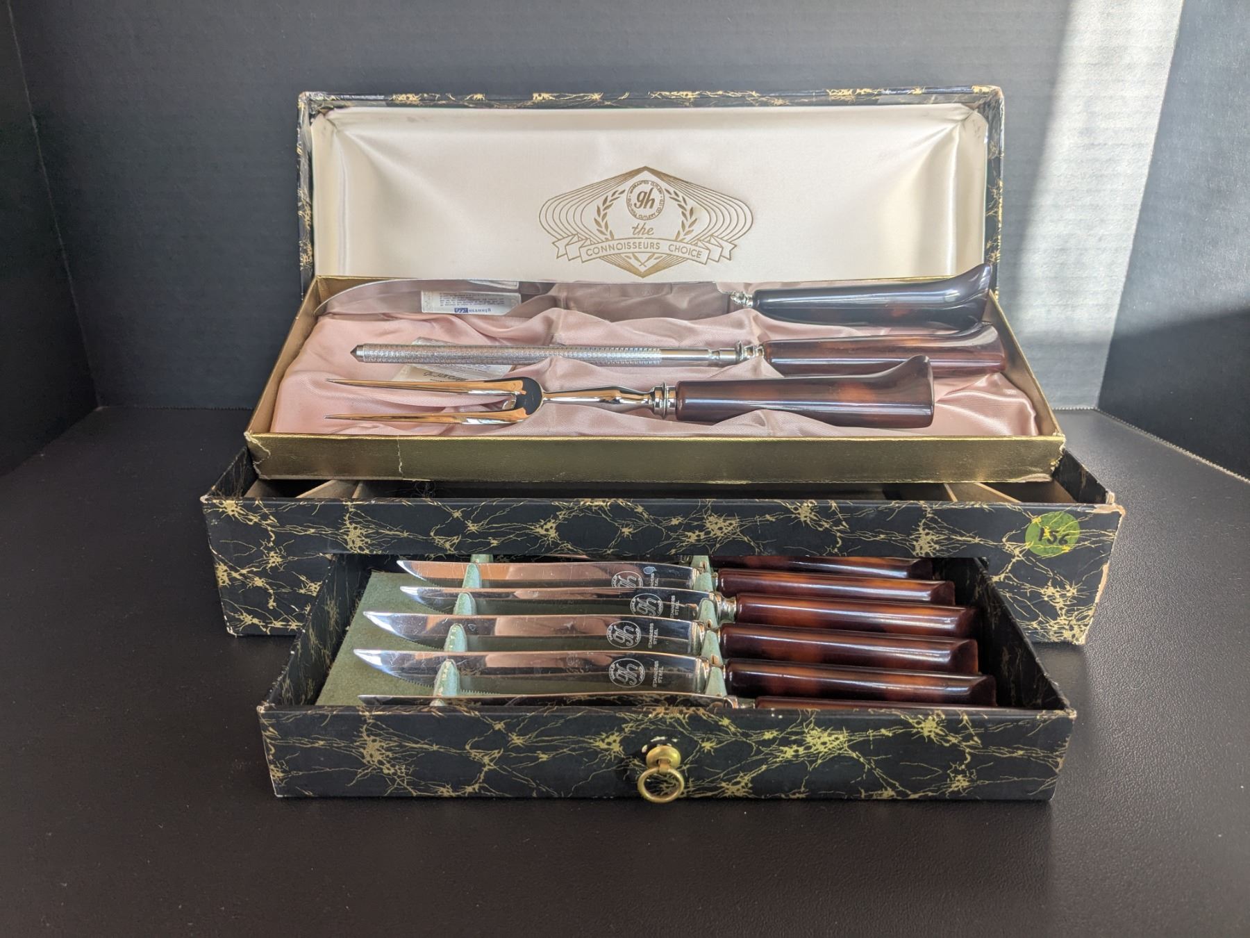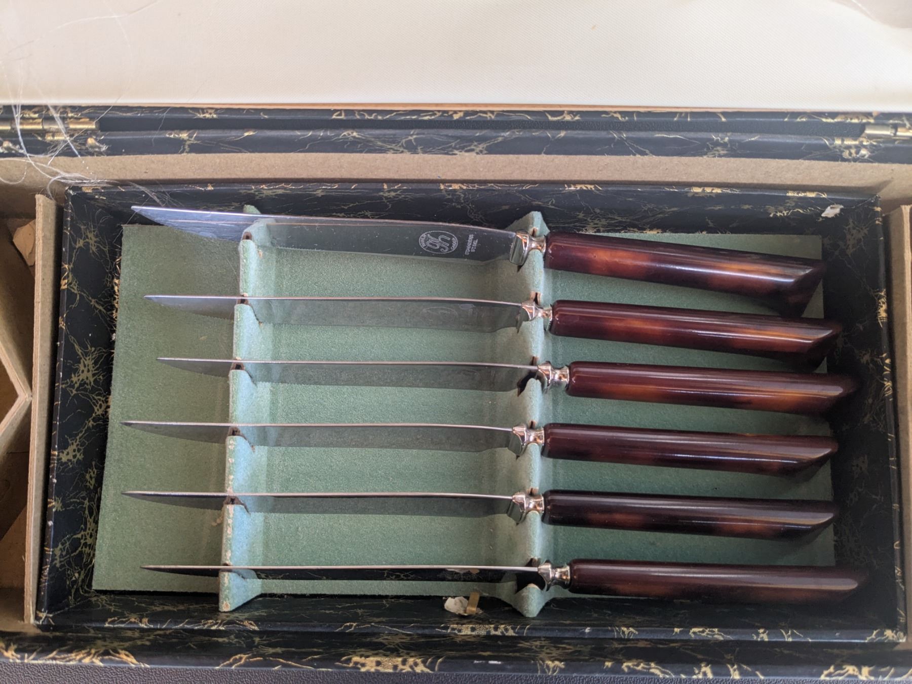 Vintage Bakelite Connoisseur Carving Set (unused) in orignal box. Six serrated knives.