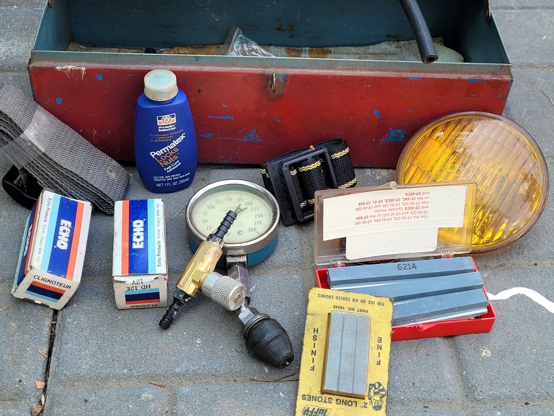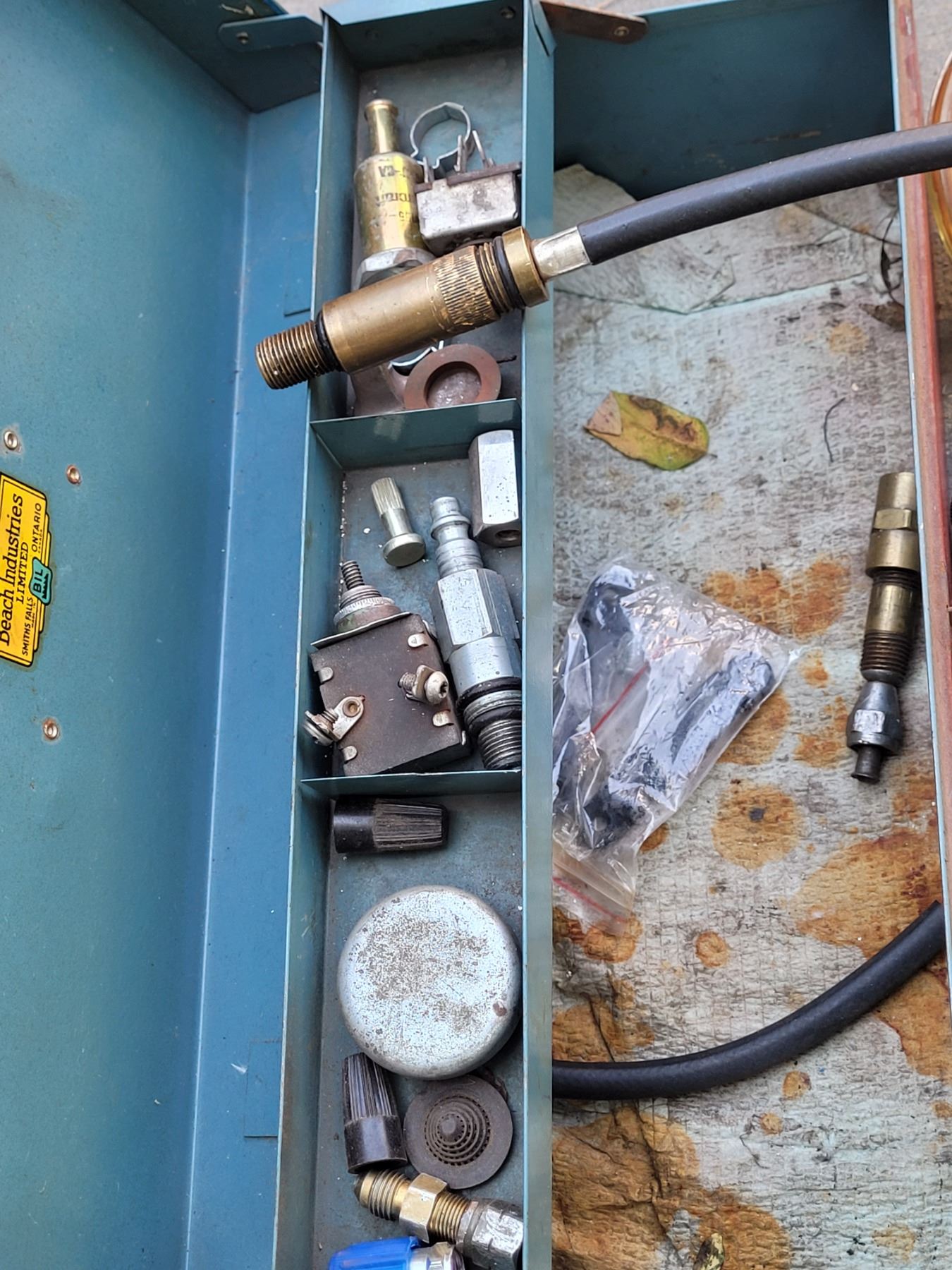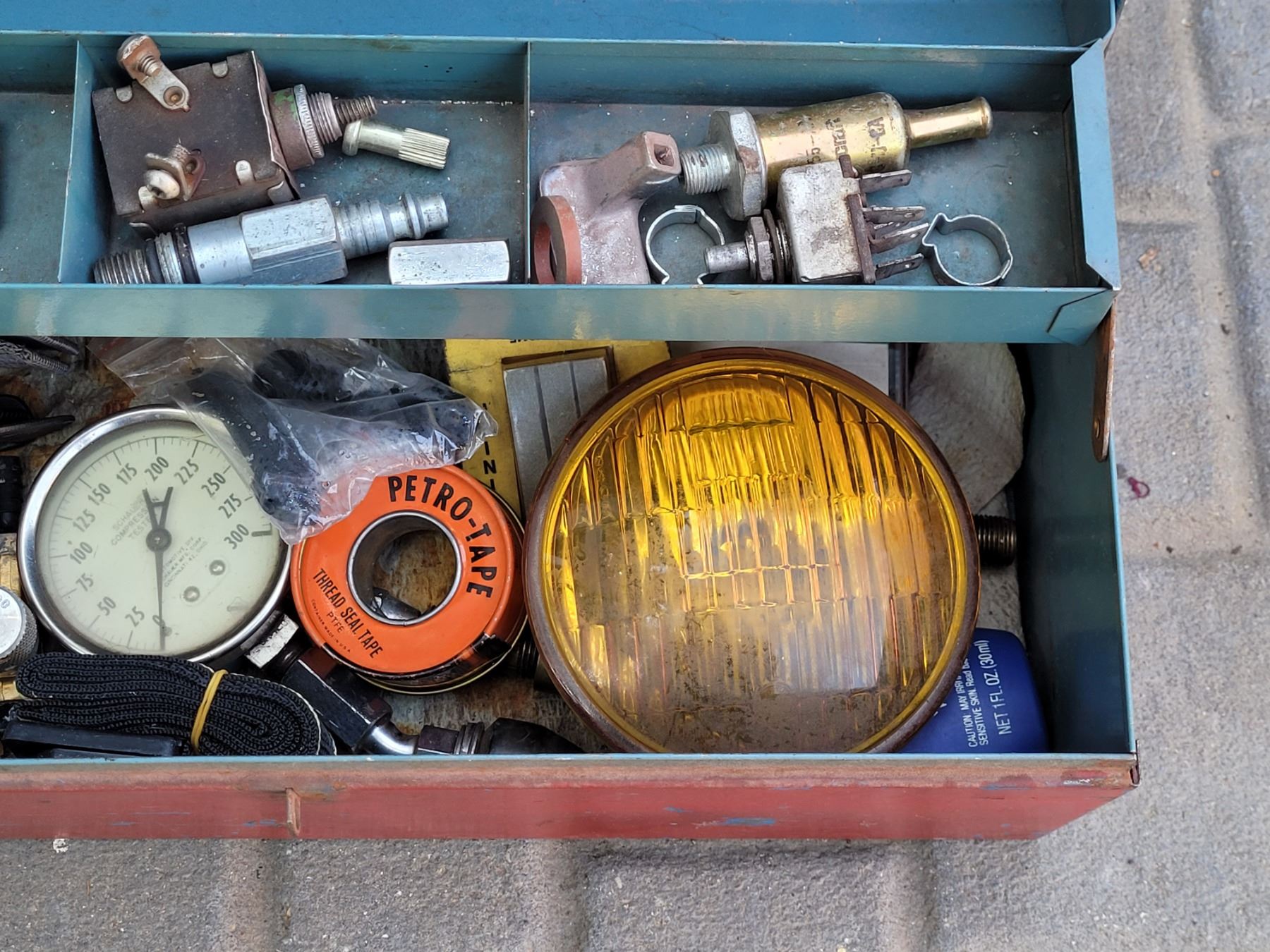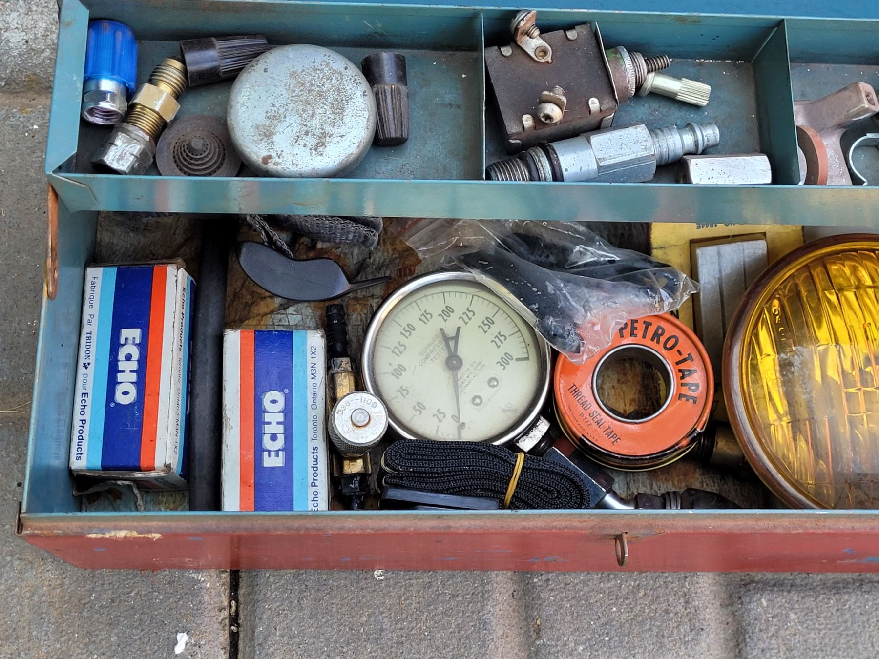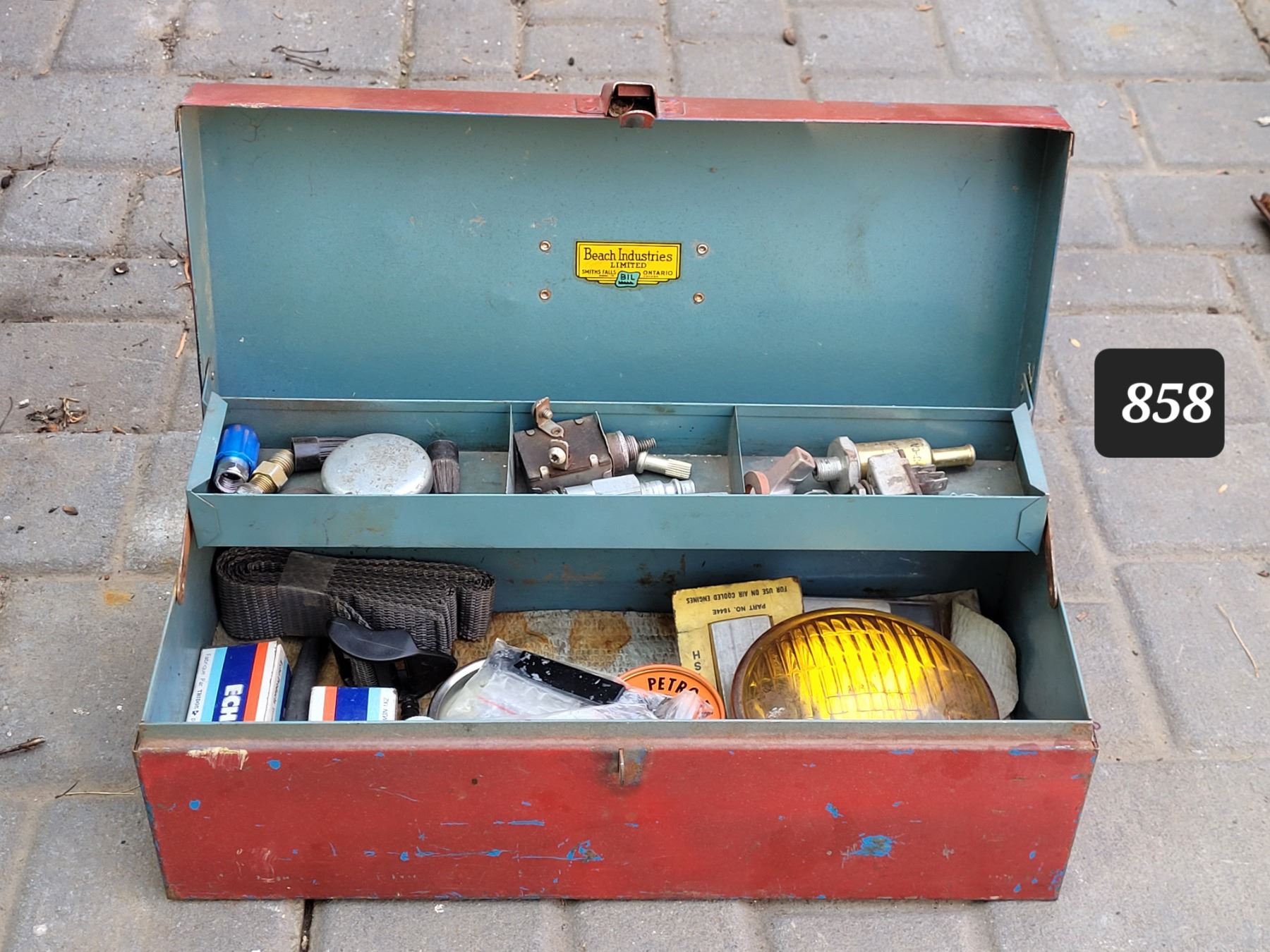 Vintage Beach Industries metal tool box (Ontario) & contents.