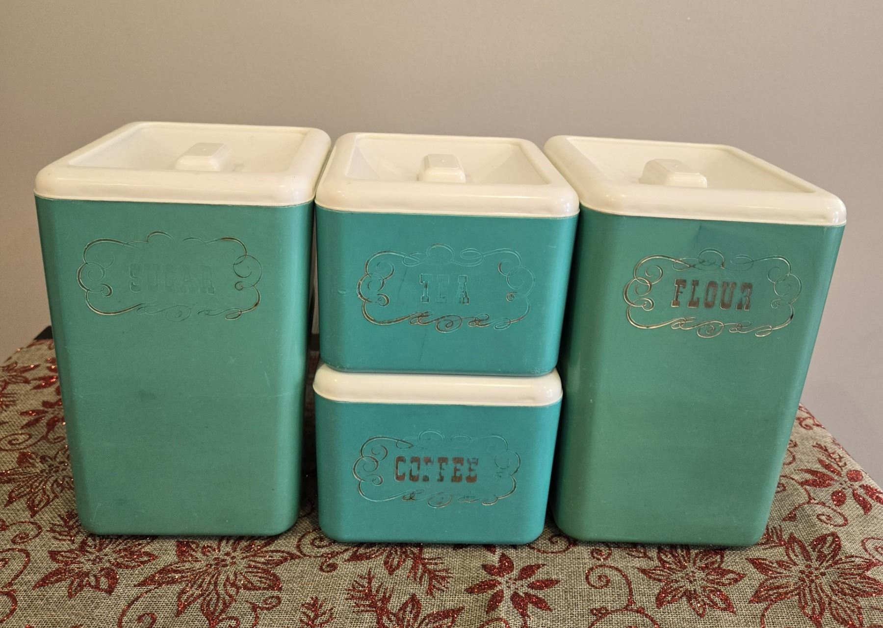 Vintage Beacon plastic 1950/60's sugar, flour, tea and coffee canisters. Turquois.