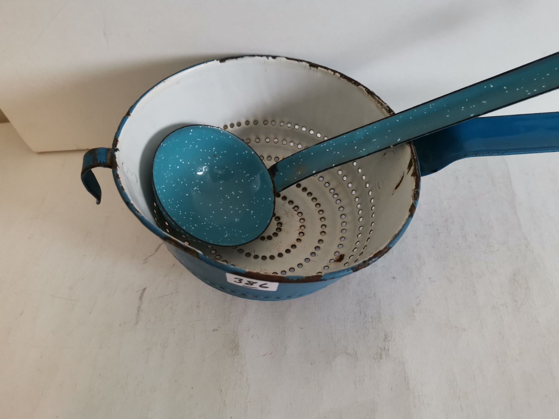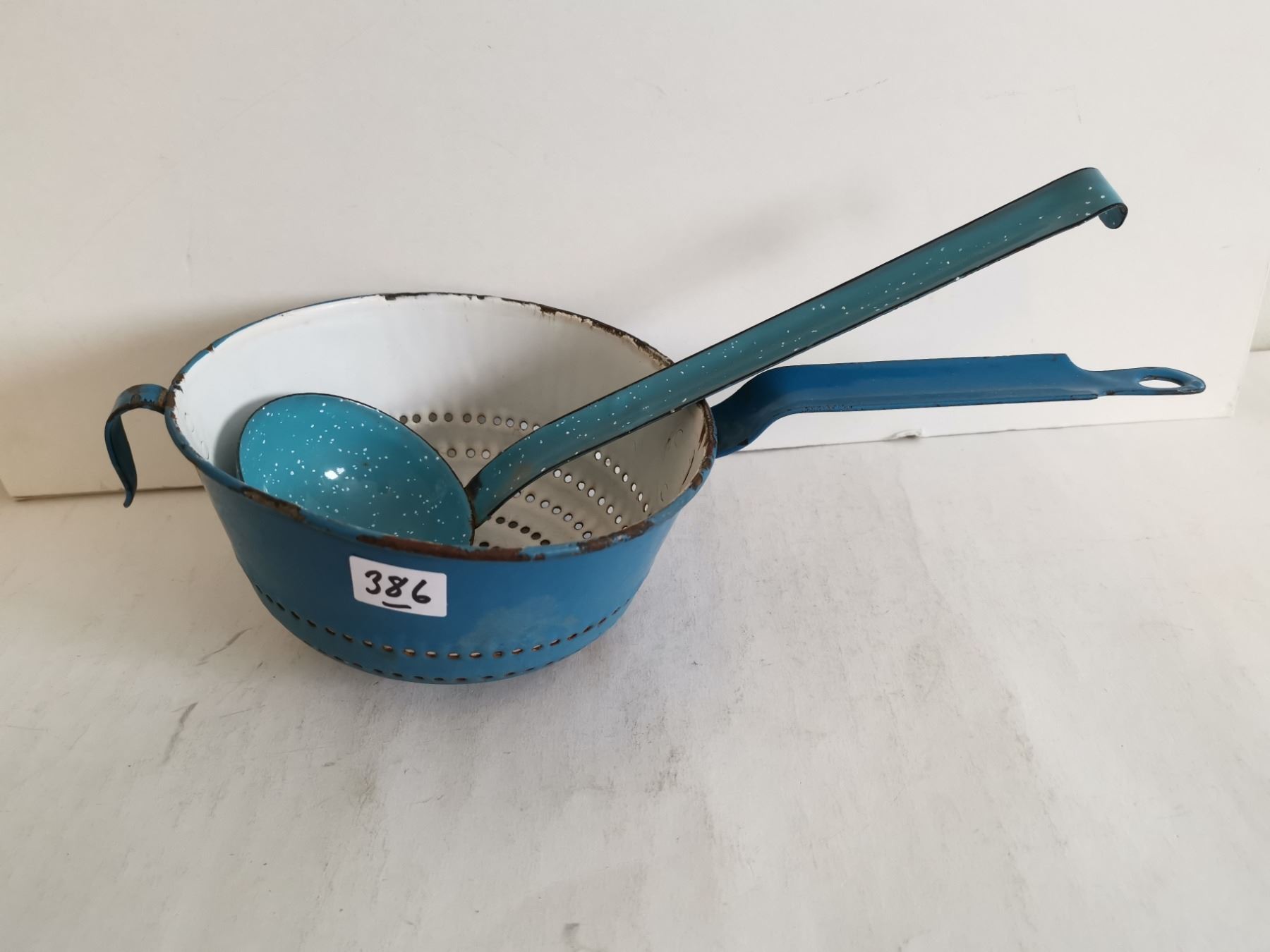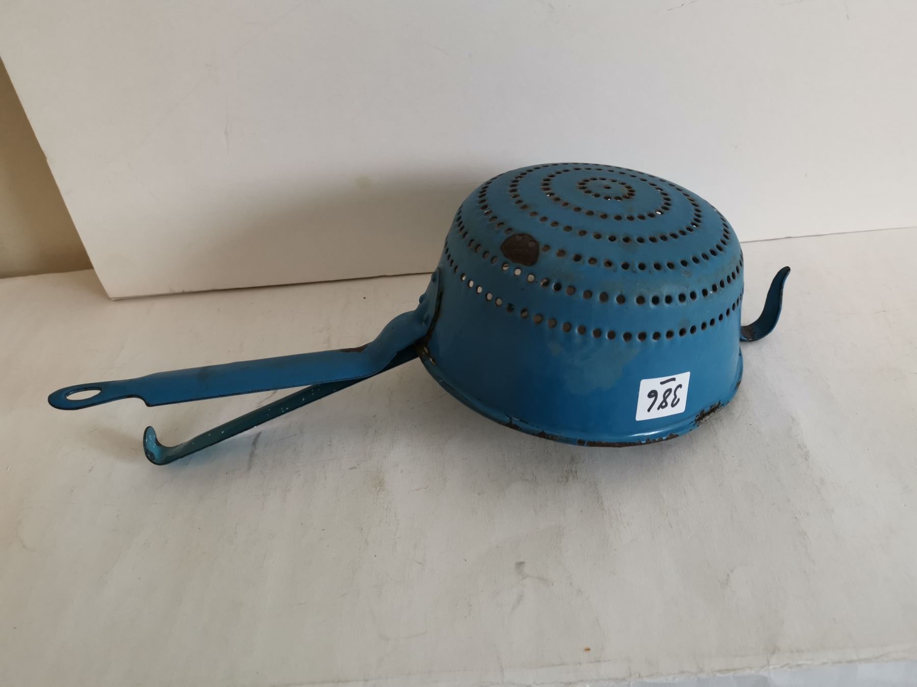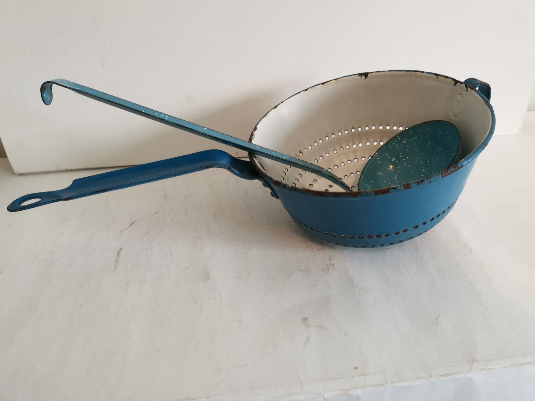 Vintage Blue Enamel Strainer & Blue Speckled Enamelware Strainer