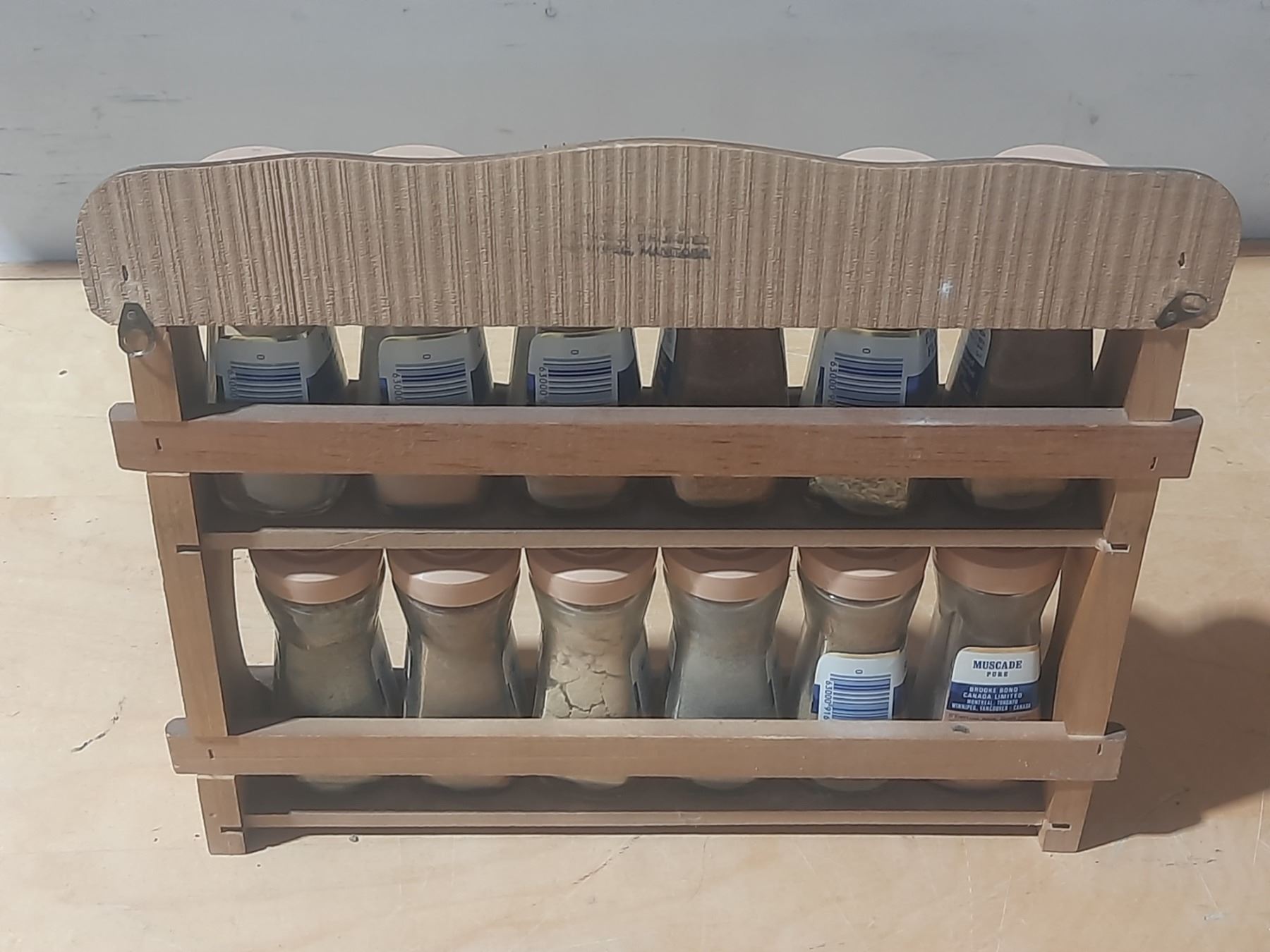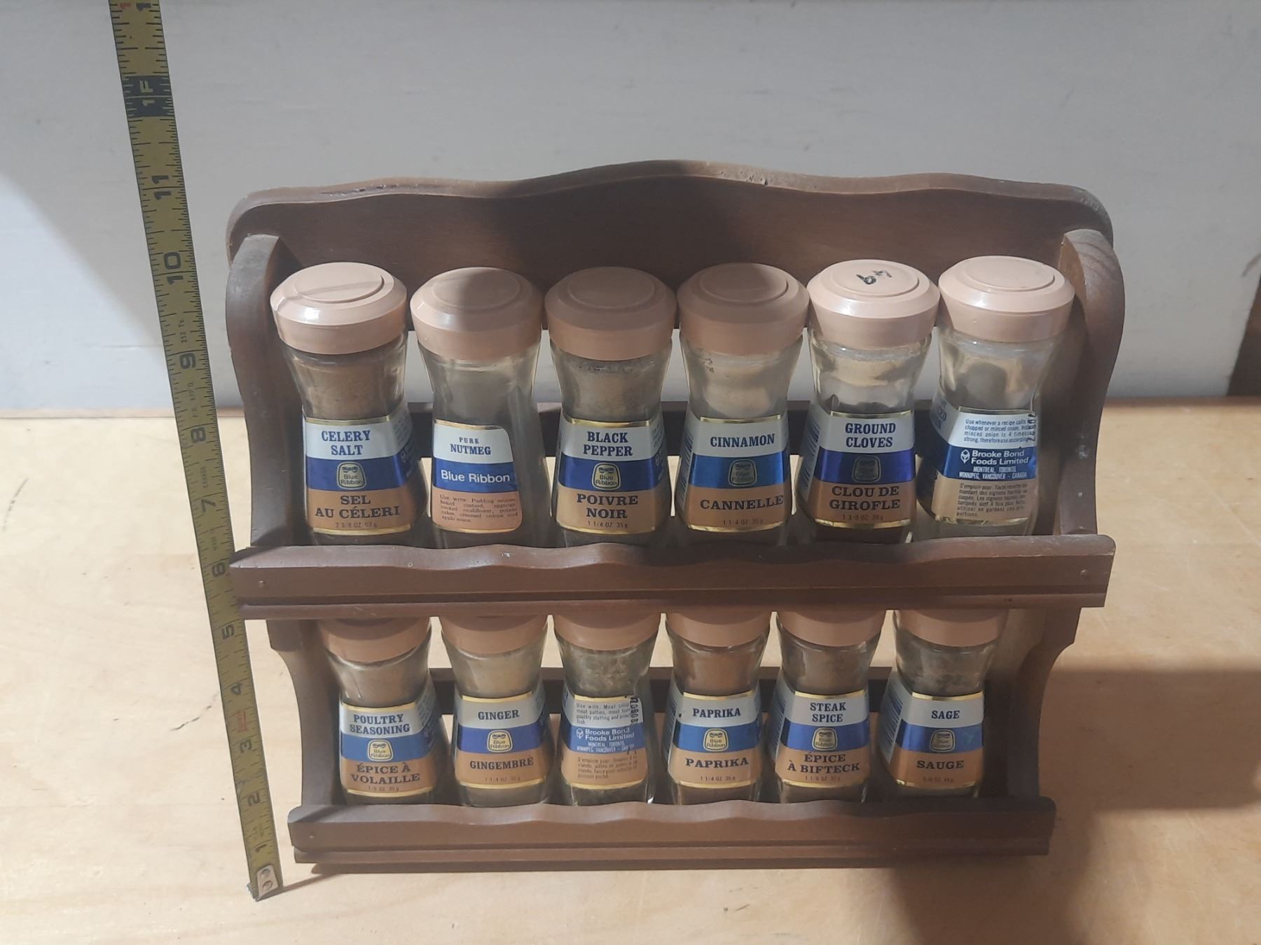 Vintage Blue Ribbon wooden spice rack featuring 12 glass spice jars with spice. (One is Empty)