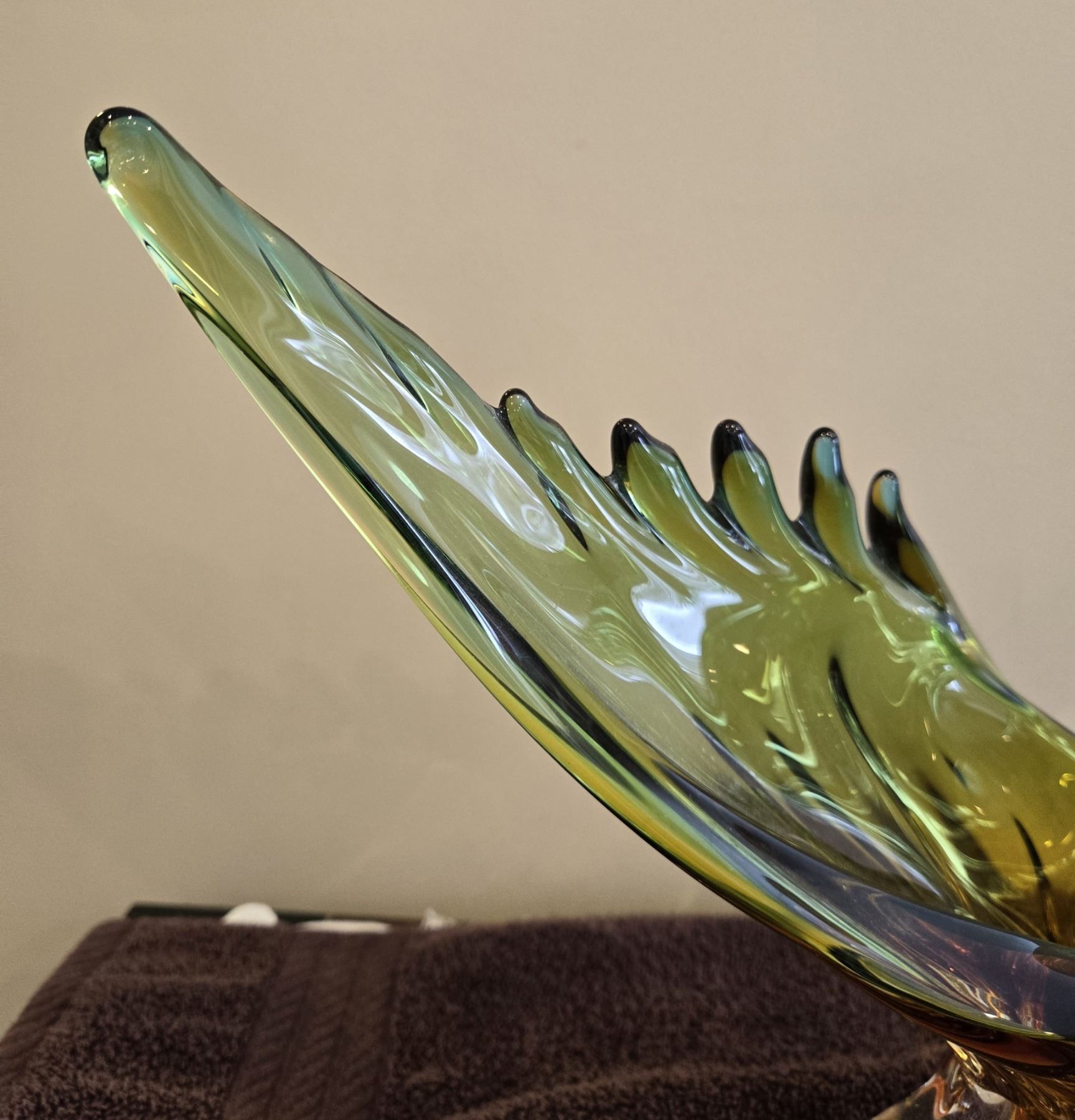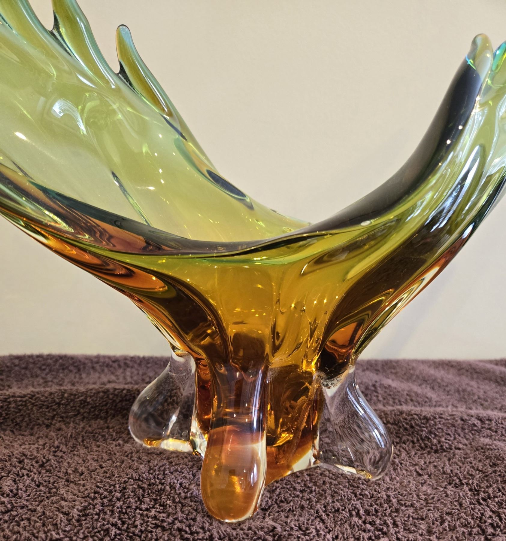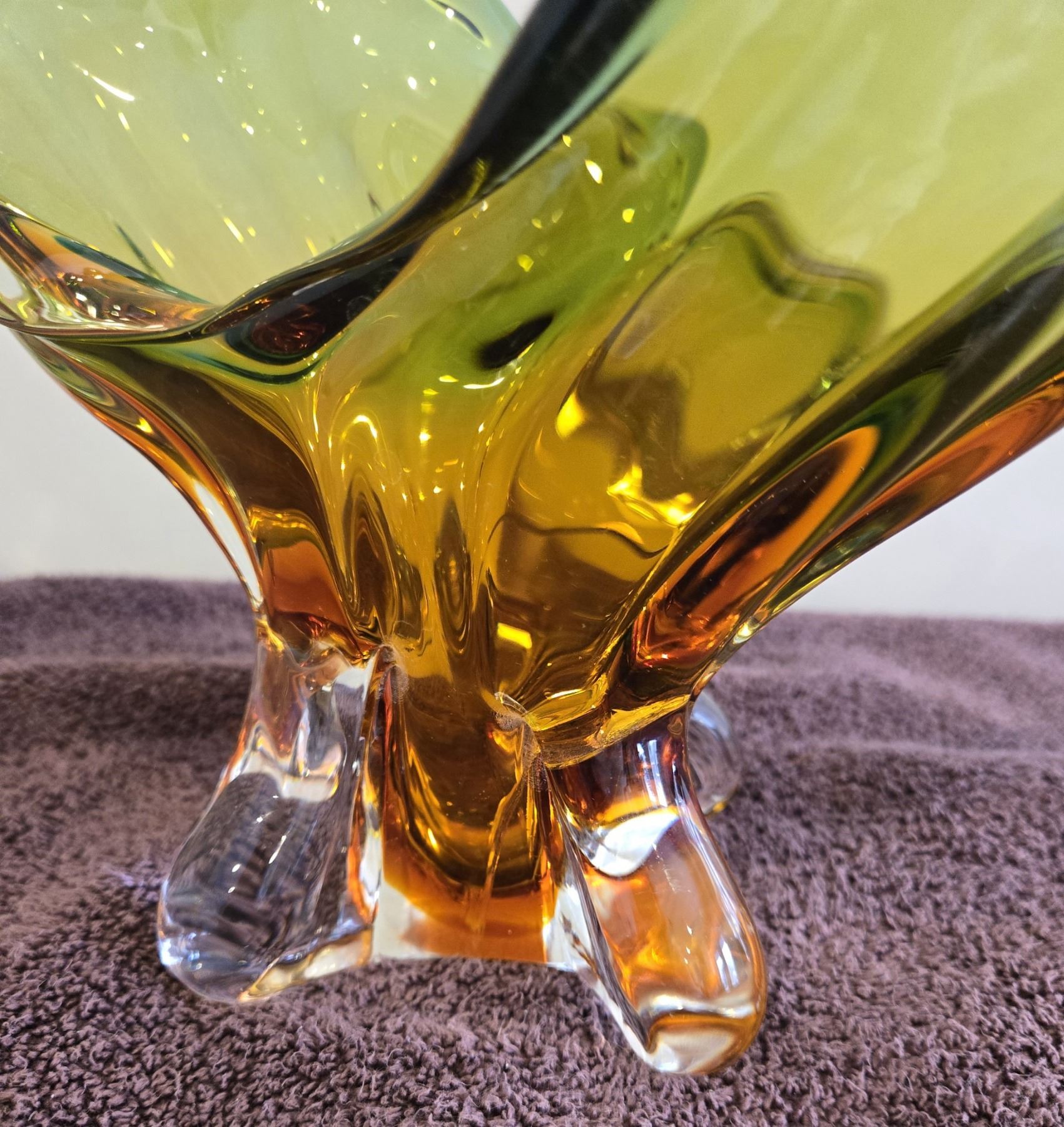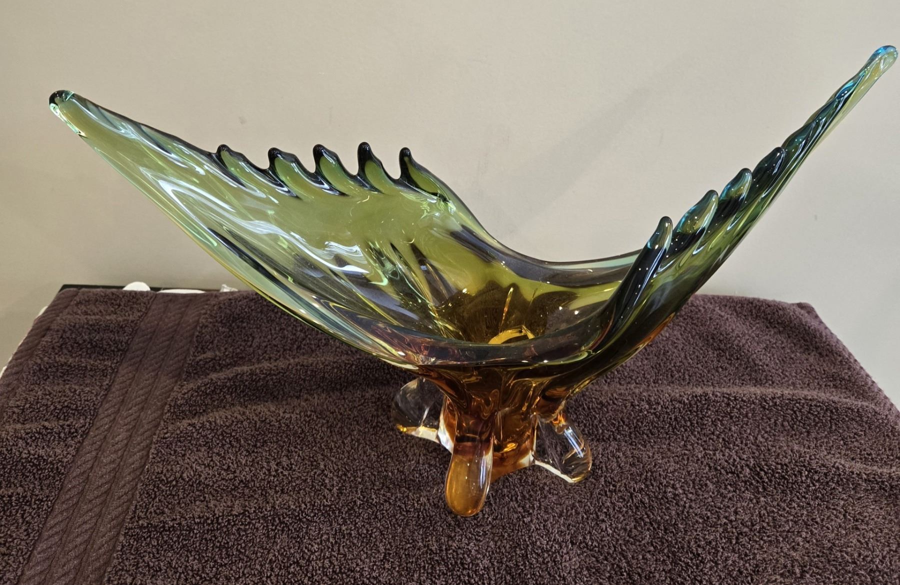 Vintage Chalet Lorraine art glass bowl. Green/amber color. 18" across. 11" high. crack going through it. beautiful color