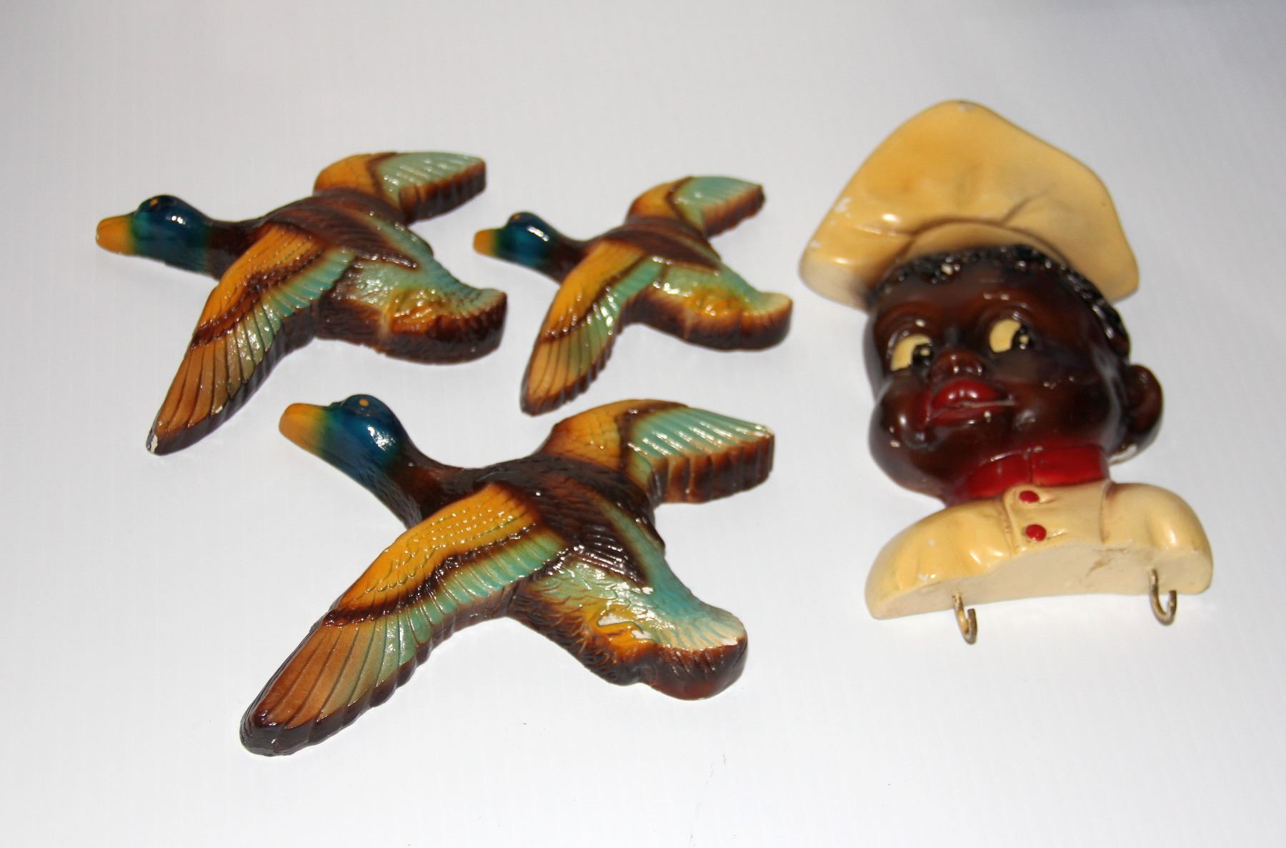 Vintage Chalkware, Set of 3 Mallard Ducks and Black Mamie