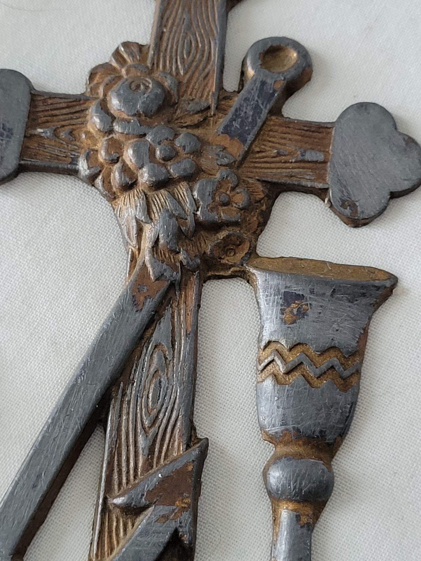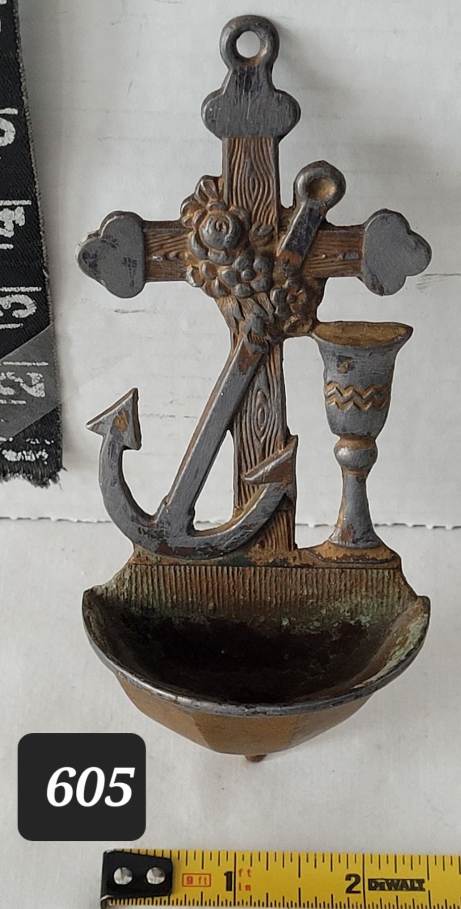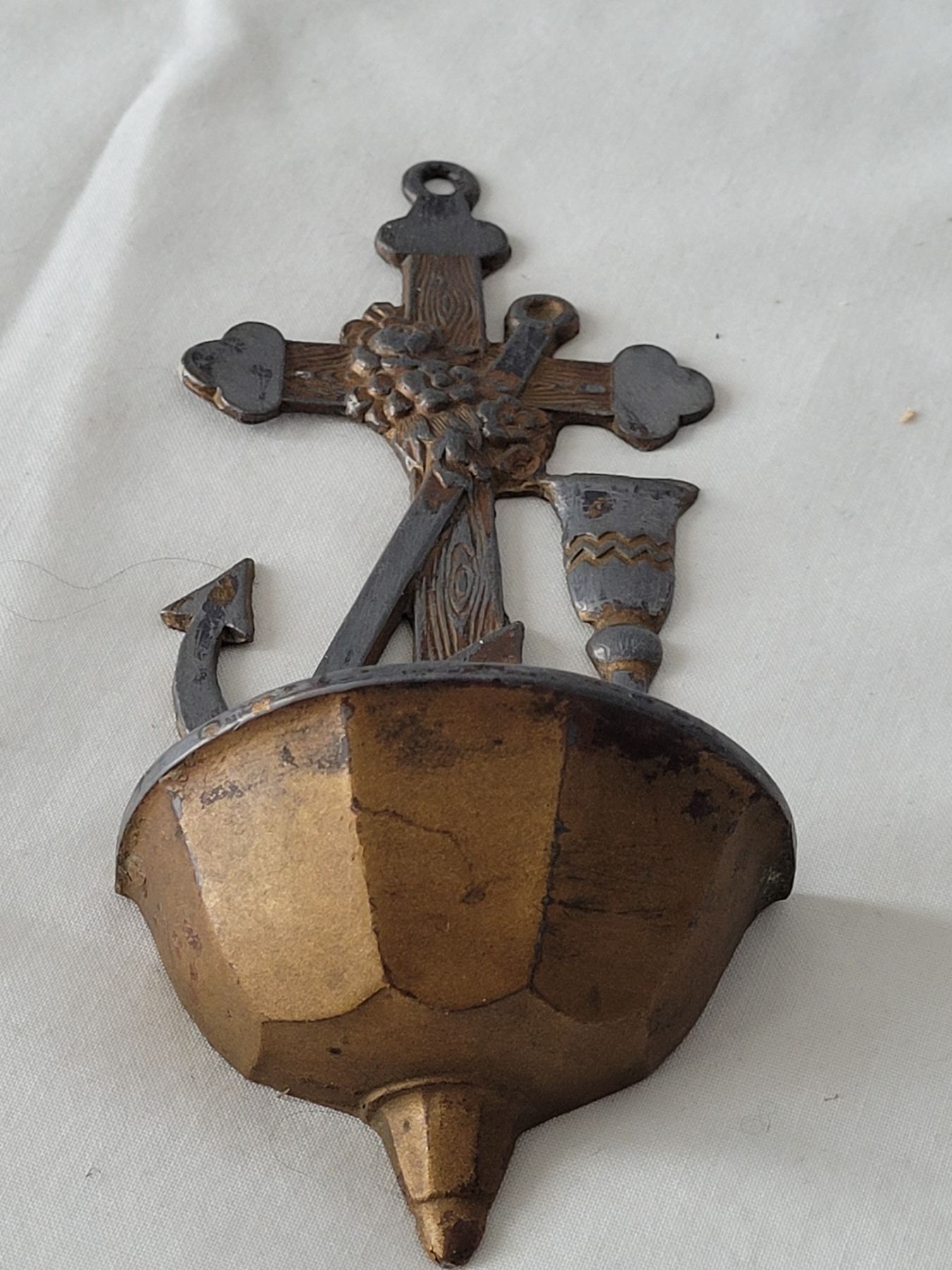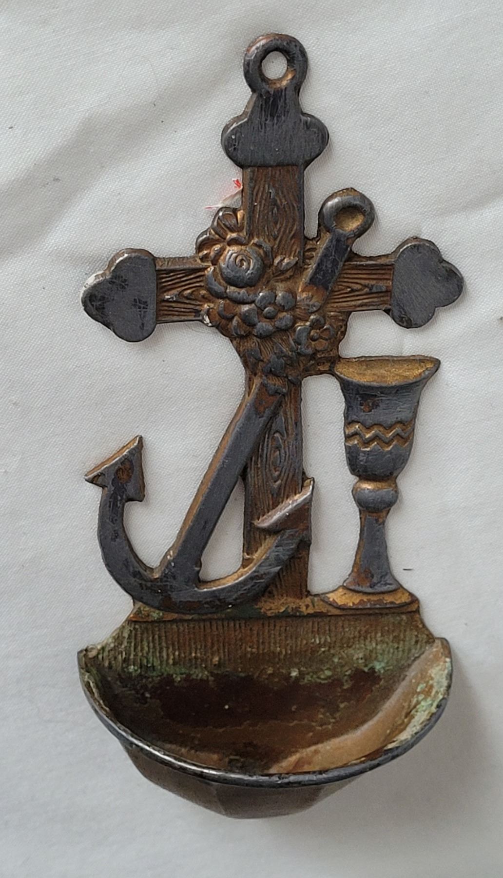 Vintage Christian Holy water stoup. Metal, wall mounted, cross, anchor & chalice. Made in Japan.