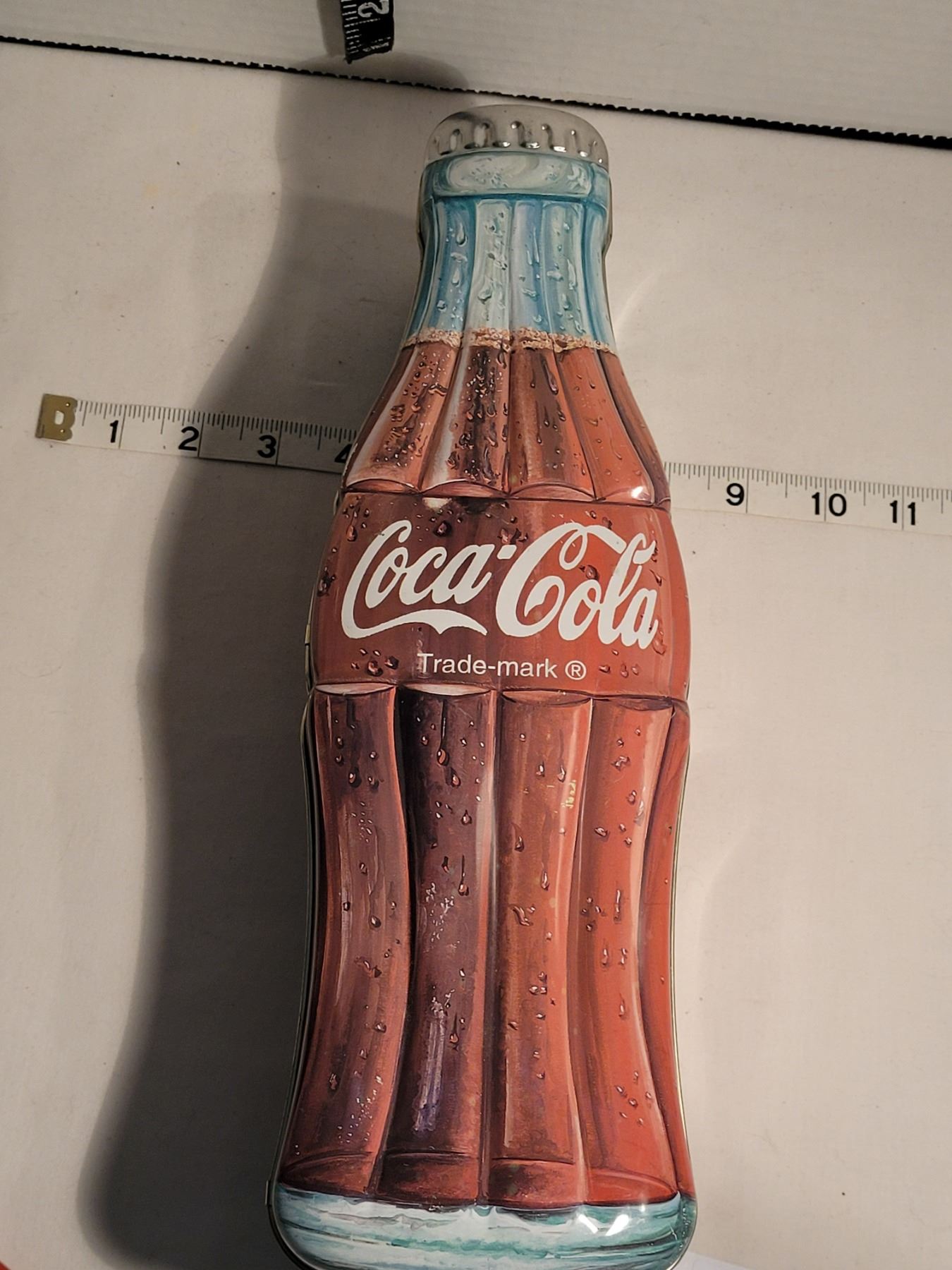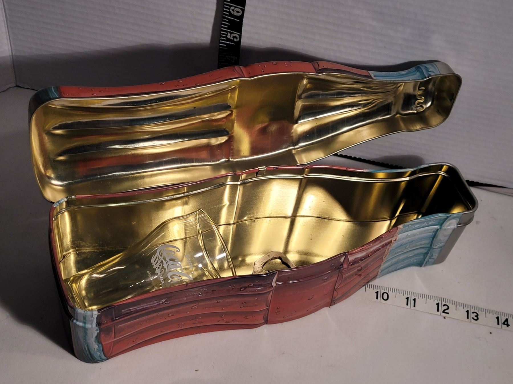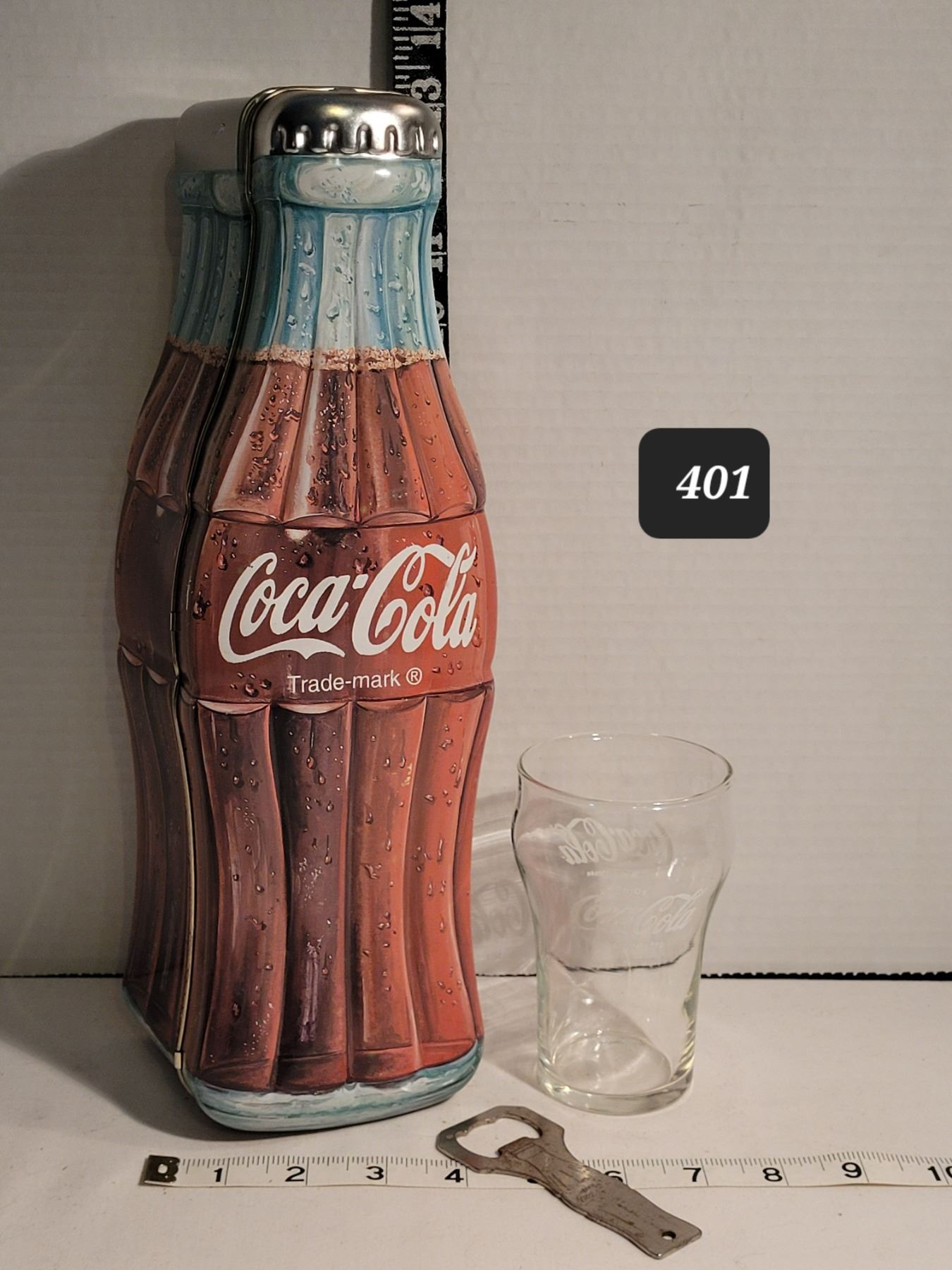 Vintage Coca-Cola glass & bottle opener in a bottle shaped tin.