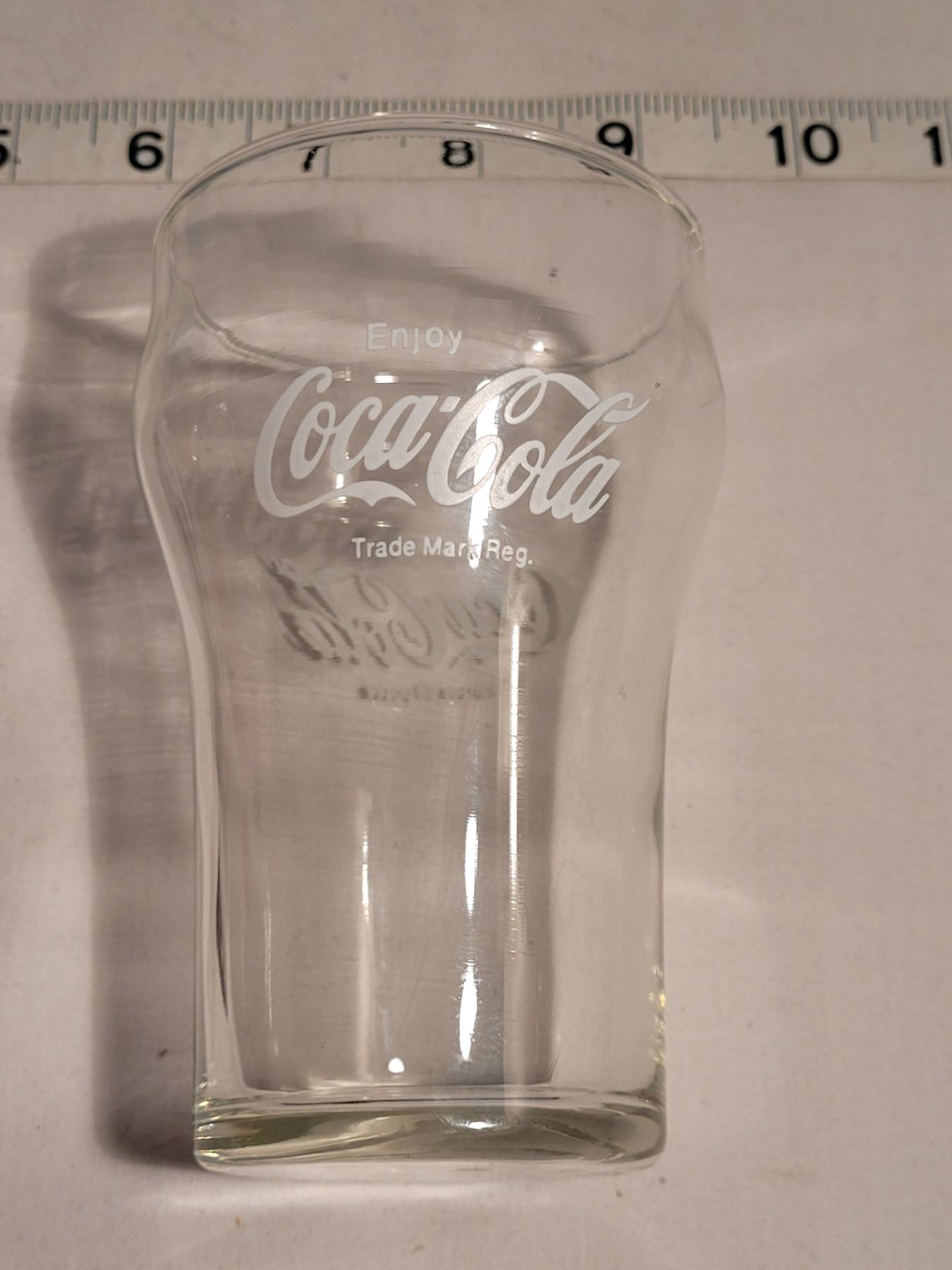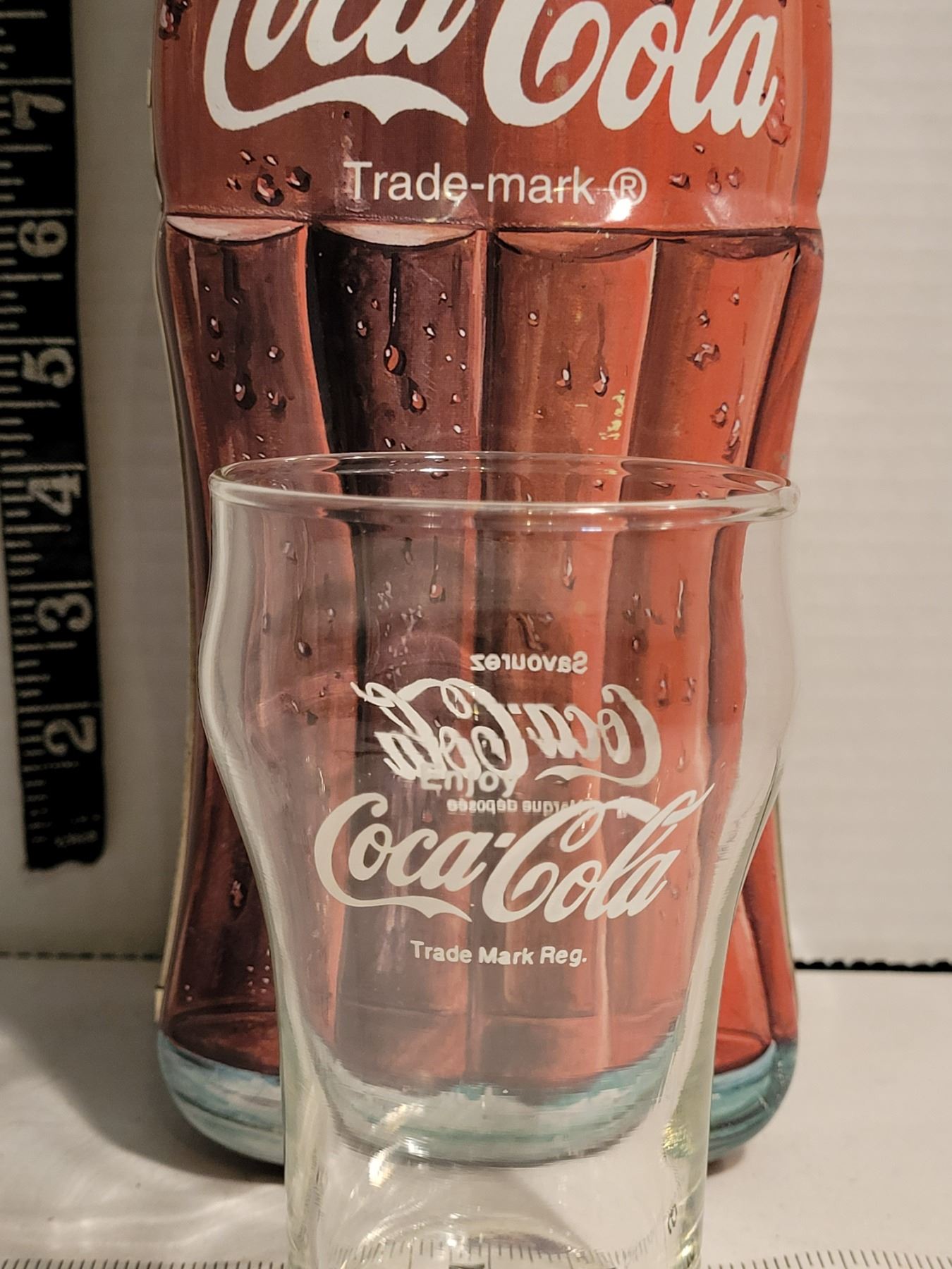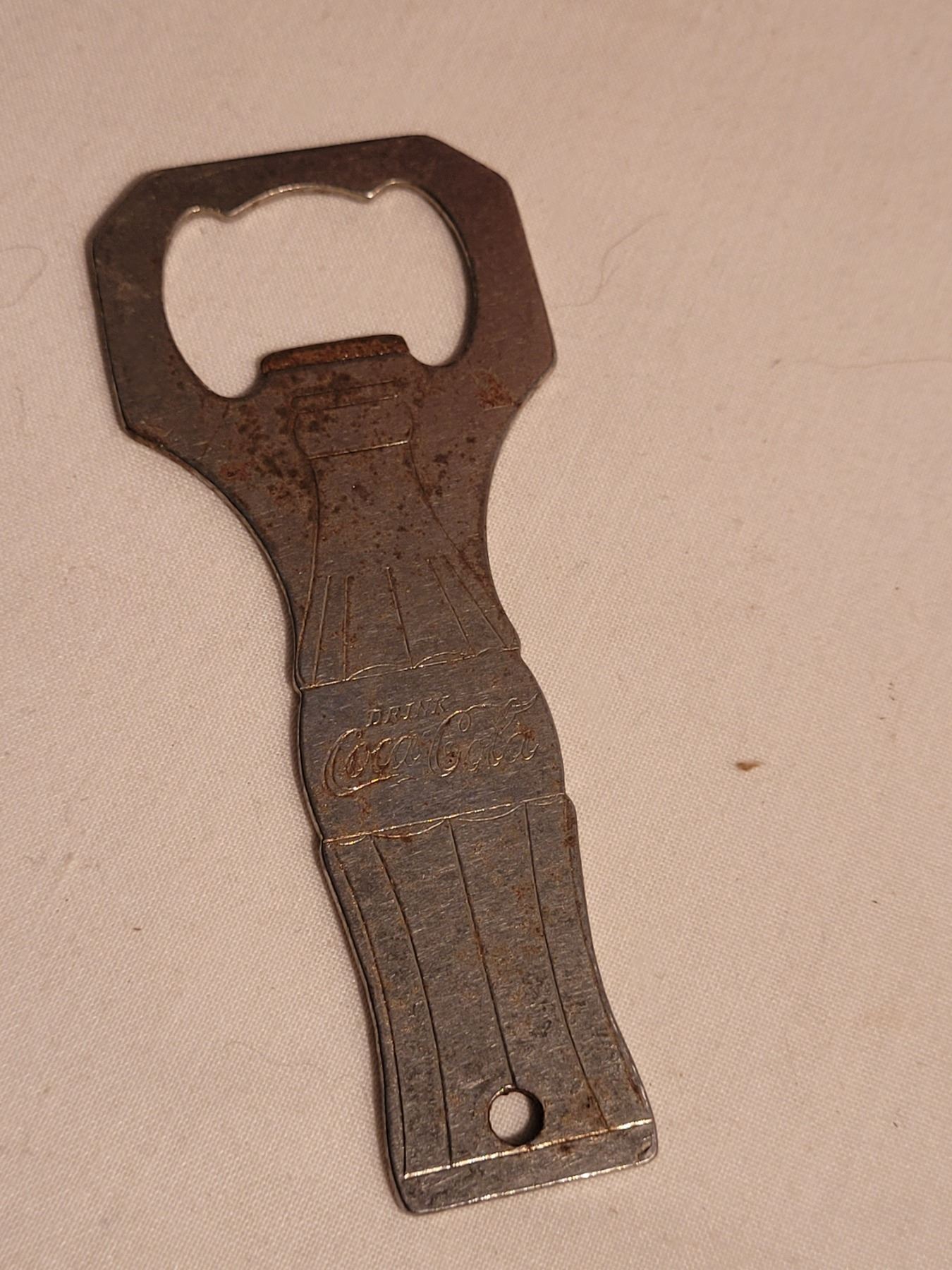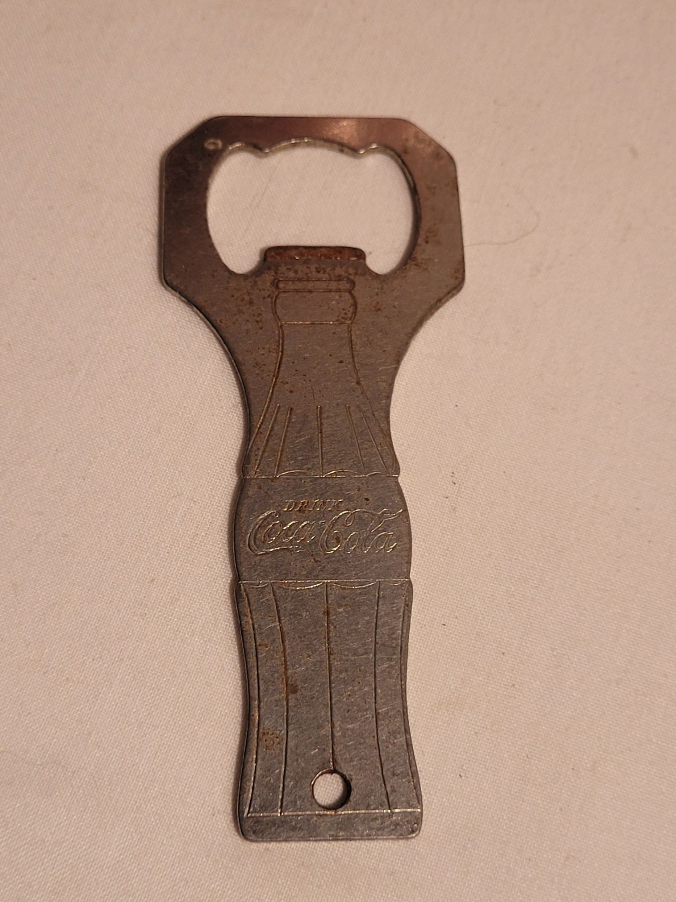 Vintage Coca-Cola glass & bottle opener in a bottle shaped tin.