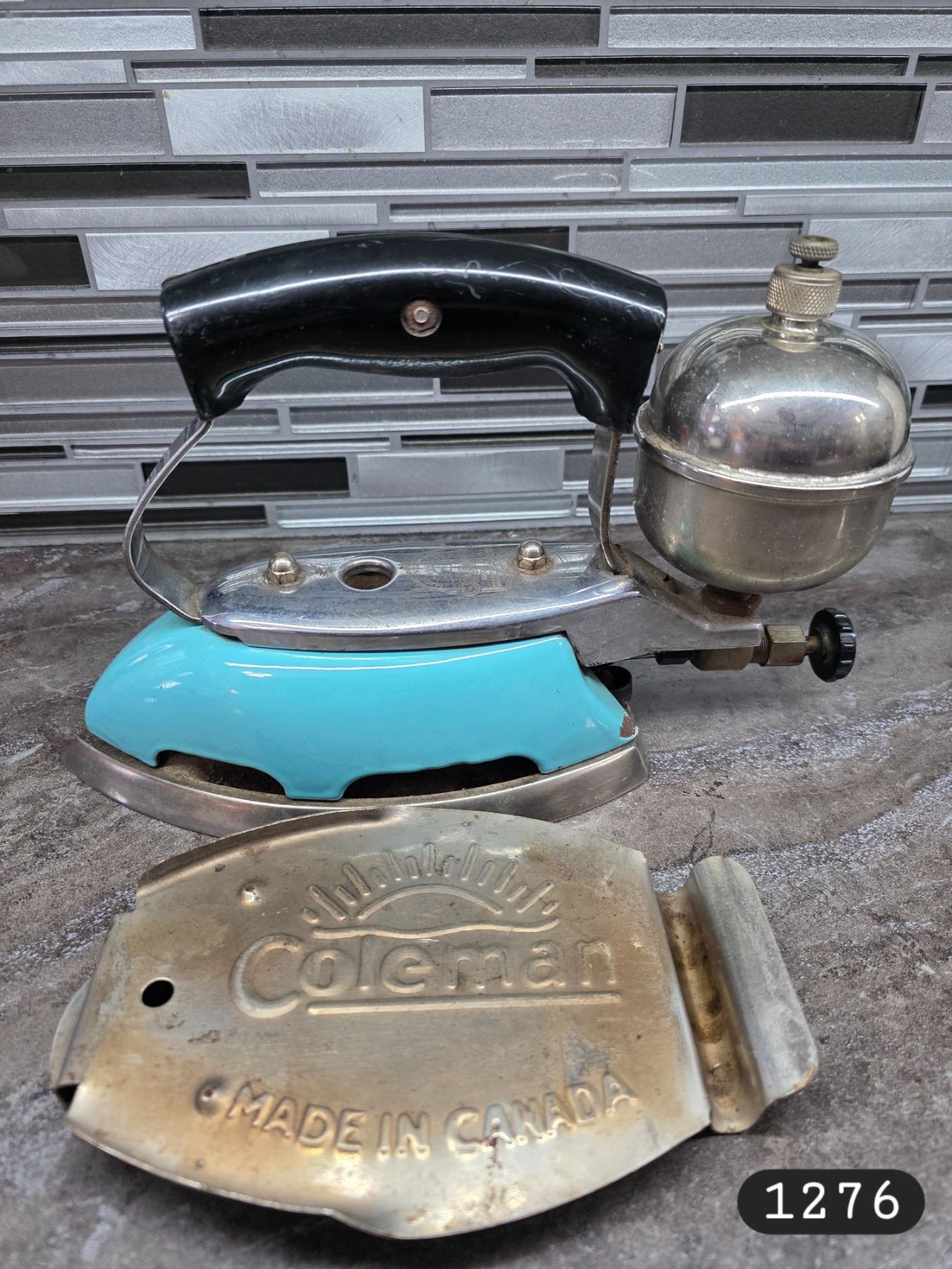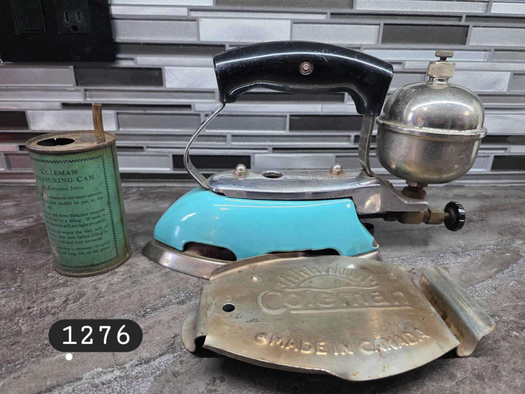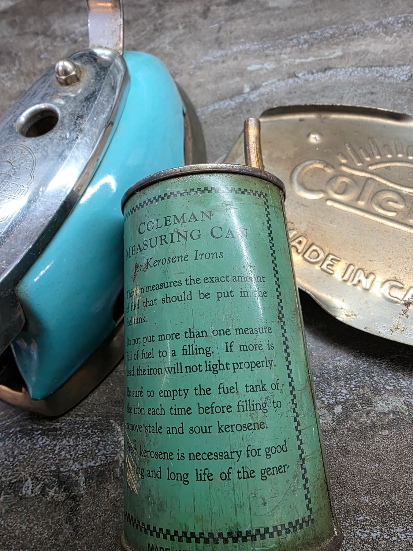 Vintage Coleman Model #11 Kerosine Clothes Iron w/ Stand, Coleman Measuring Can