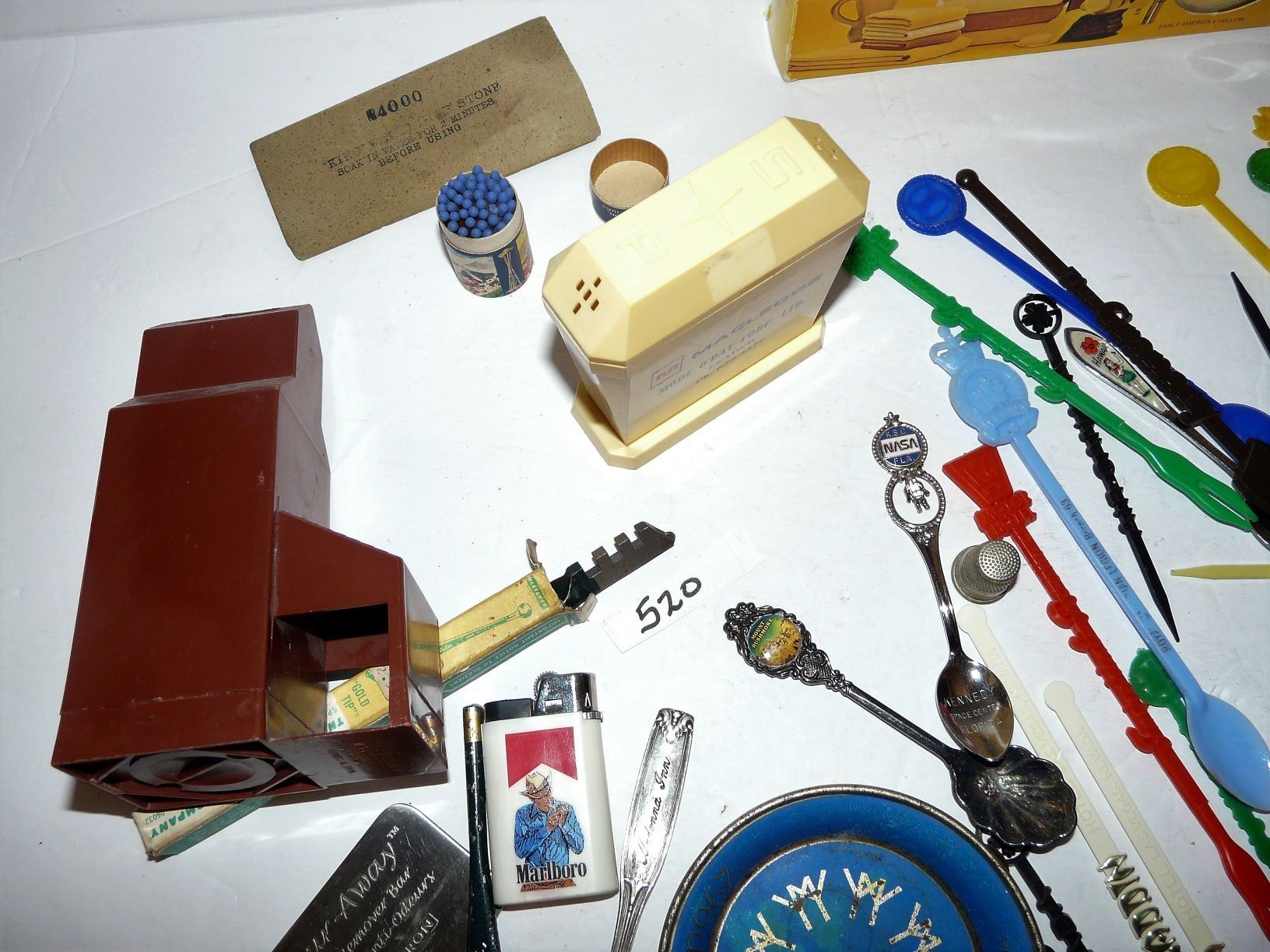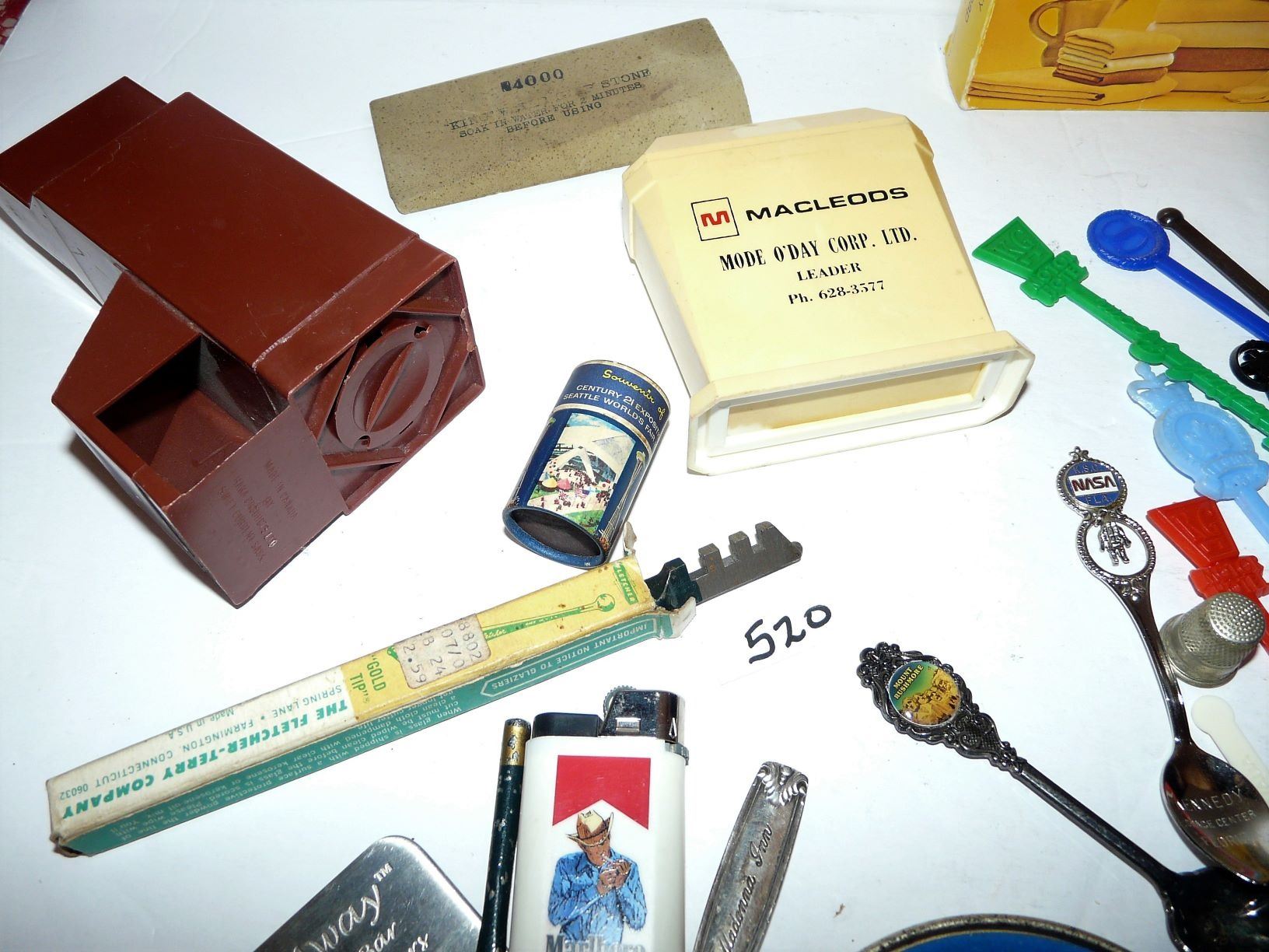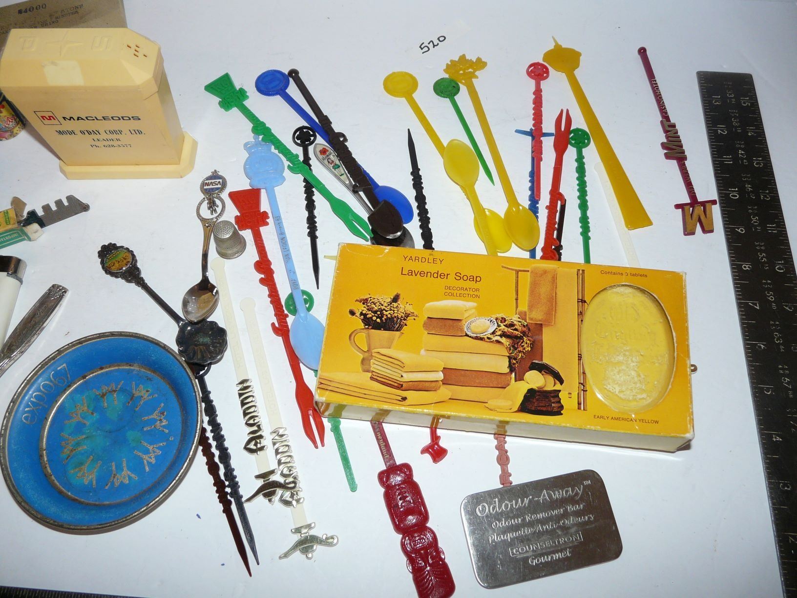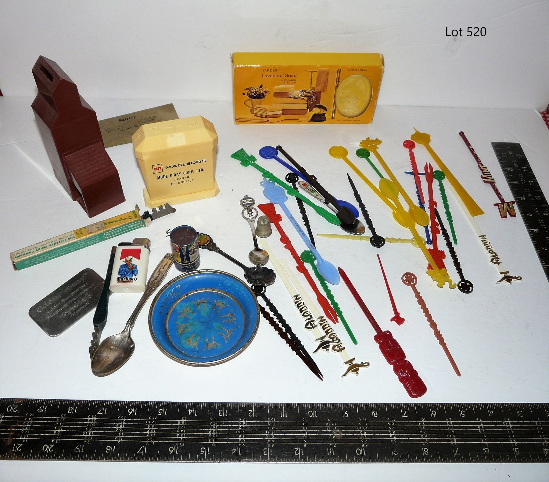 Vintage Elevator Piggy Bank, MacLeods Store Salt & Pepper, Expo Dish, Soap, Stir Sticks, Etc.