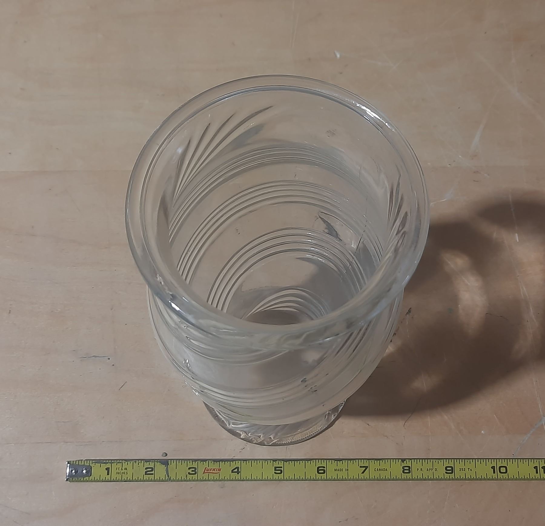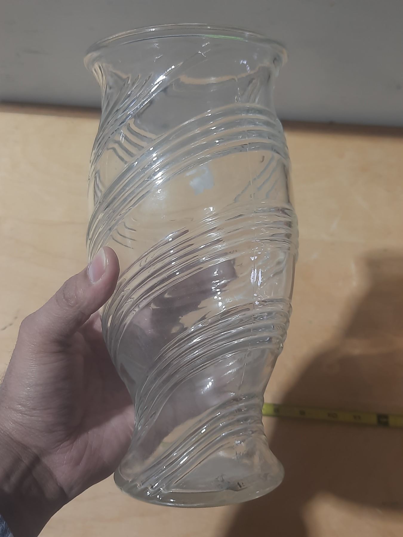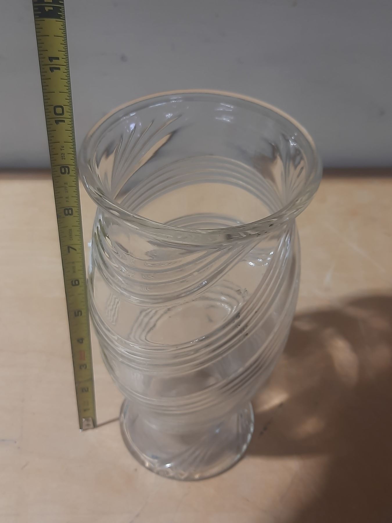 Vintage FTD clear glass vase featuring a spiral or swirl pattern.