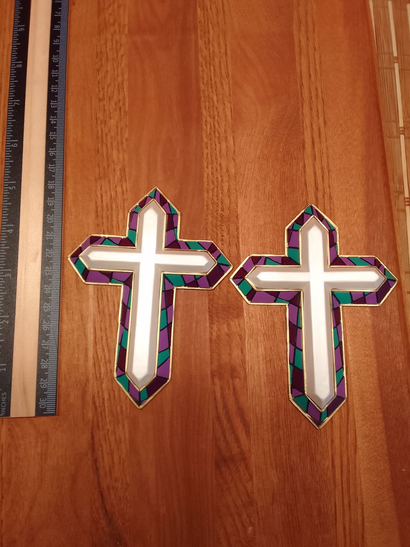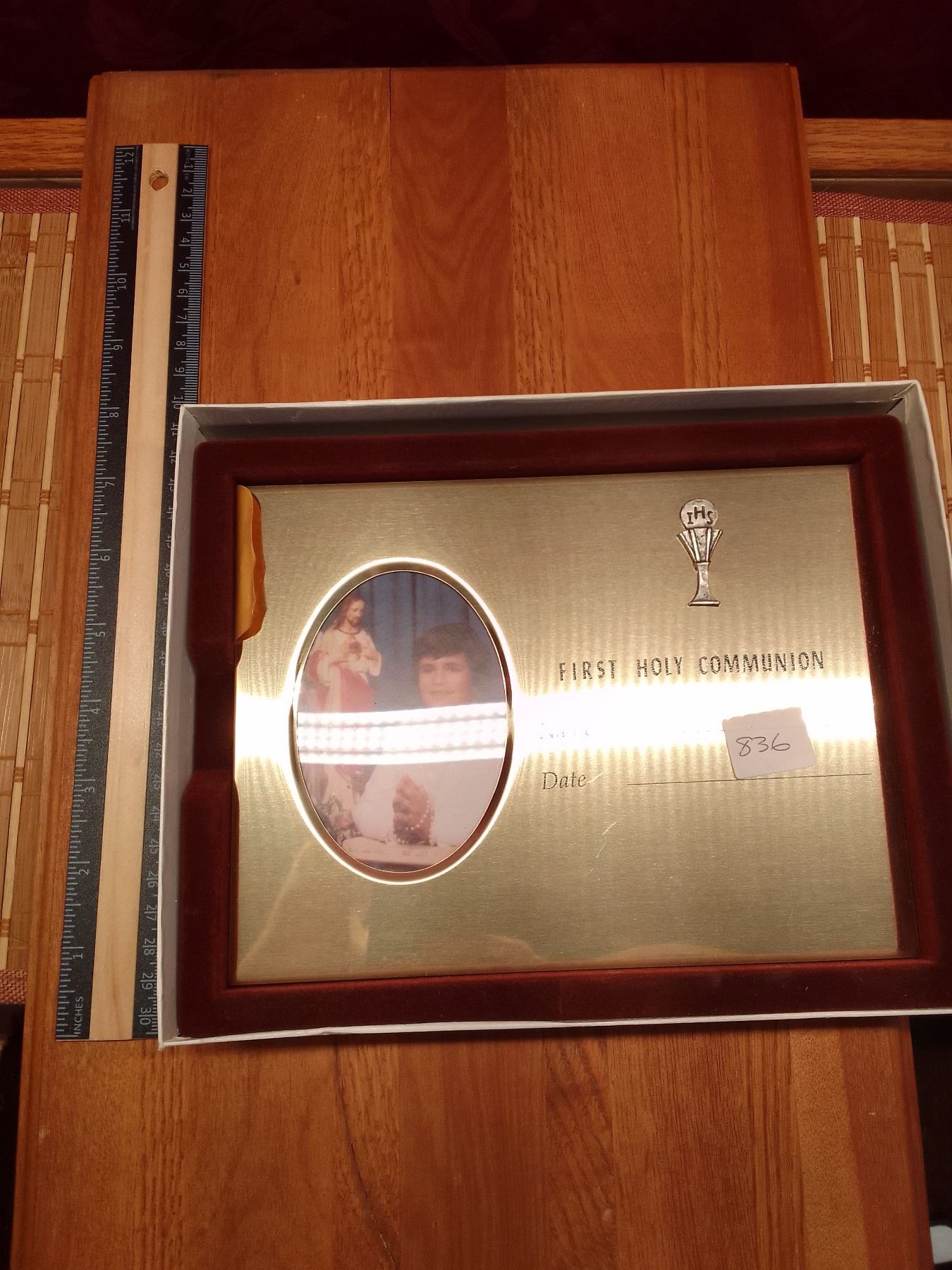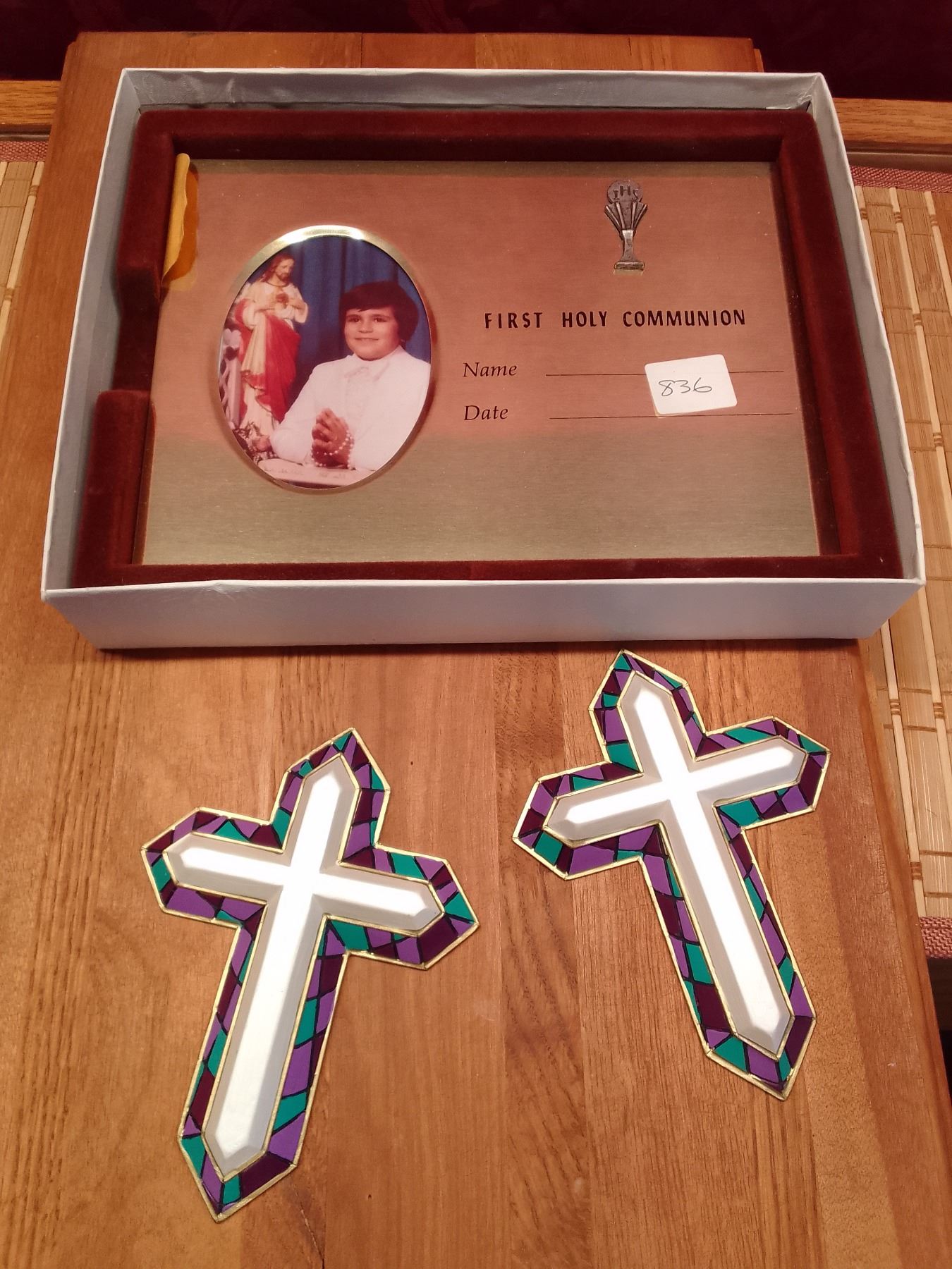 Vintage First Holy Communion Frame & Two Decorative Crosses- Framed First Holy Communion certificate with photo holder and chalice emblem, plus two colorful stained-glass style cross ornaments. Ideal religious keepsakes.