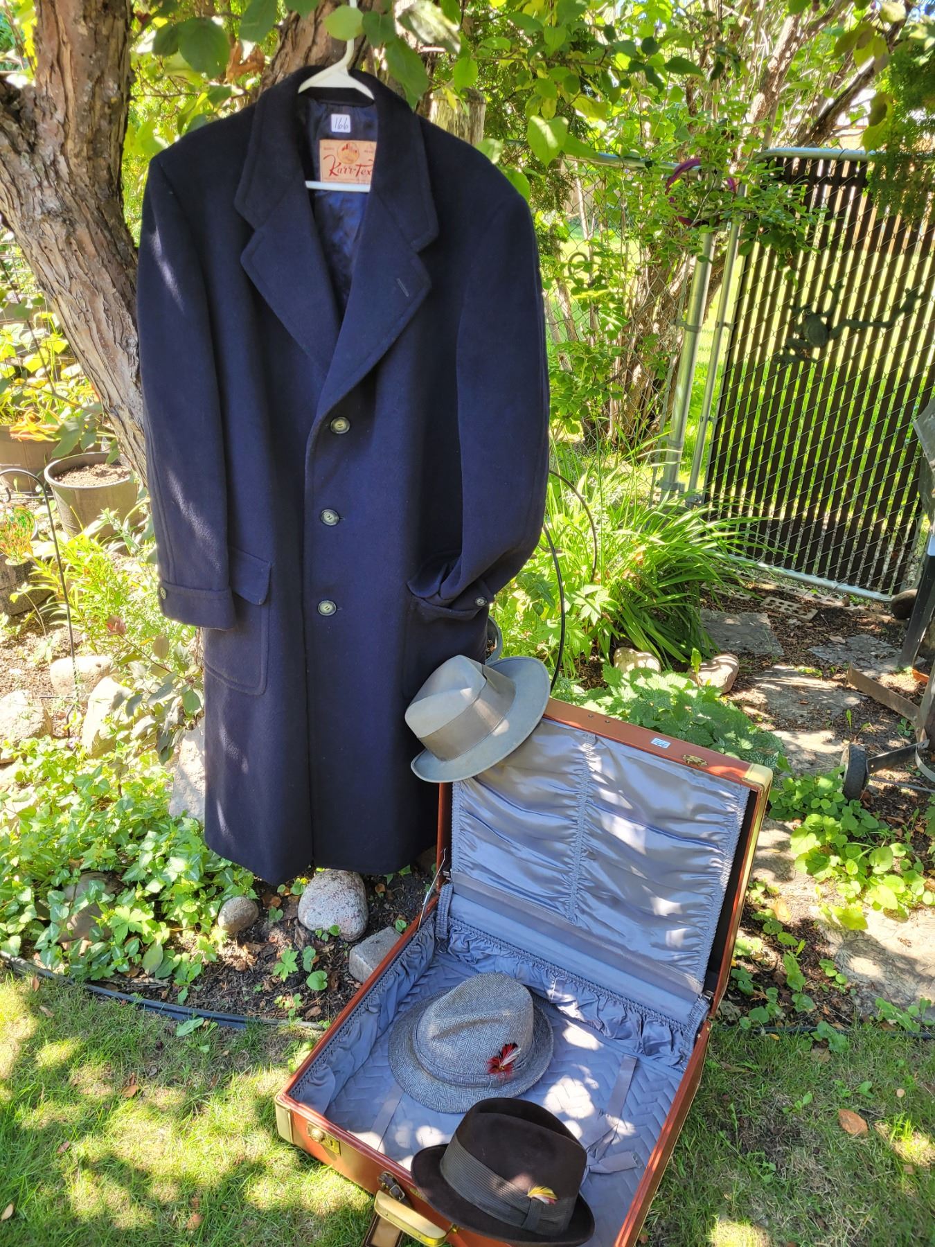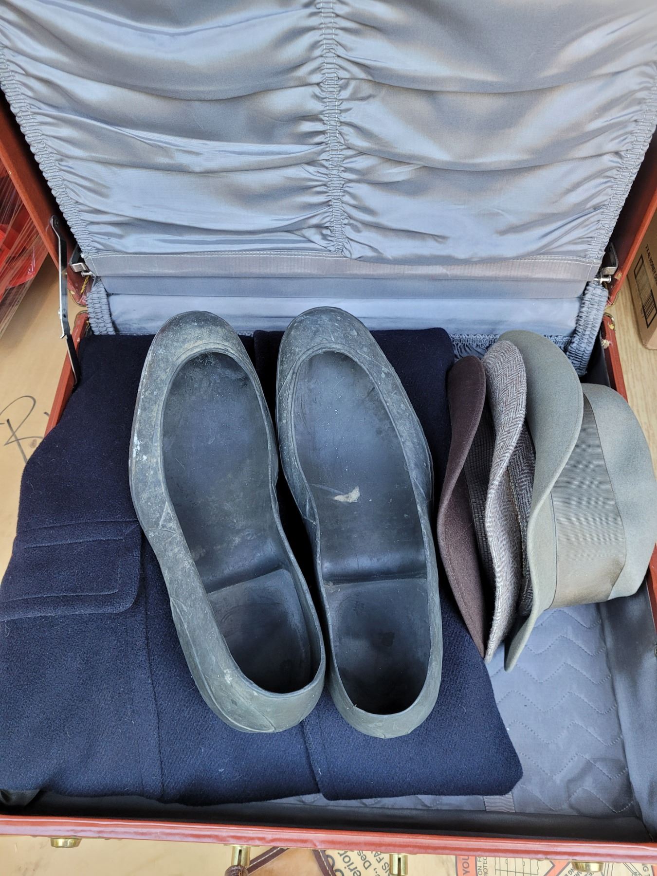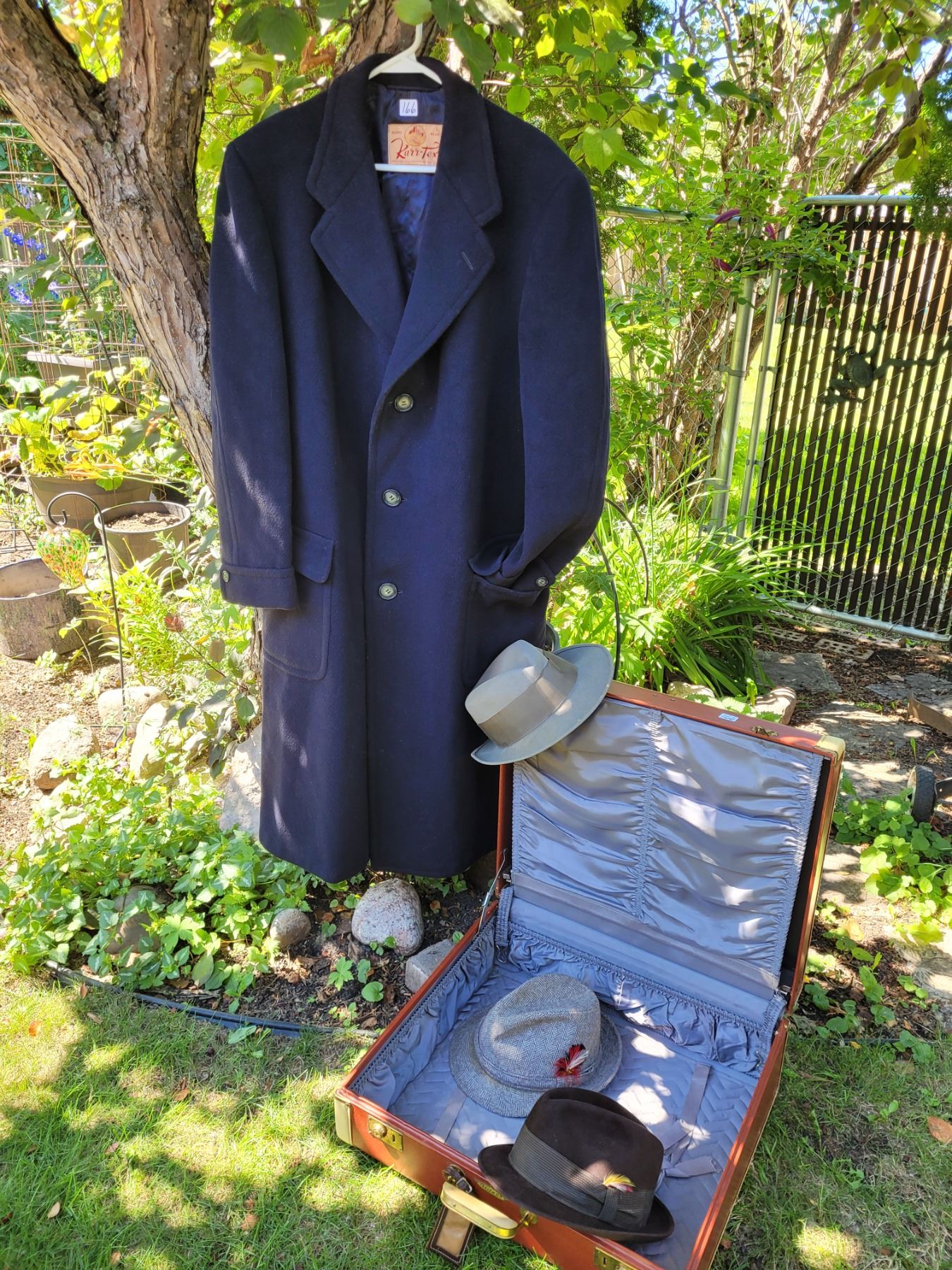 Vintage Flite hard suitcase & contents, Excellent condition. Vintage Kar-Tex dress coat, Midway, Biltmore & Adam hats, + toe rubbers.