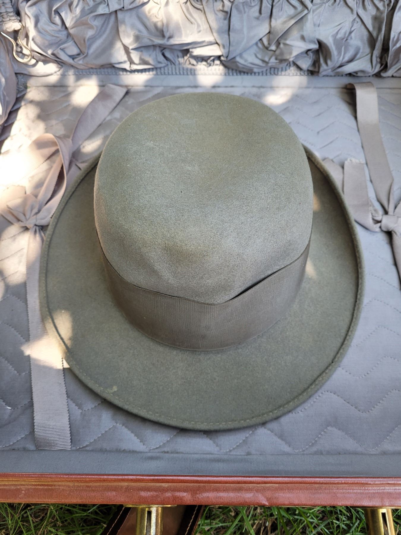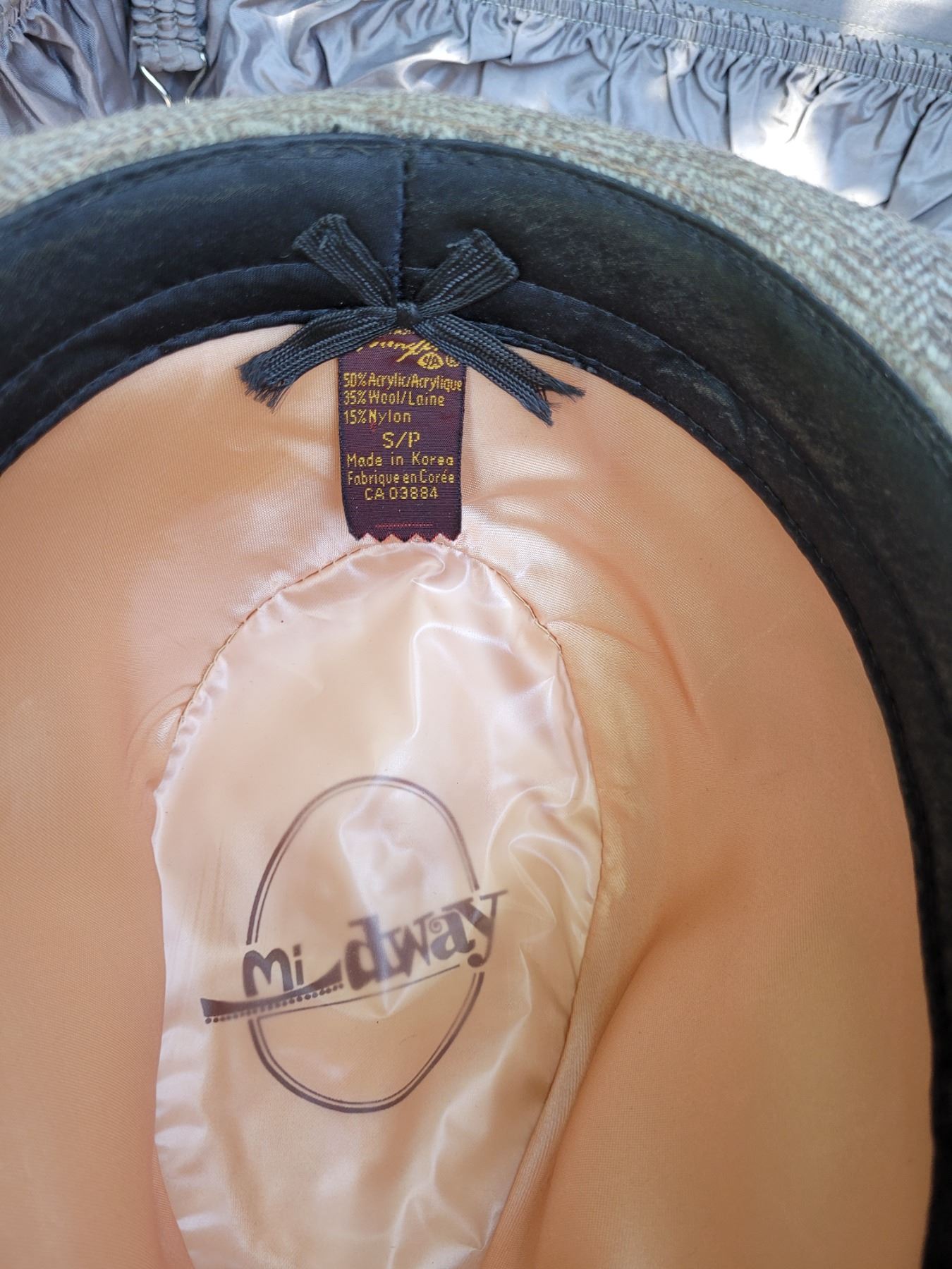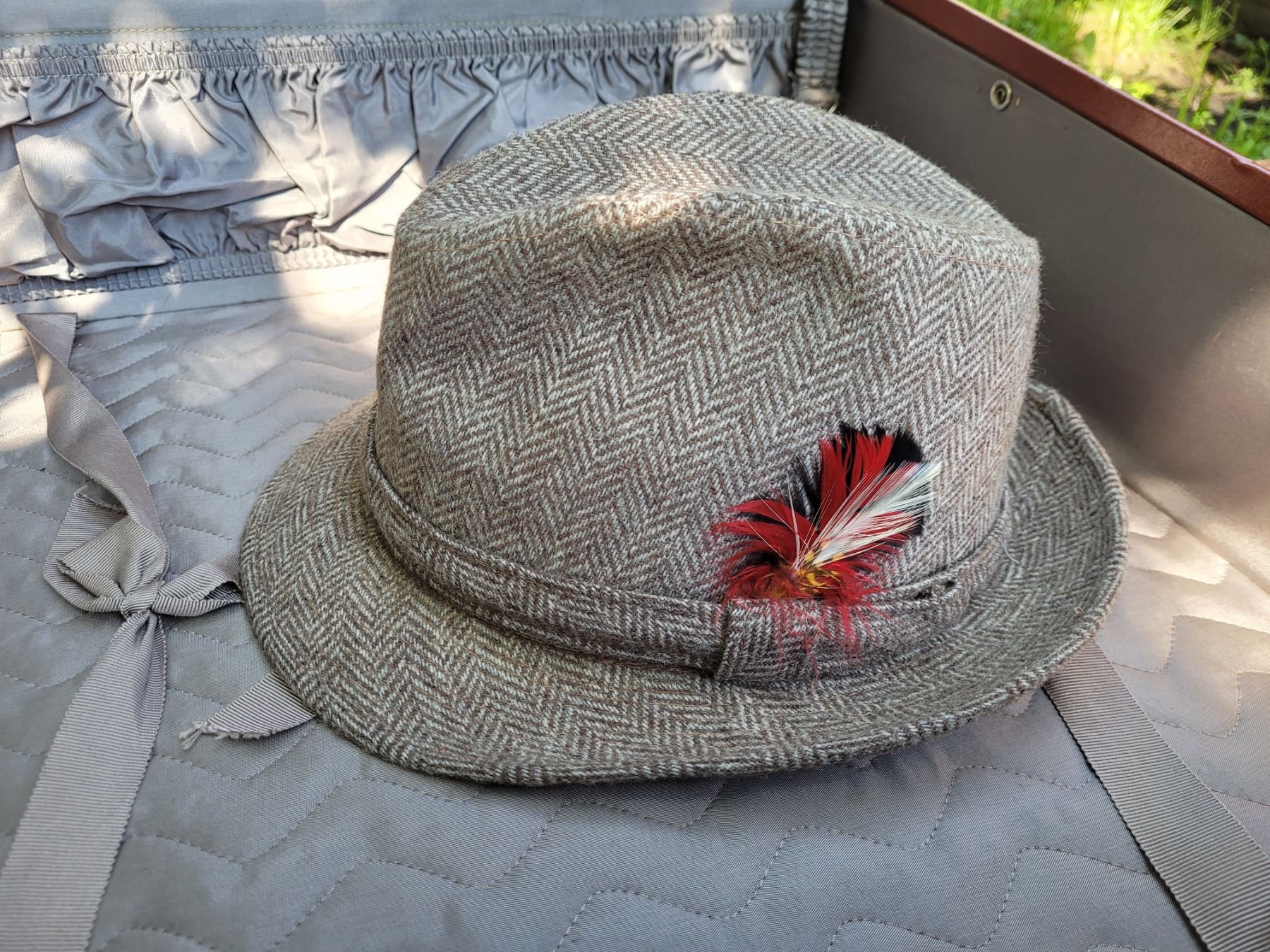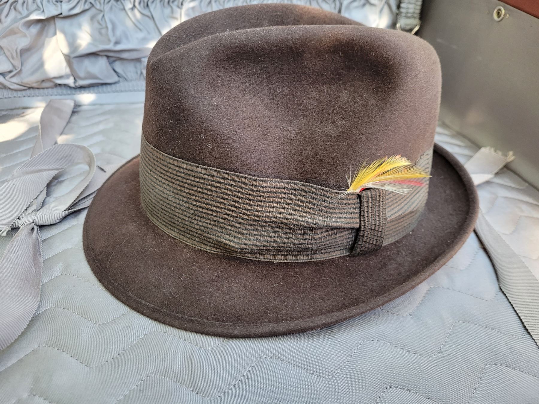 Vintage Flite hard suitcase & contents, Excellent condition. Vintage Kar-Tex dress coat, Midway, Biltmore & Adam hats, + toe rubbers.