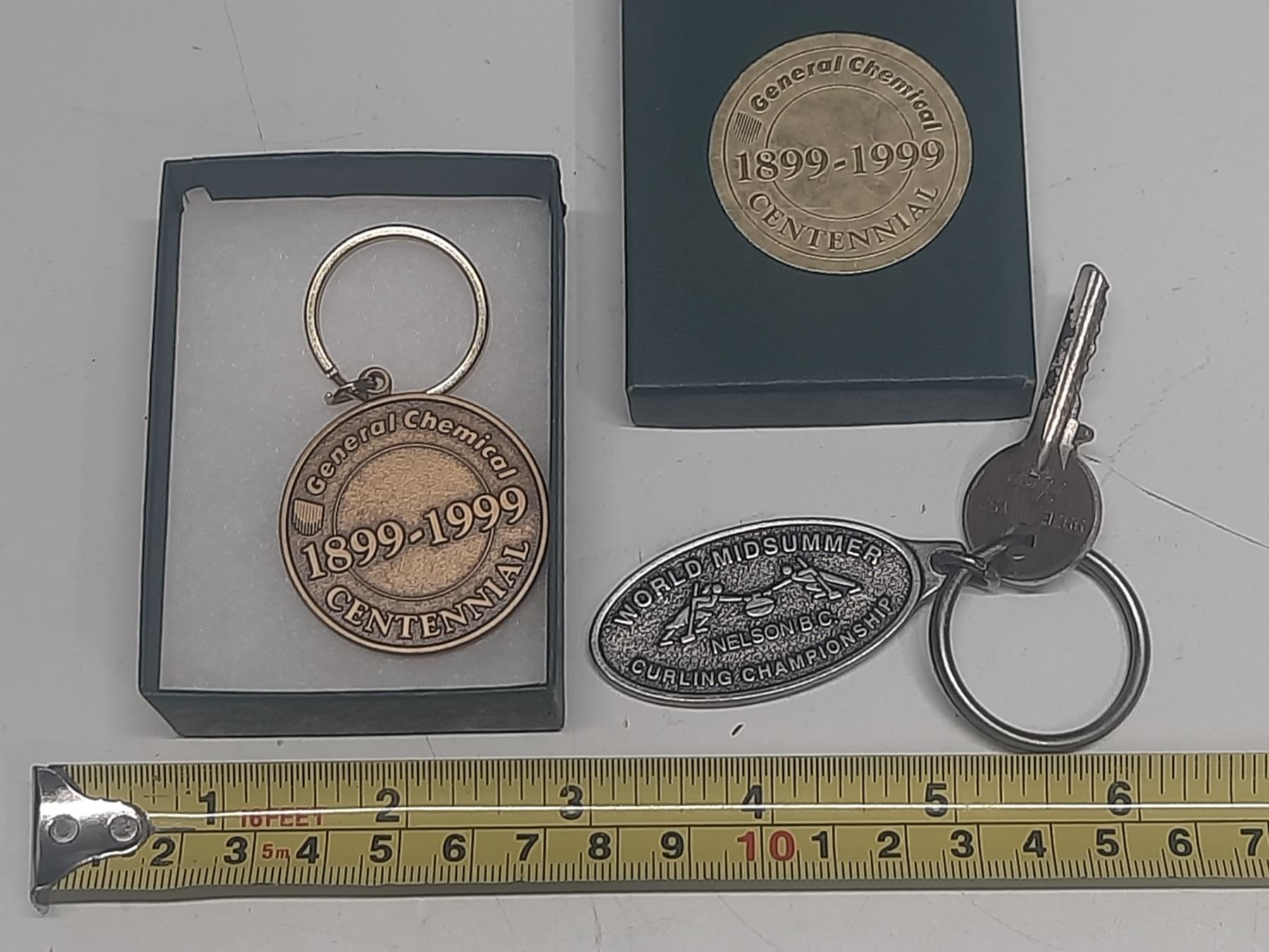 Vintage General Chemical Centennial Anniversary (1899-1999) and "World Midsummer Nelson B.C. Curling Championship" Keychain.
