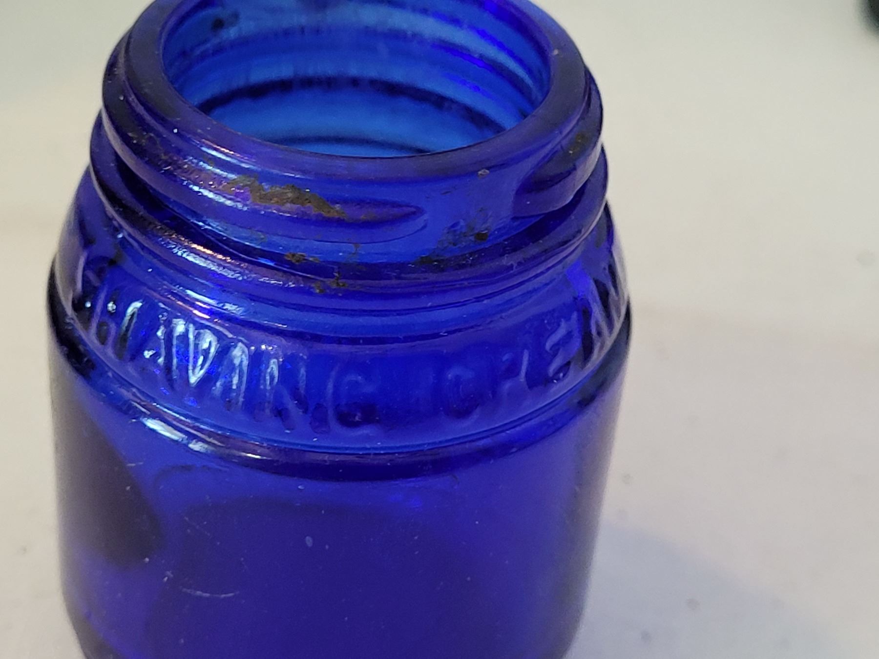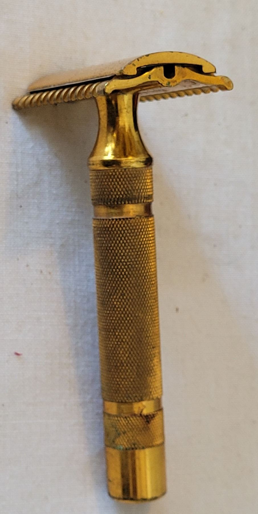 Vintage Gillette gold razor & blades. Old spice lather cup & brush, Cobalt blue shaving cream jar.
