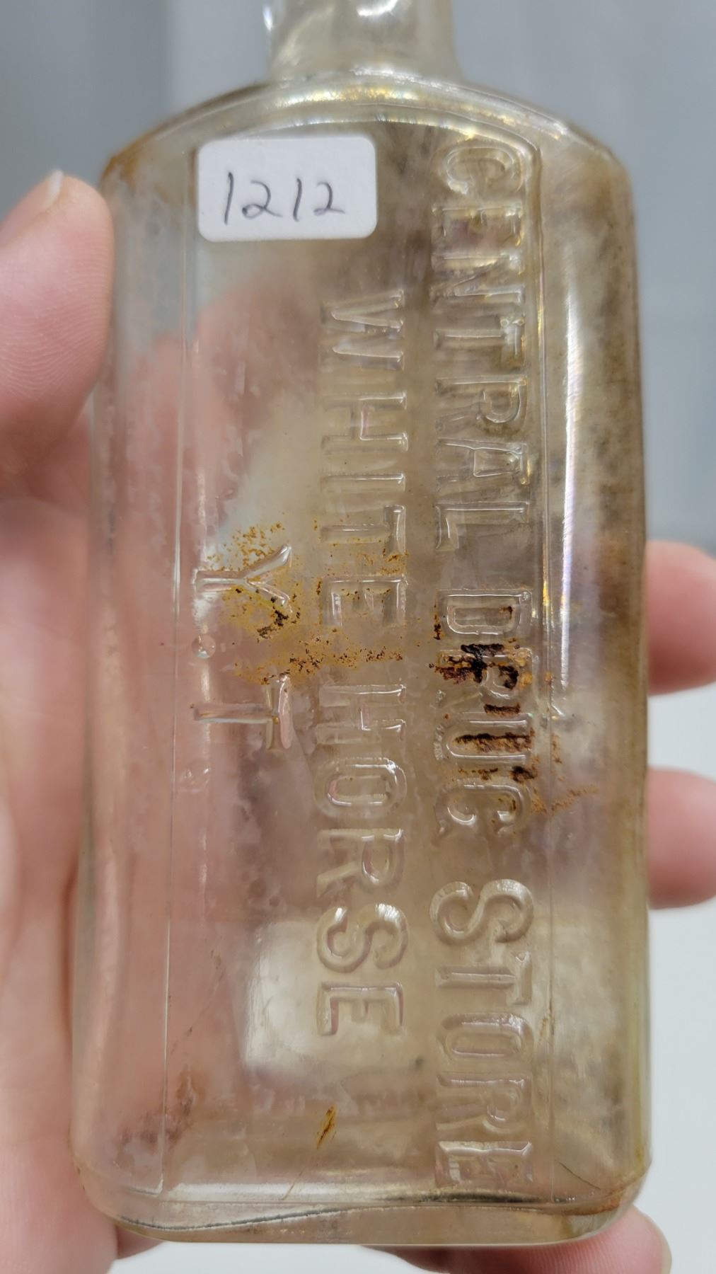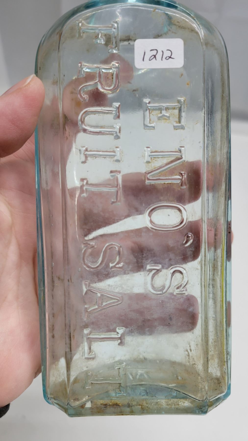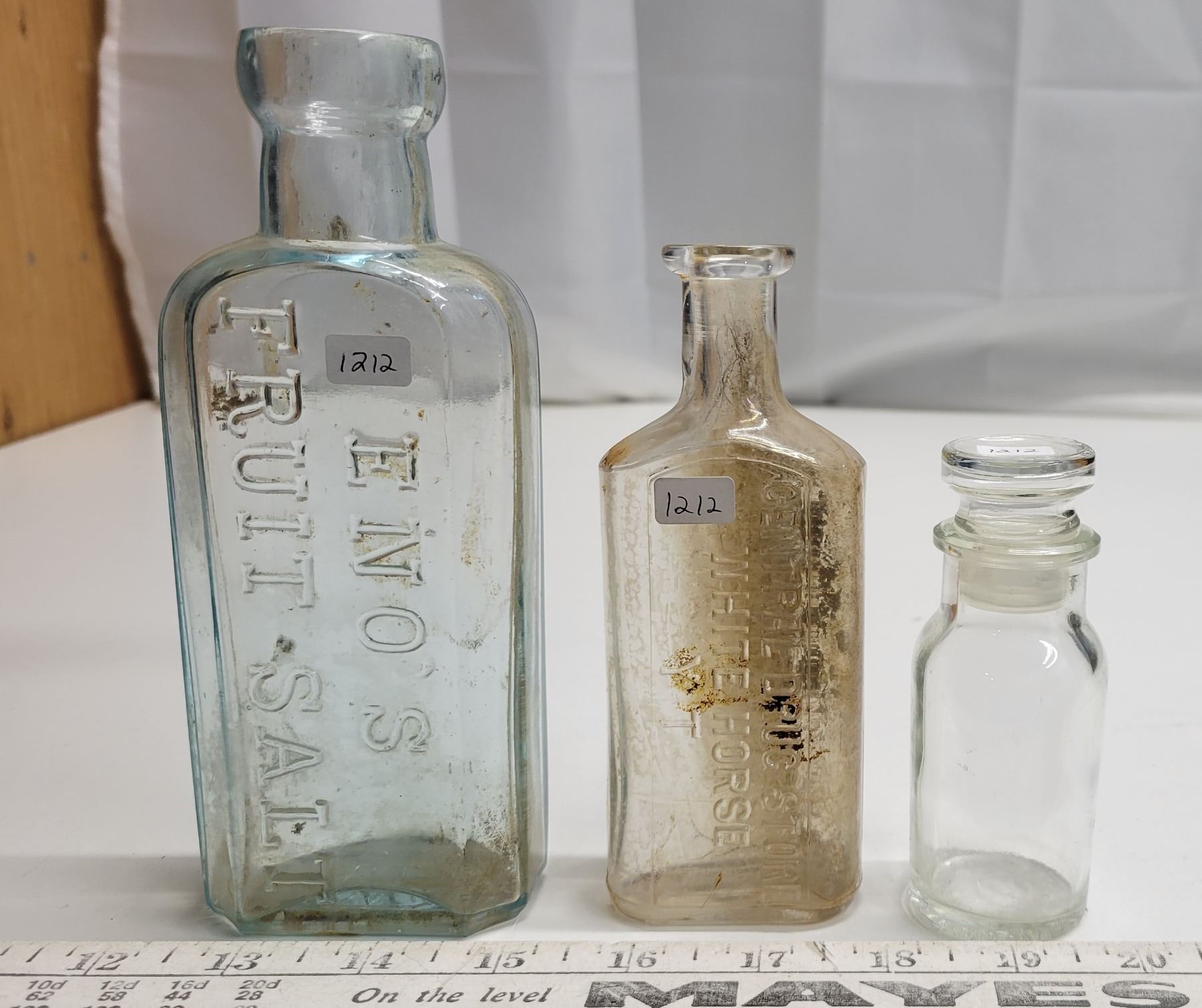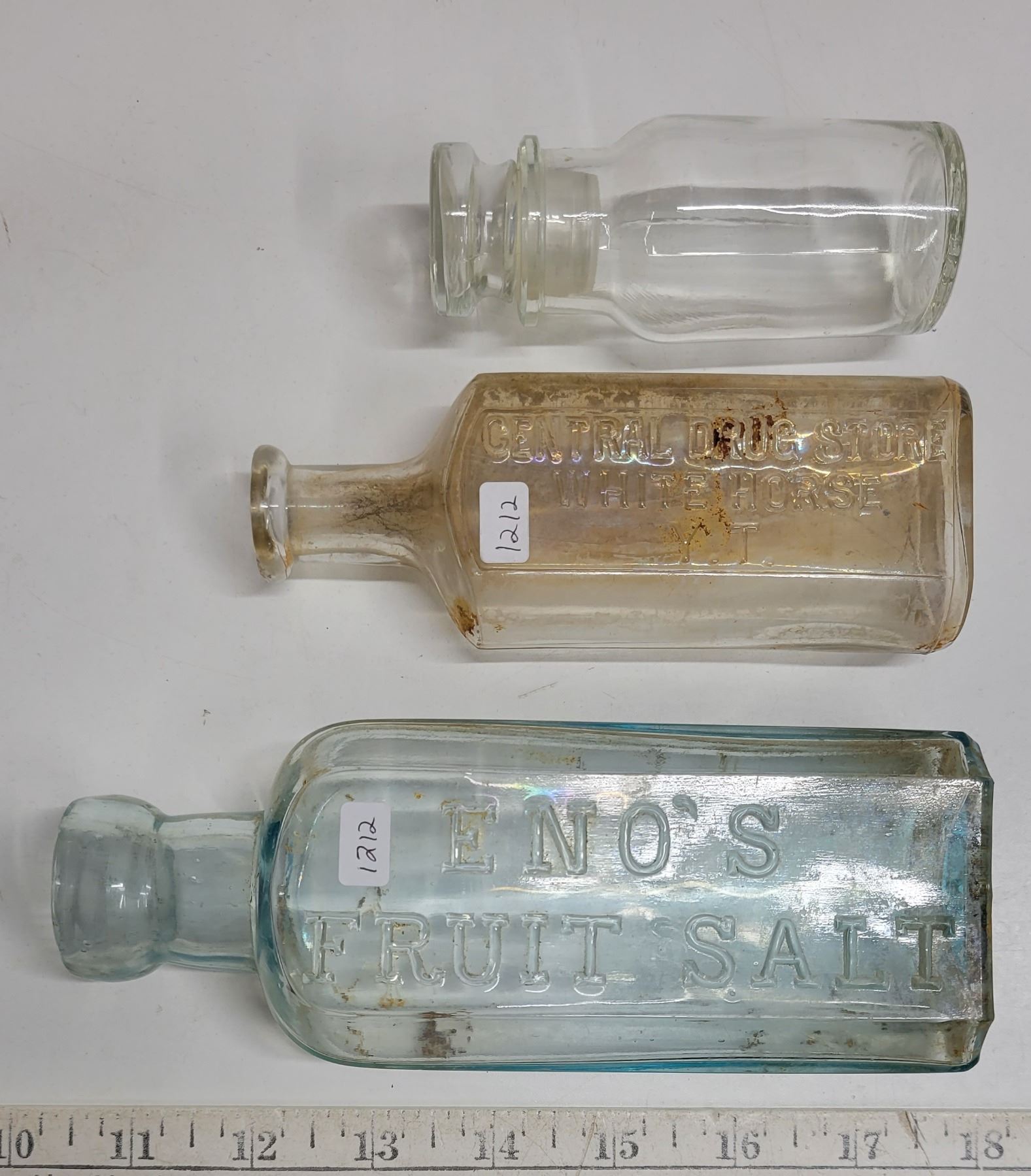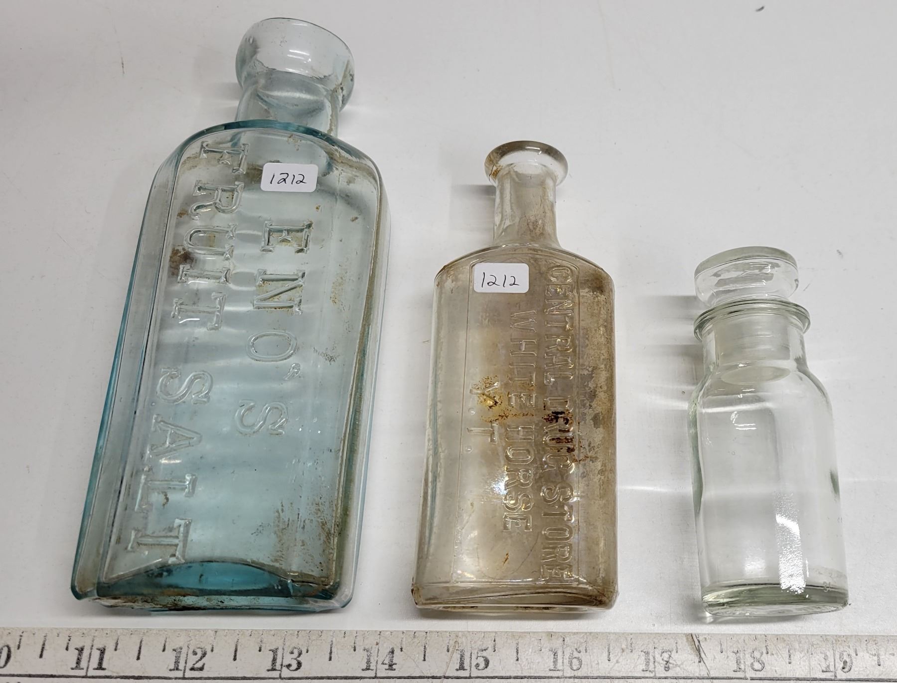 Vintage Glass Bottles; Enos Fruit Salt, Central Drugstore White Horse Y.T., Small Corked