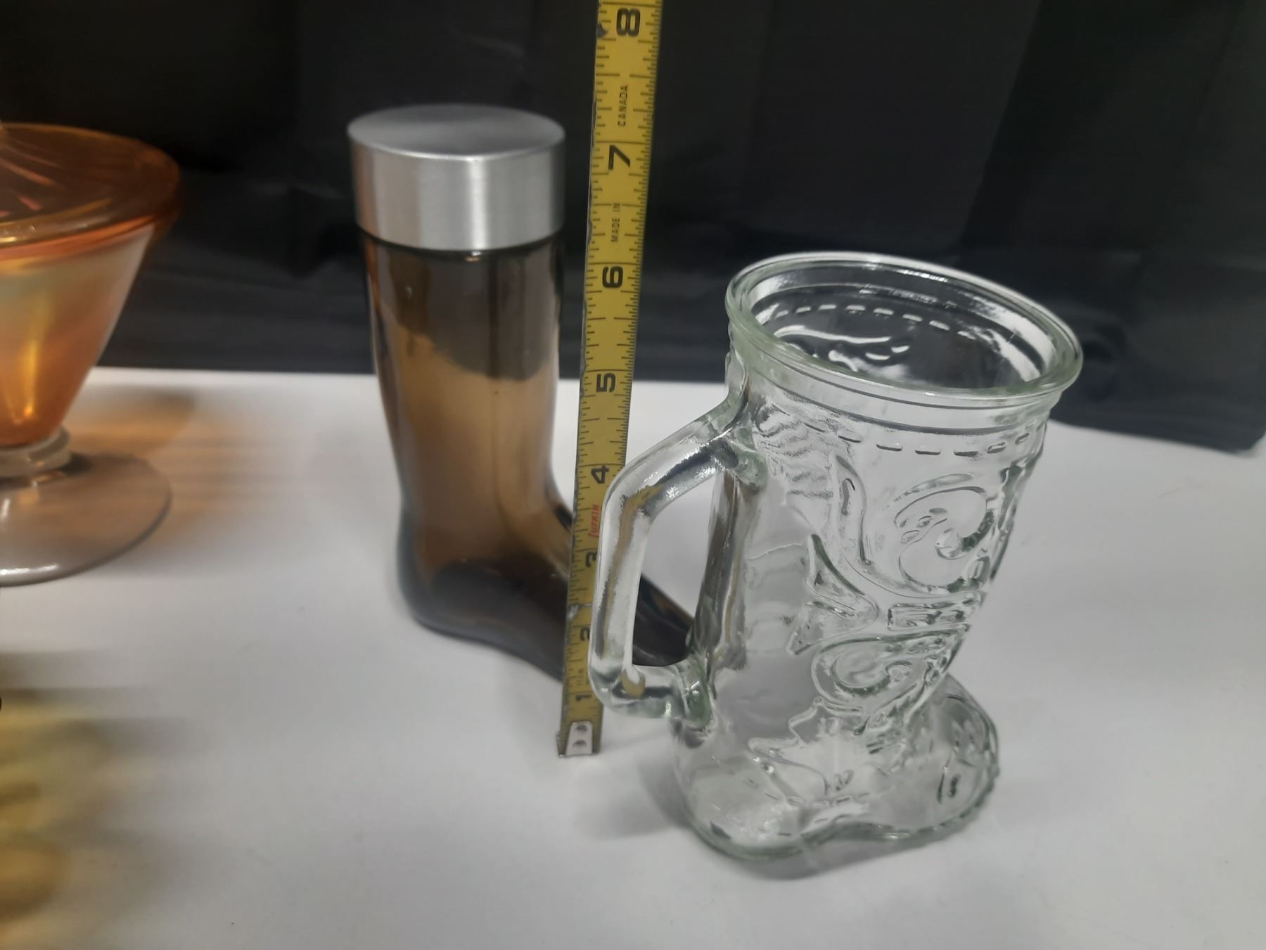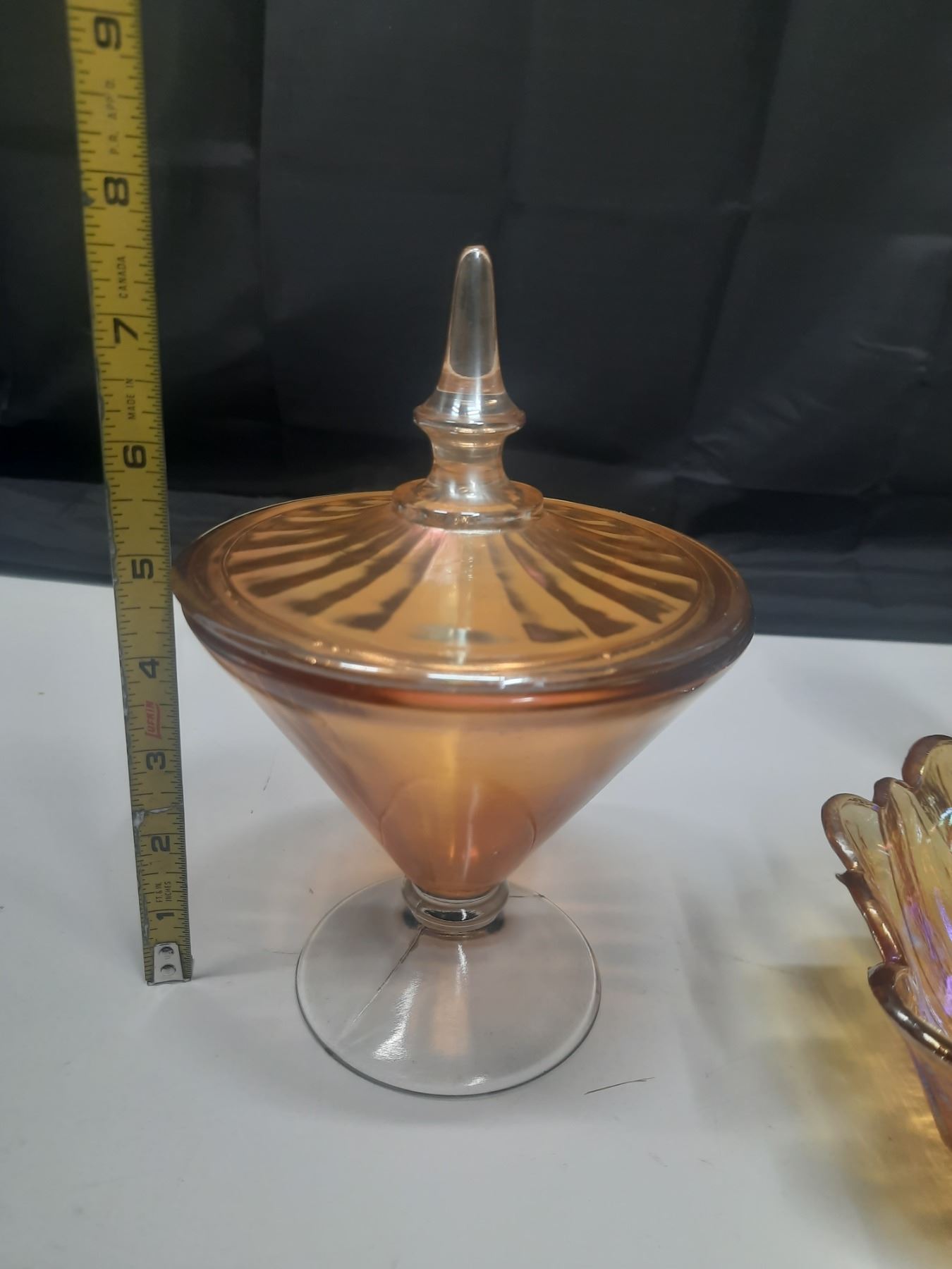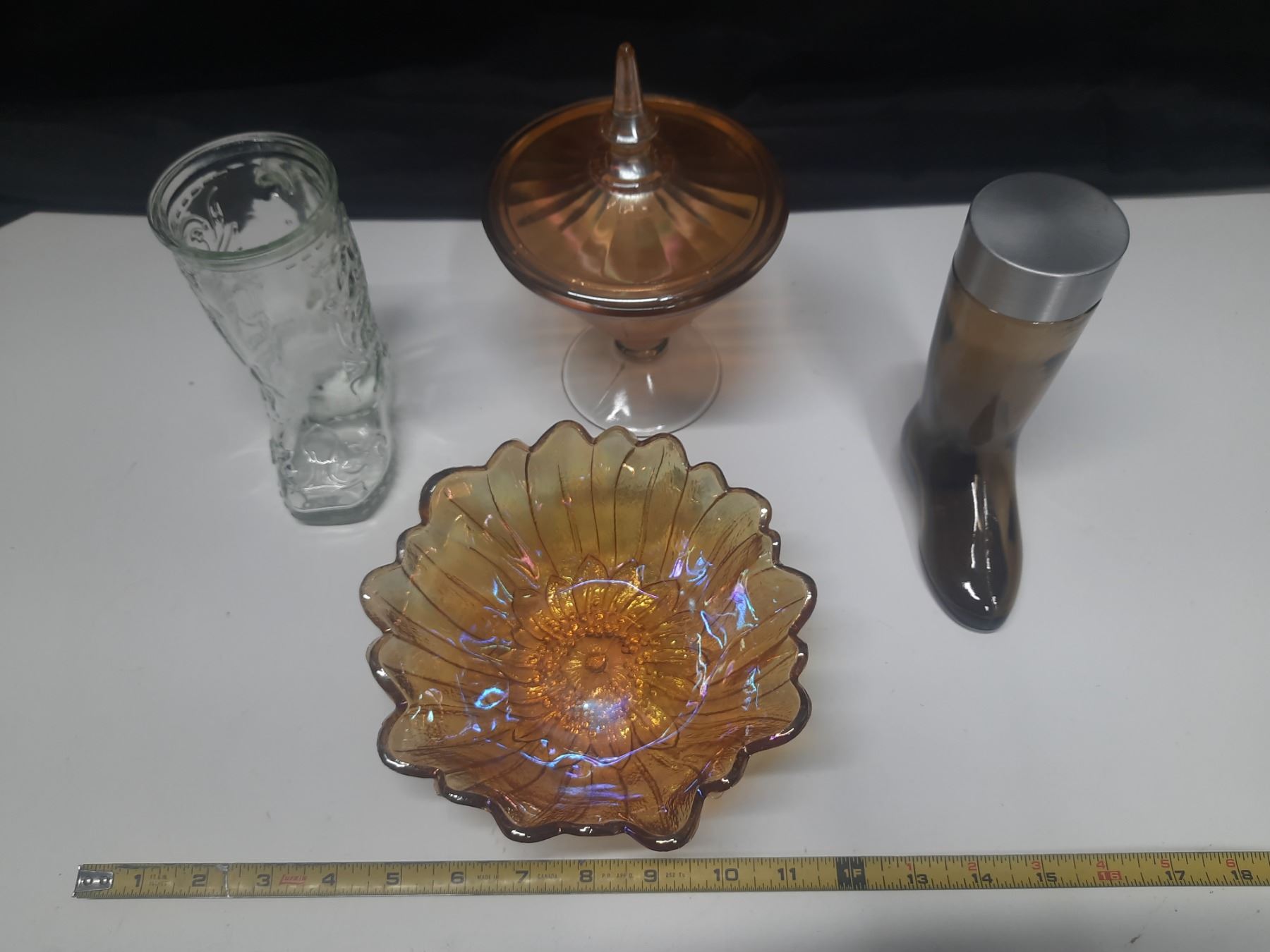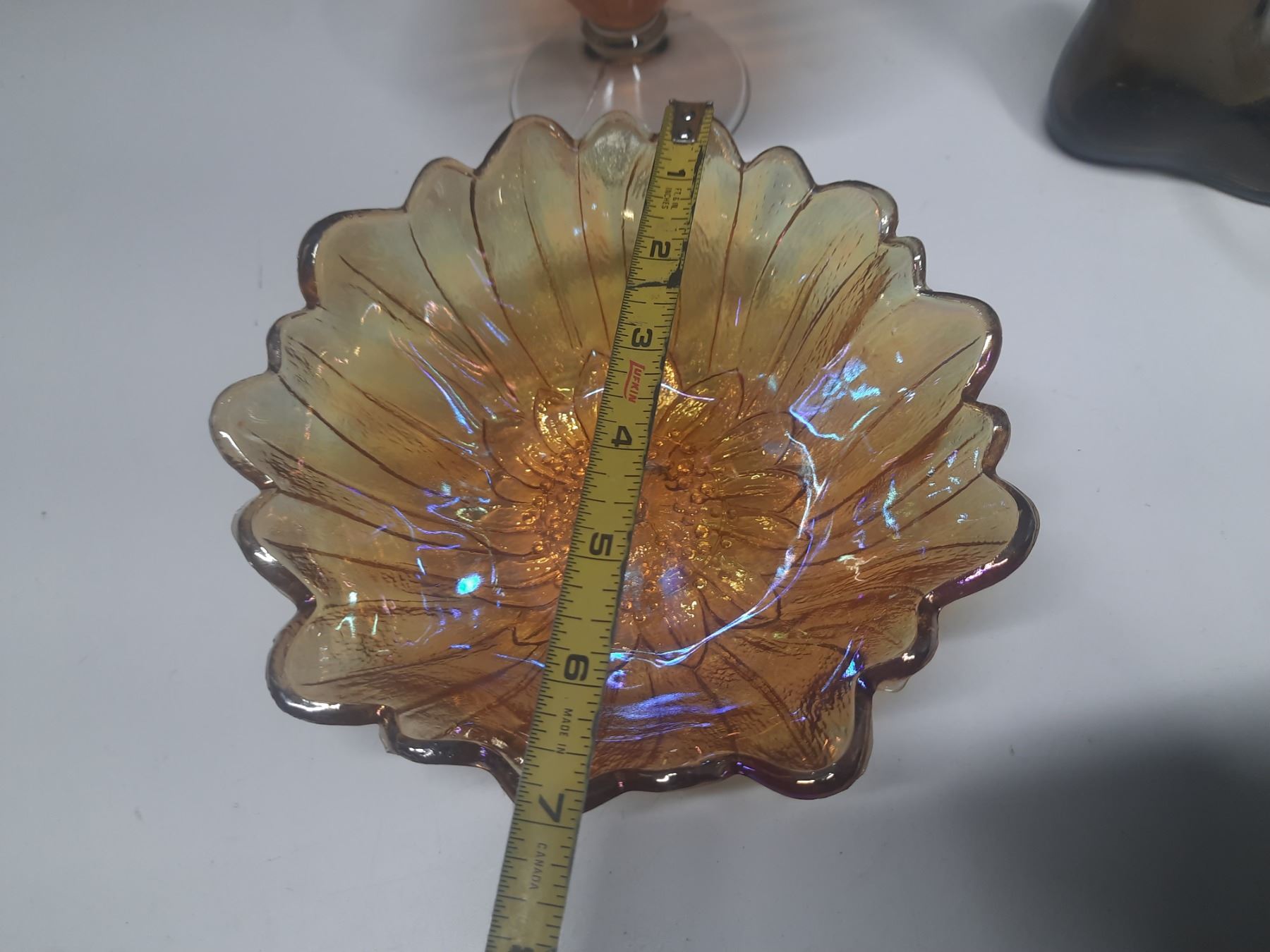 Vintage Glass Items, centered around an iridescent marigold Indiana Carnival Glass sunflower Bowl.