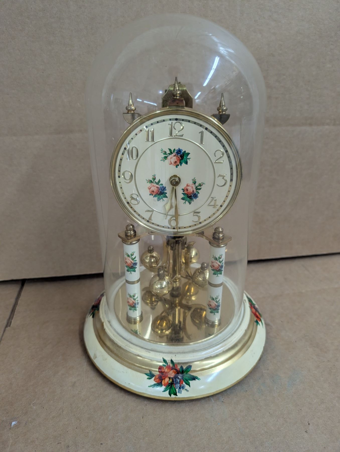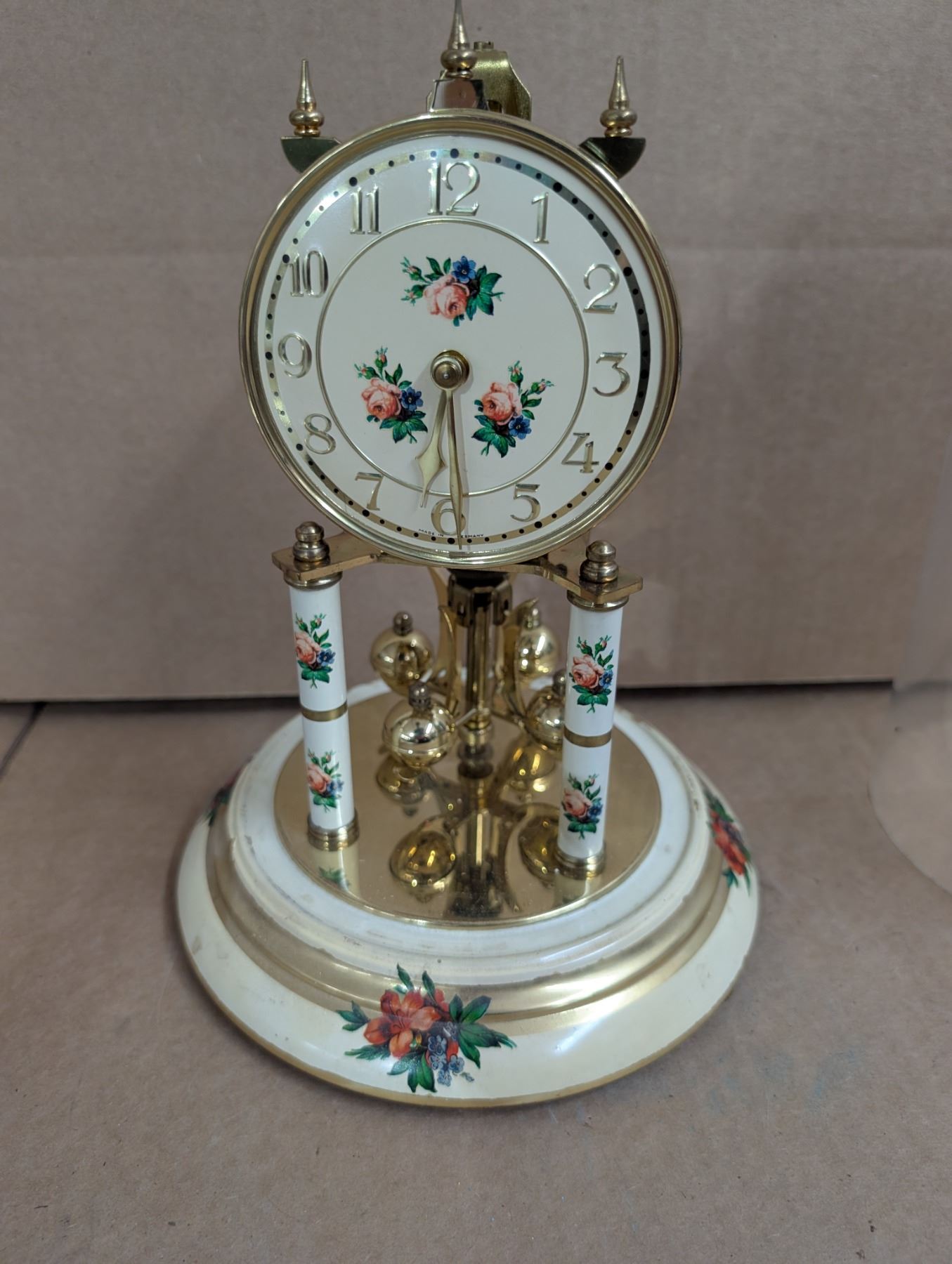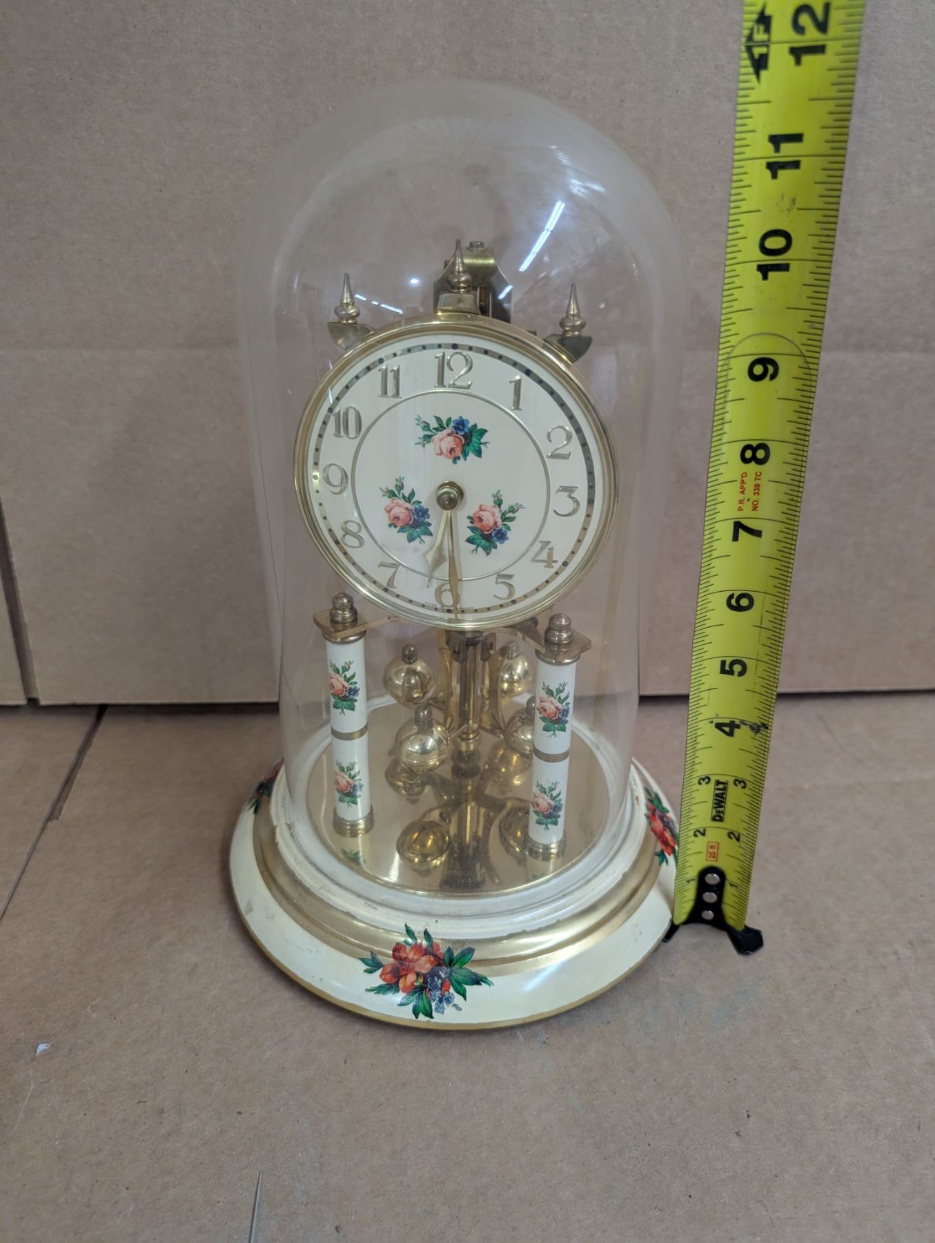 Vintage Glass Round Top Clock (Possible Brass) 11.5" (Floral Design and Spinning Bottom)