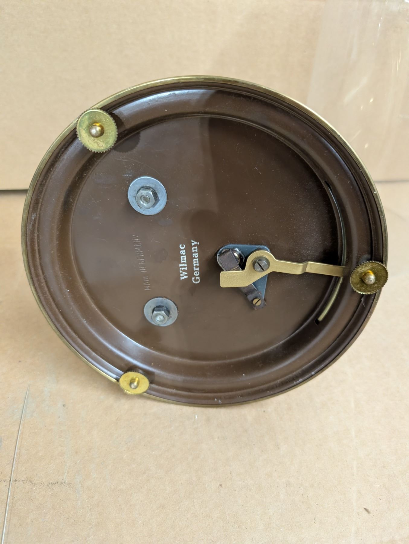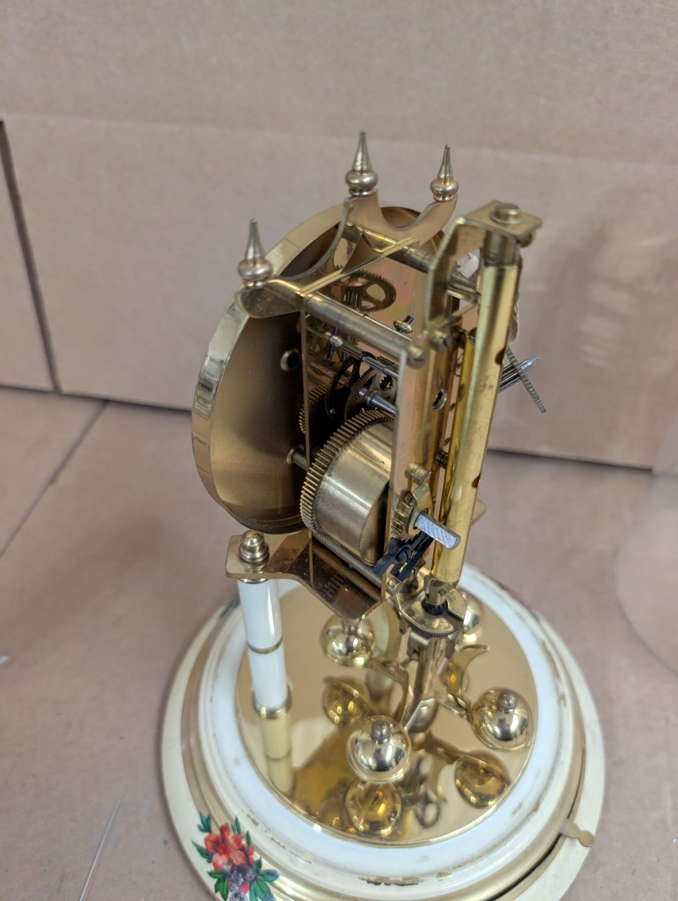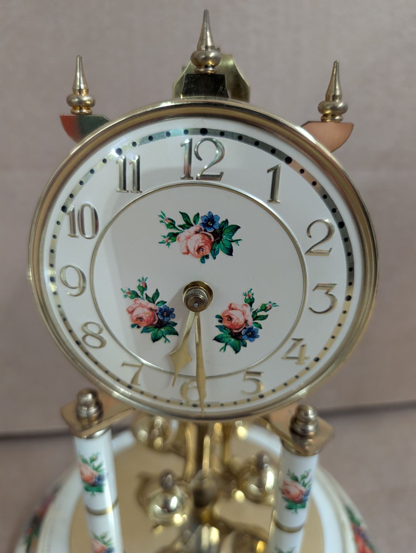 Vintage Glass Round Top Clock (Possible Brass) 11.5" (Floral Design and Spinning Bottom)