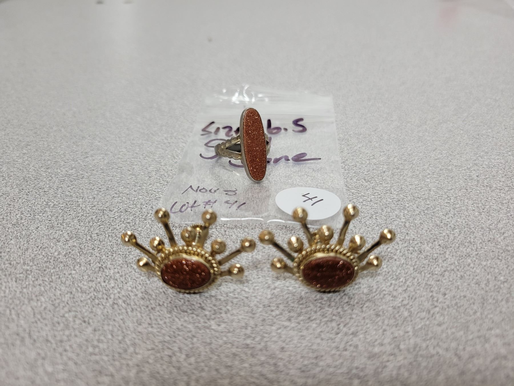 Vintage “Gold Stone” Screw Back Earrings + Silver “Gold Stone” Ring Size 6.5
