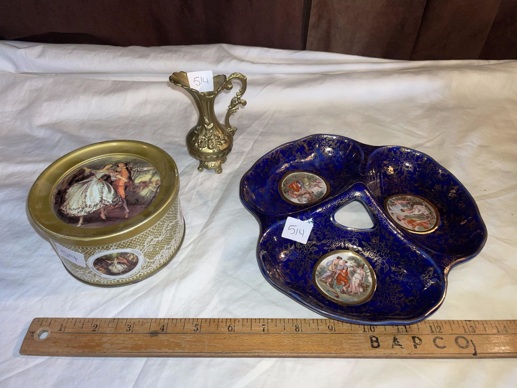 Vintage Gold Toned pieces Includes divided, ceramic dish, with gold detailing, made in England, 1 small pitcher made in Italy, and a tin.