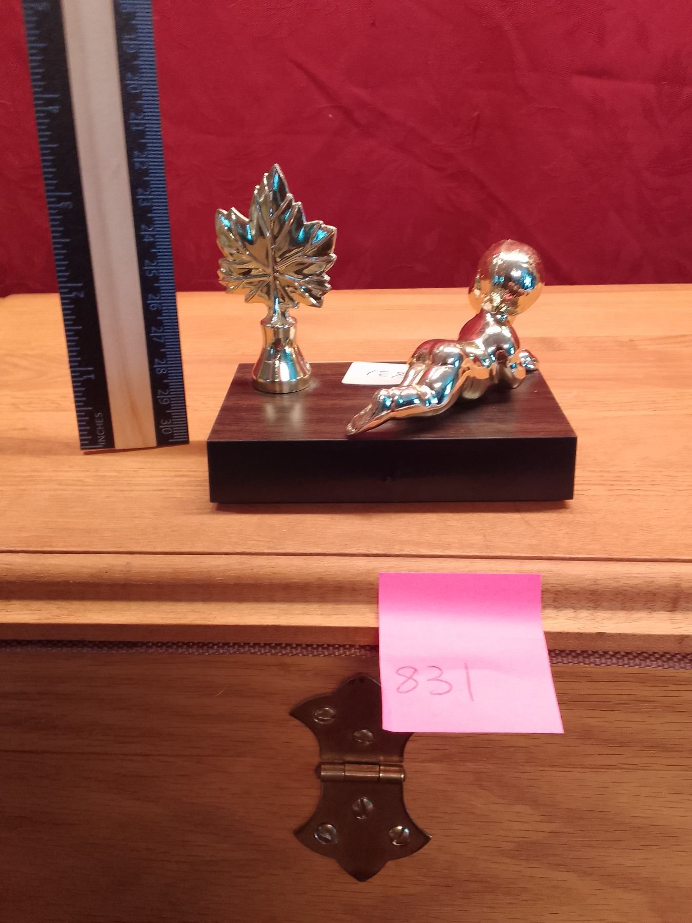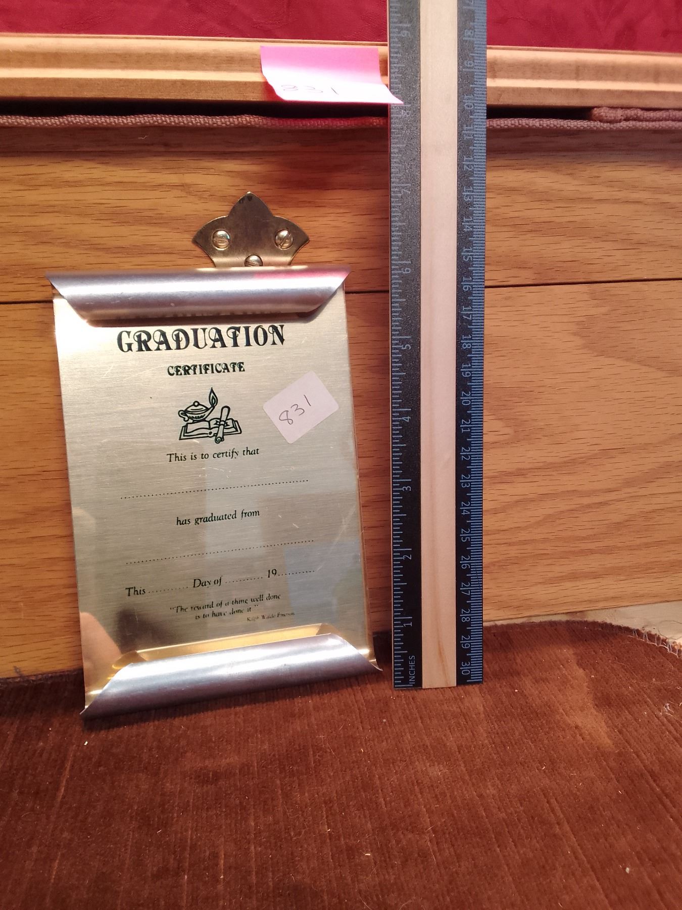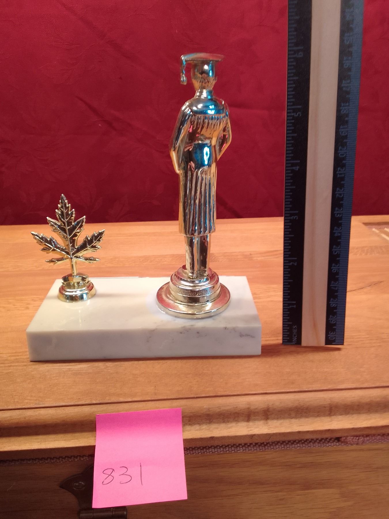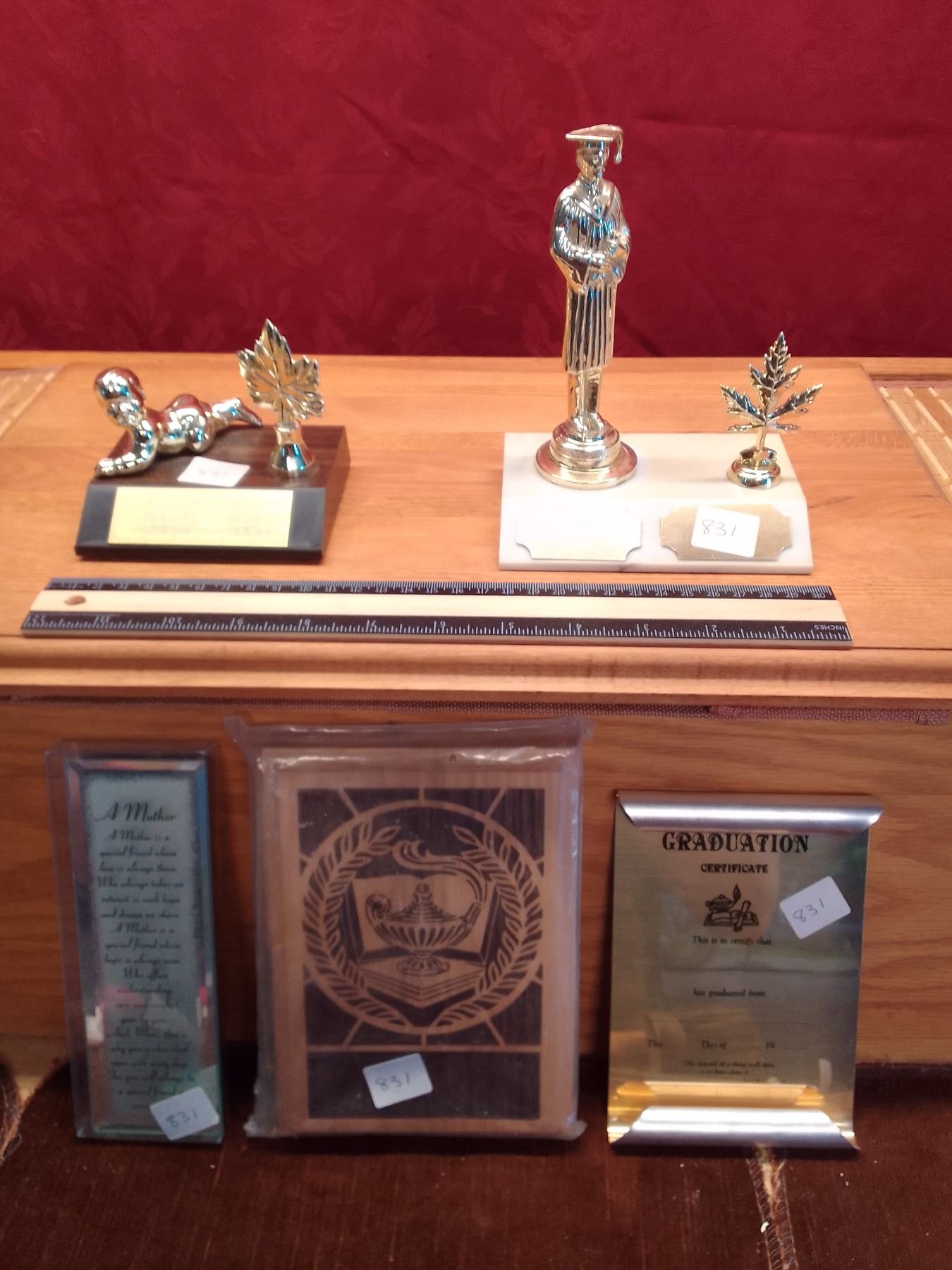 Vintage Graduation Trophy Toppers & Award Plaques Collection Lot features silver graduate figure with maple leaves, swimmer topper, "A Mother" poem plaque, lamp of knowledge- wooden plaque, and metallic Graduation Certificate award. Ideal for school awards or sentimental decor.