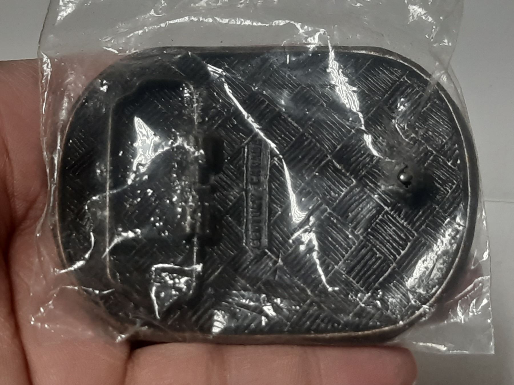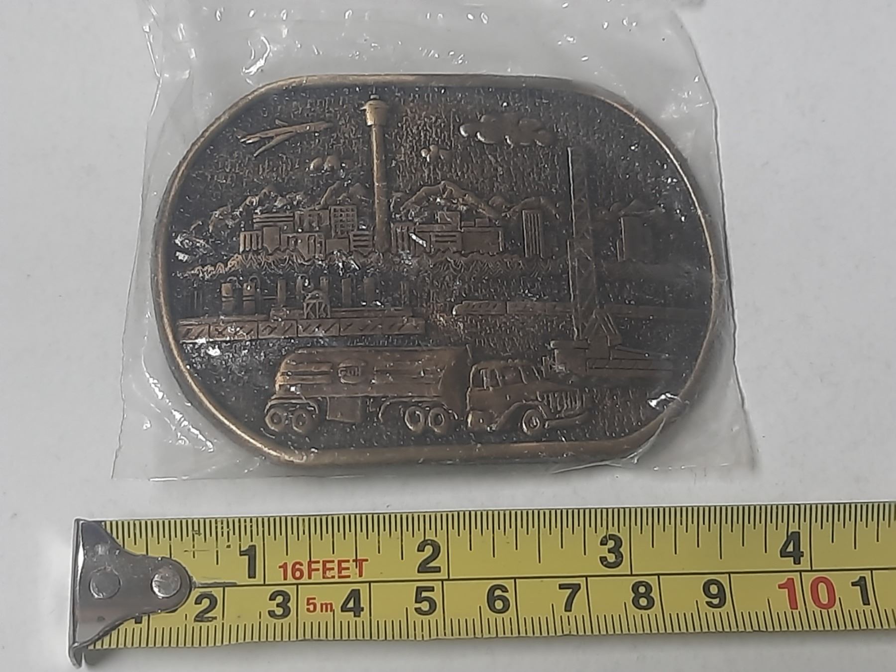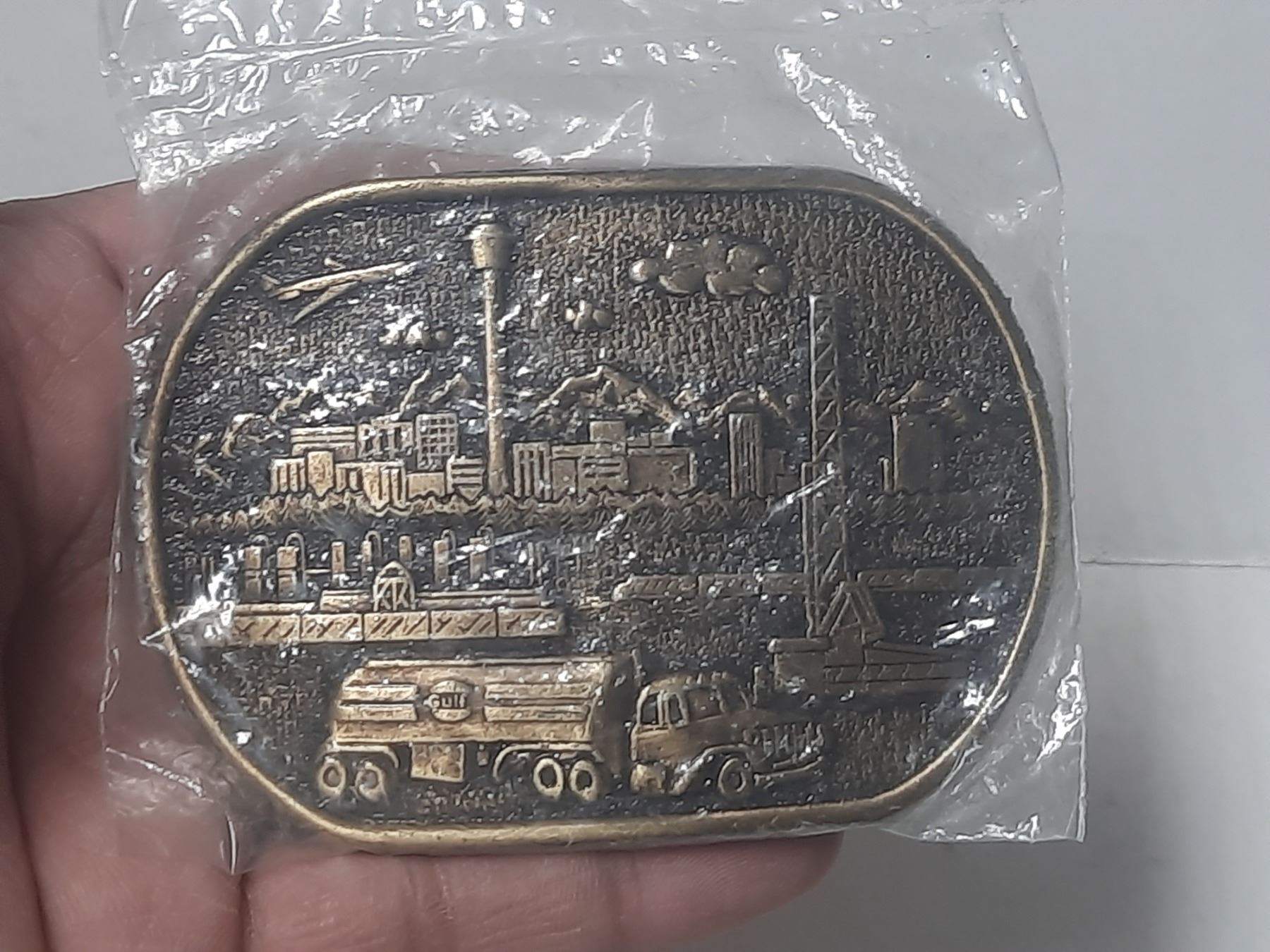 Vintage Gulf Oil Canada promotional belt buckle, depicting a detailed industrial oil refinery scene against the Calgary, Alberta skyline.