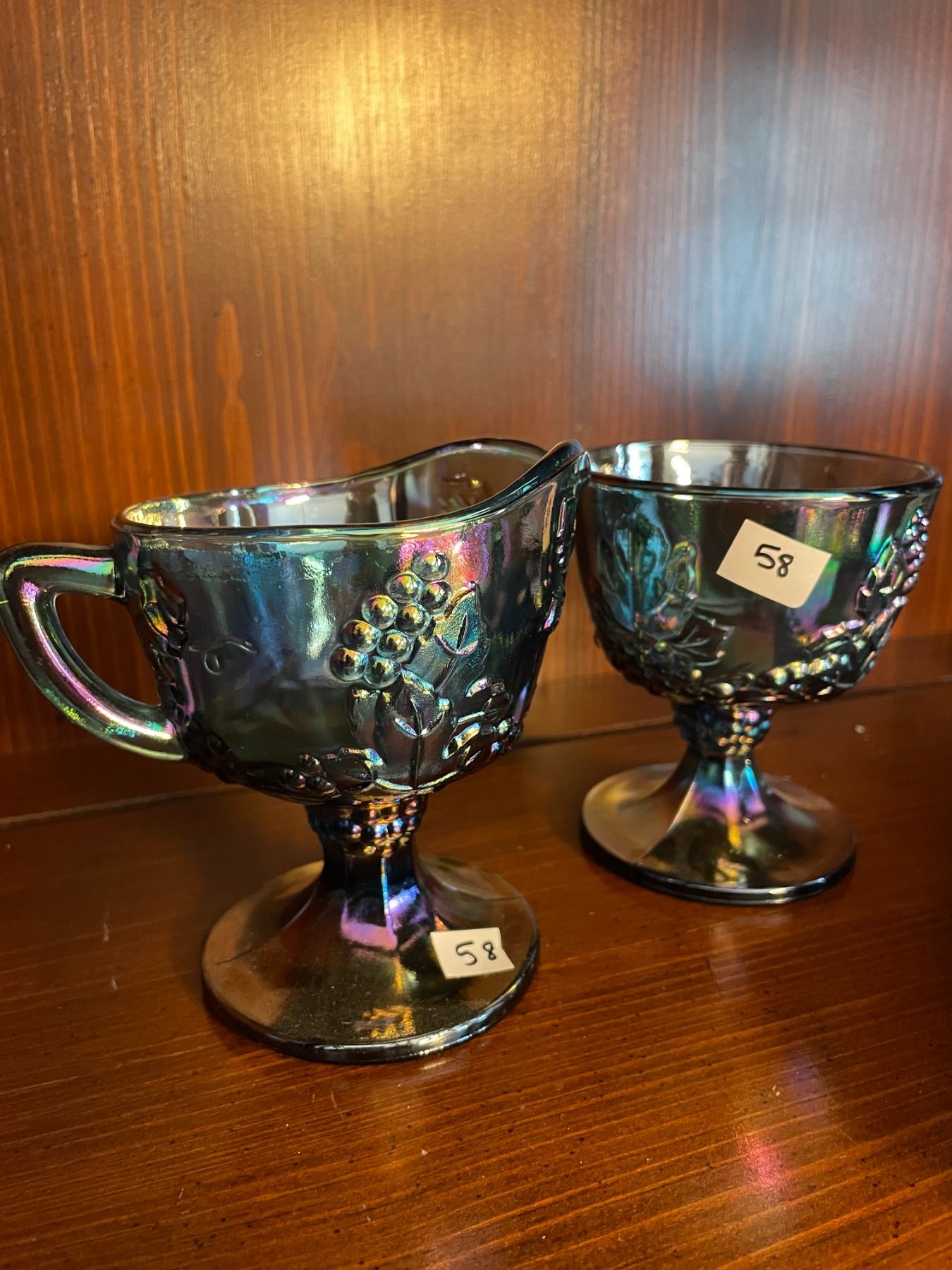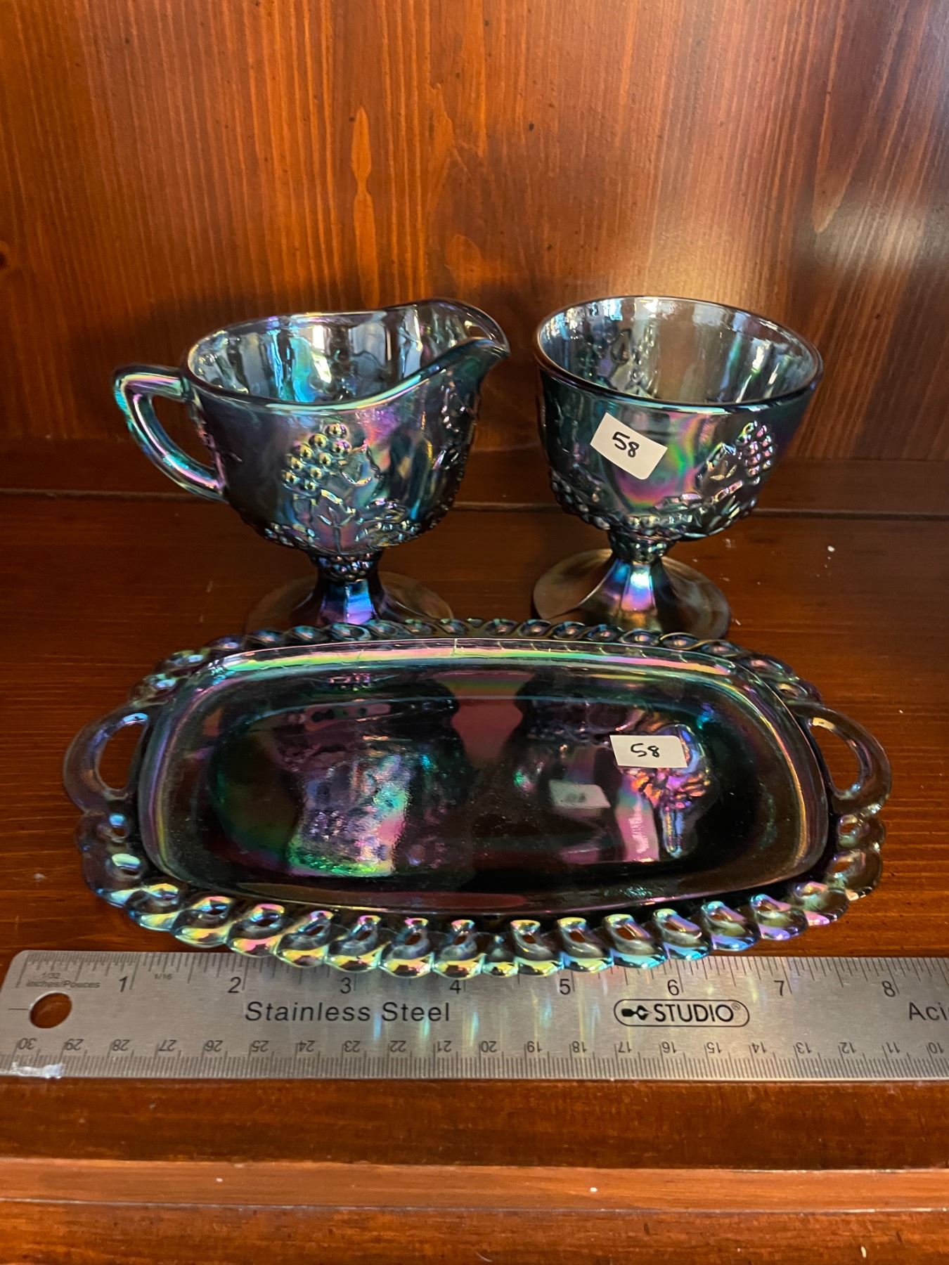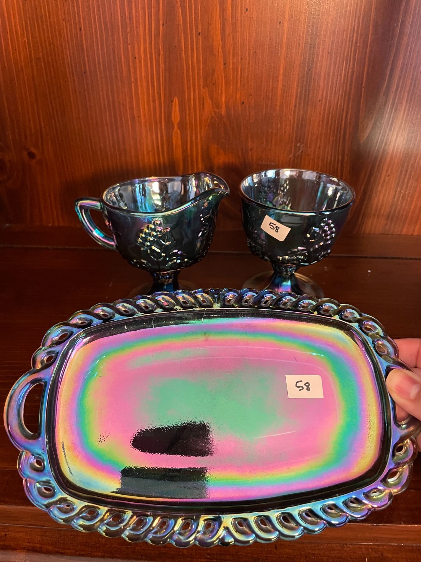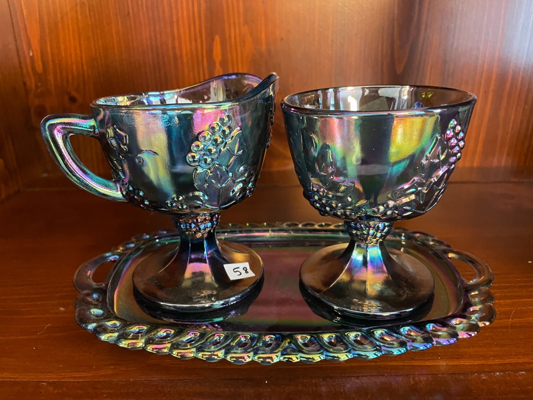 Vintage, Indiana, blue, carnival glass, cream and sugar set, with tray