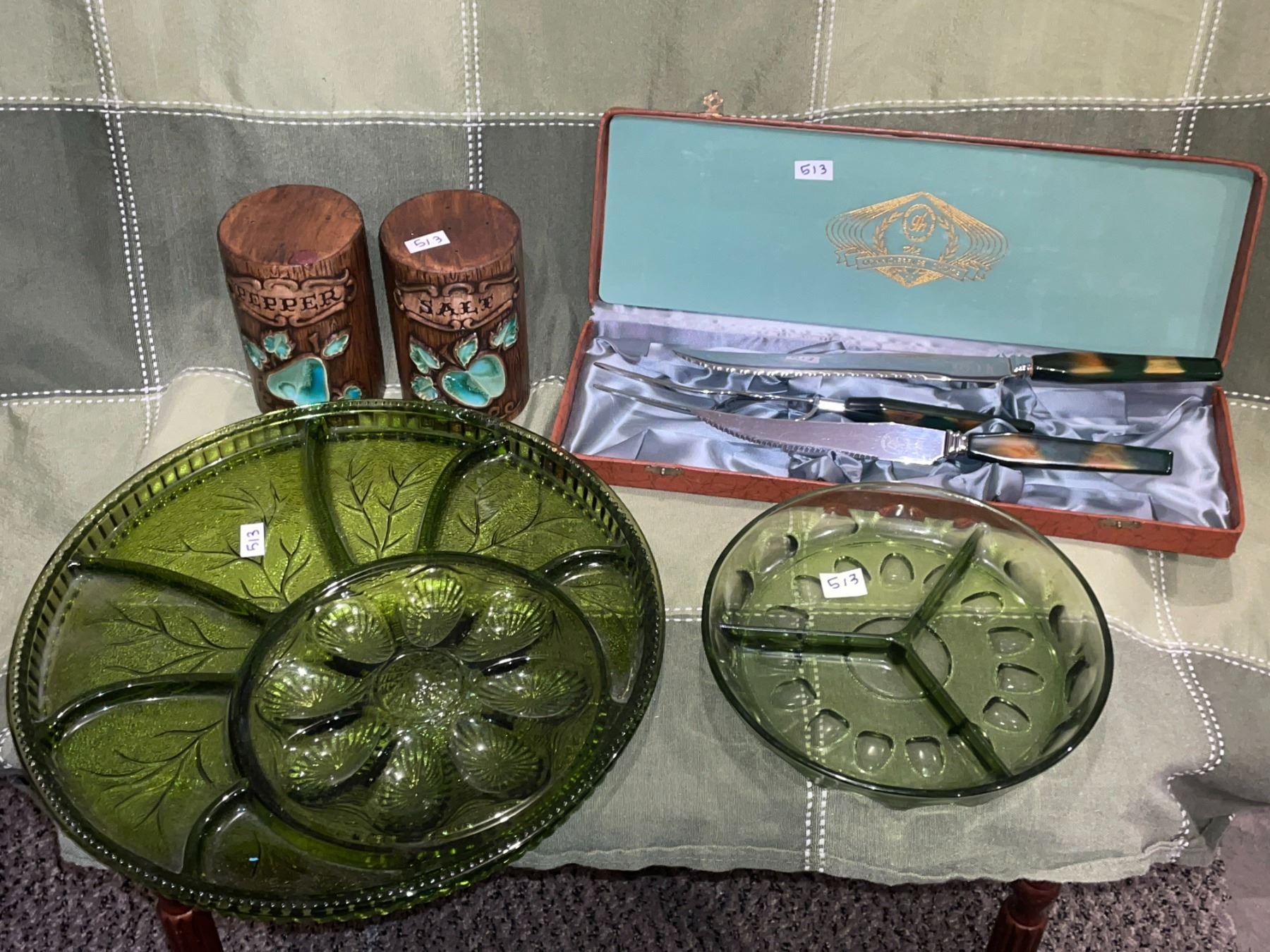 Vintage Indiana glass, avocado colour, devilled egg dish, and same coloured, round, divided serving dish. Also includes Canadian made, stainless steel, carving set, and ceramic Salt and Pepper shakers