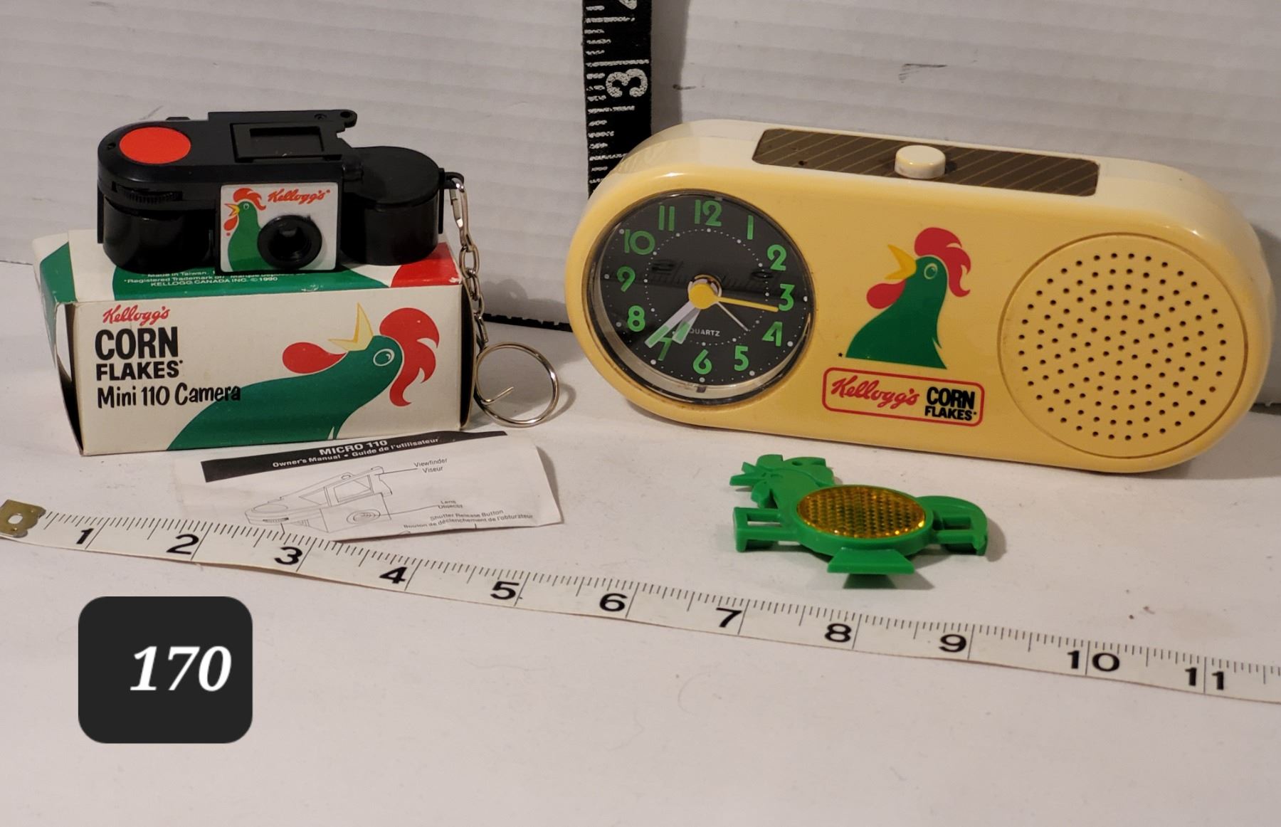 Vintage Kellogg's Rooster alarm clock (alarm not working) Camera & bike spoke reflector.