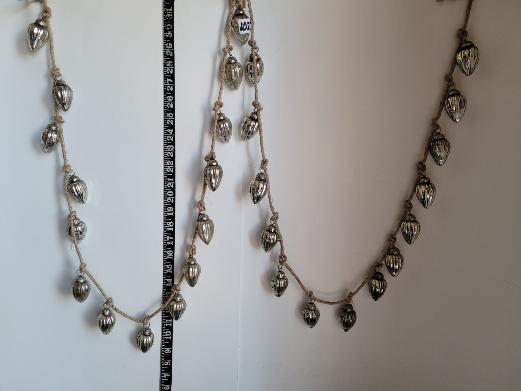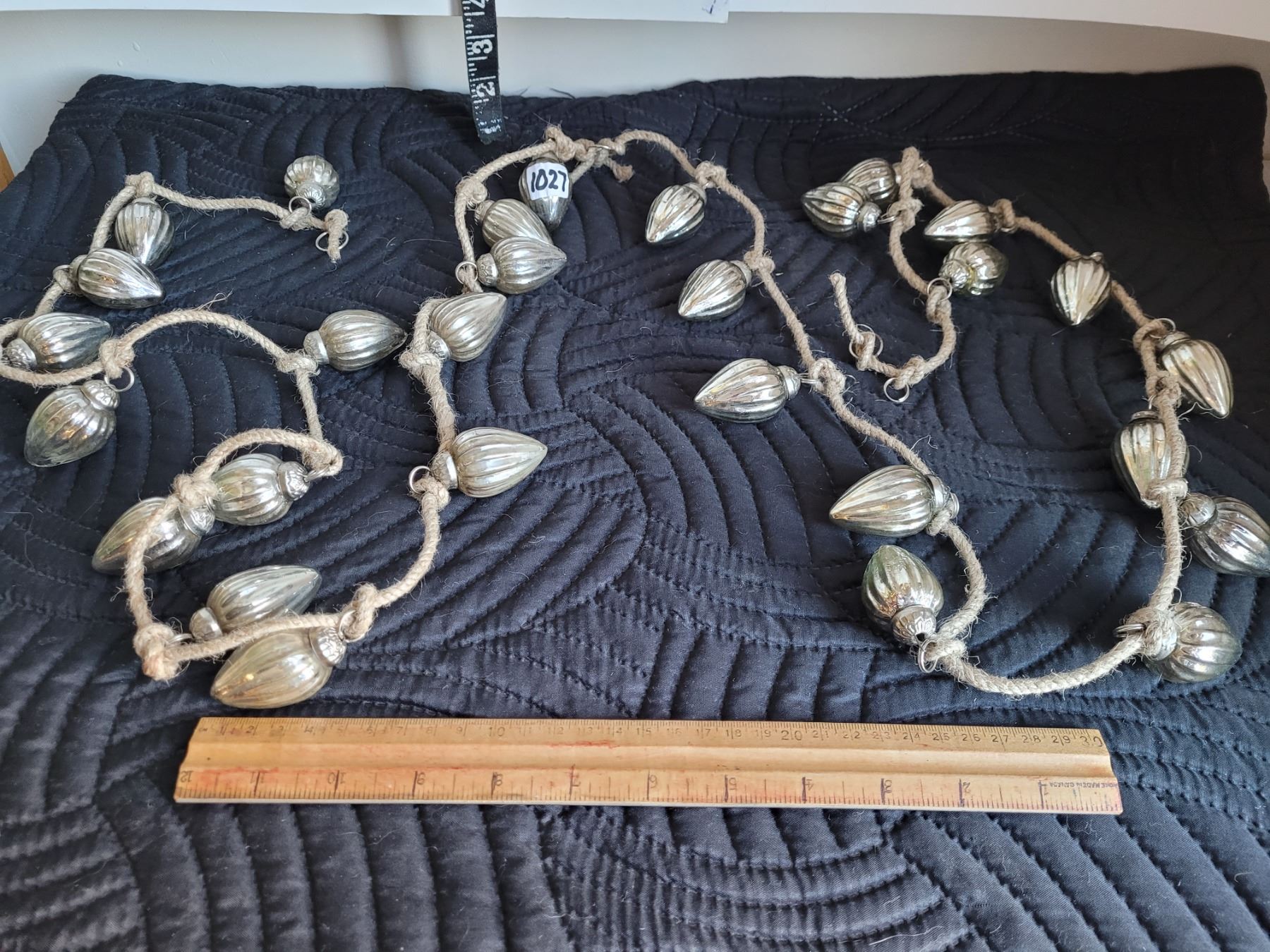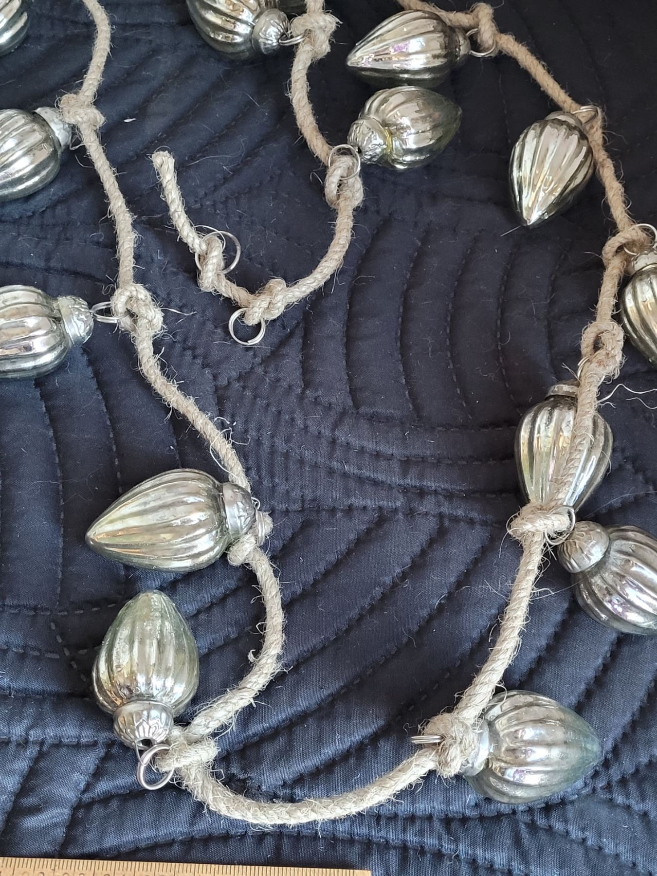 Vintage Kugel style bulb garland features individually tied bulbs on a rope.
