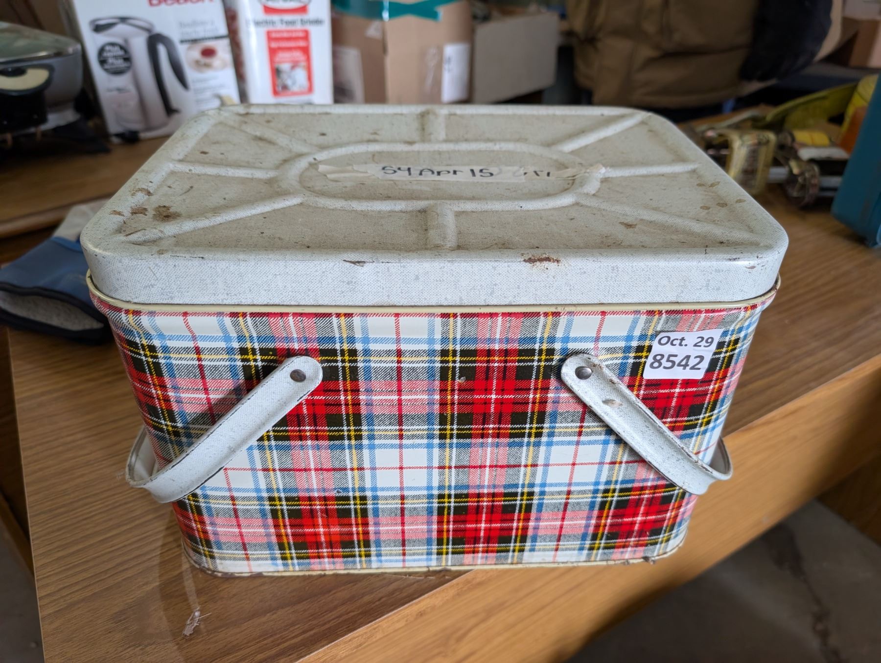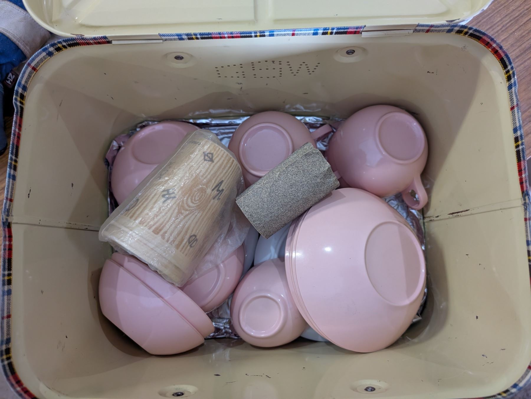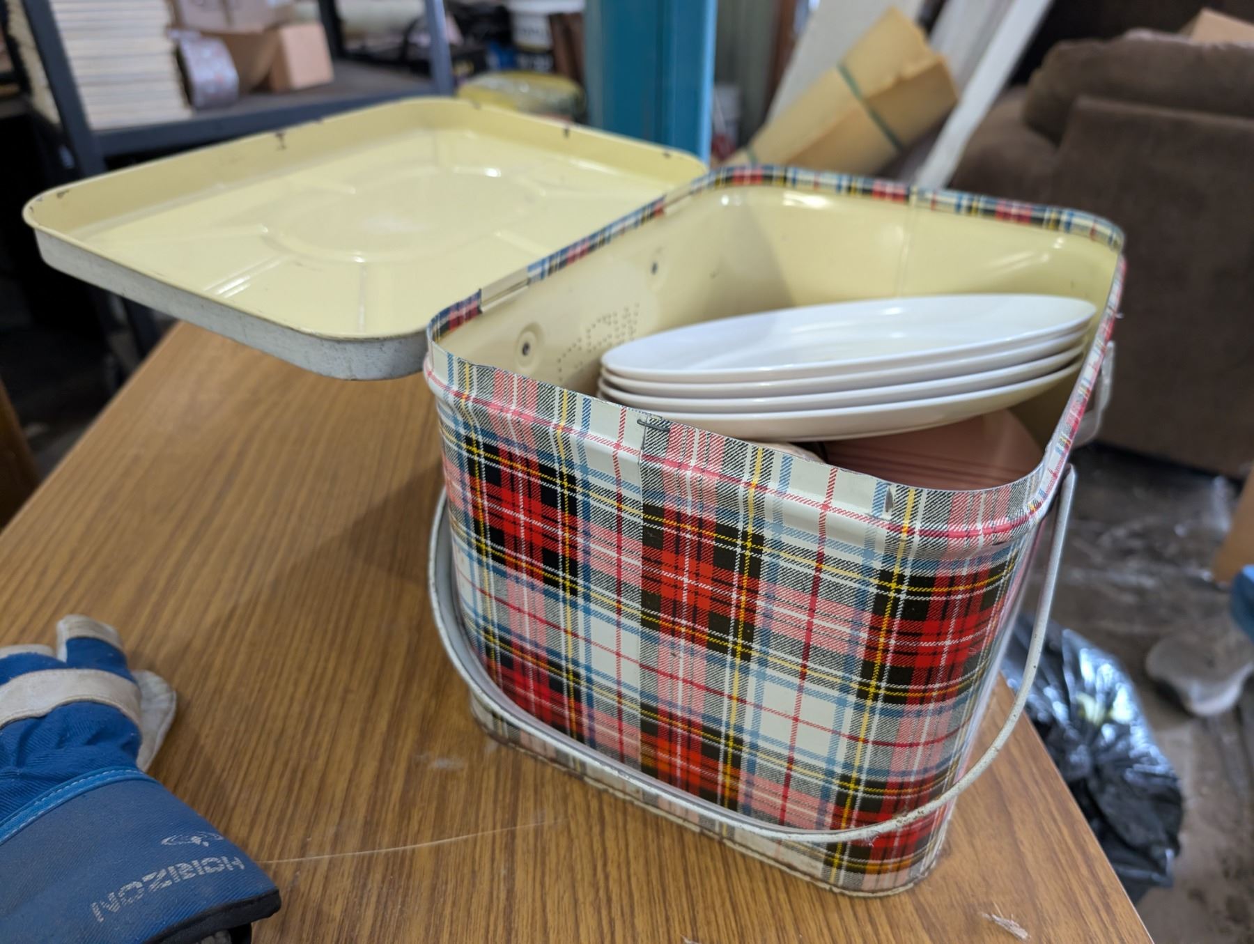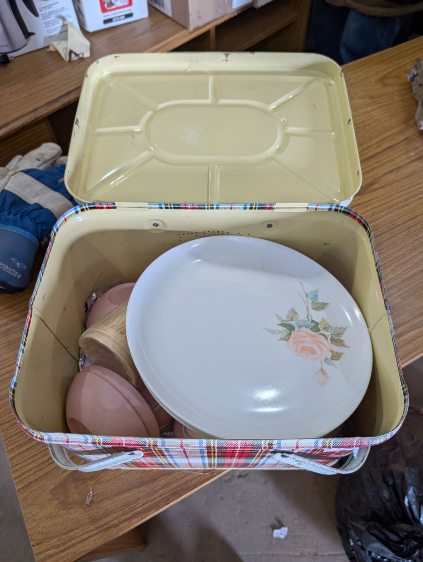 Vintage Metal Picnic Box w/ Plates, Bowls, and etc.