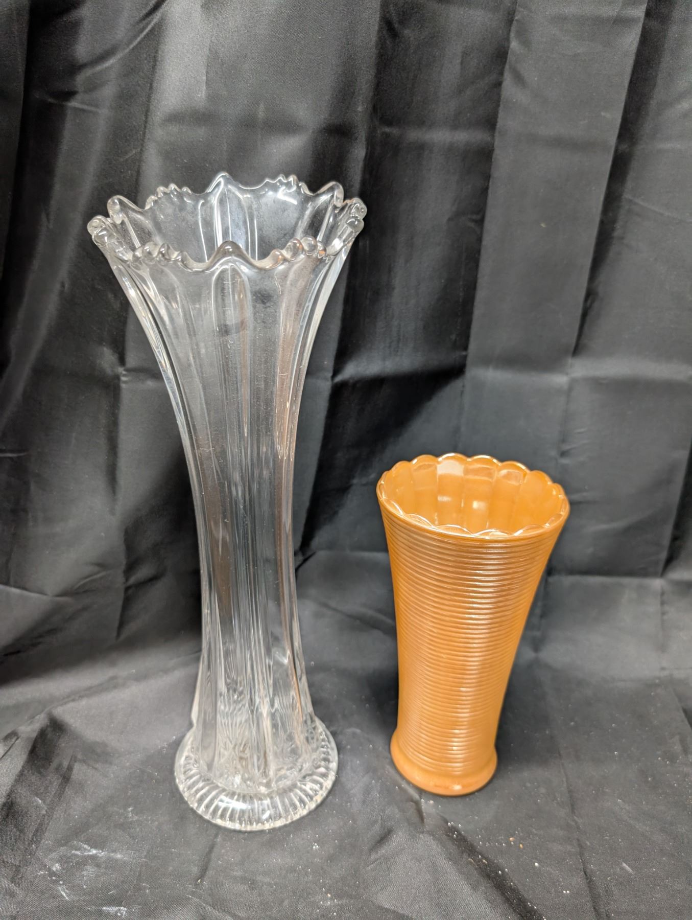 Vintage Orange Luster Vase and Tall Clear Vase