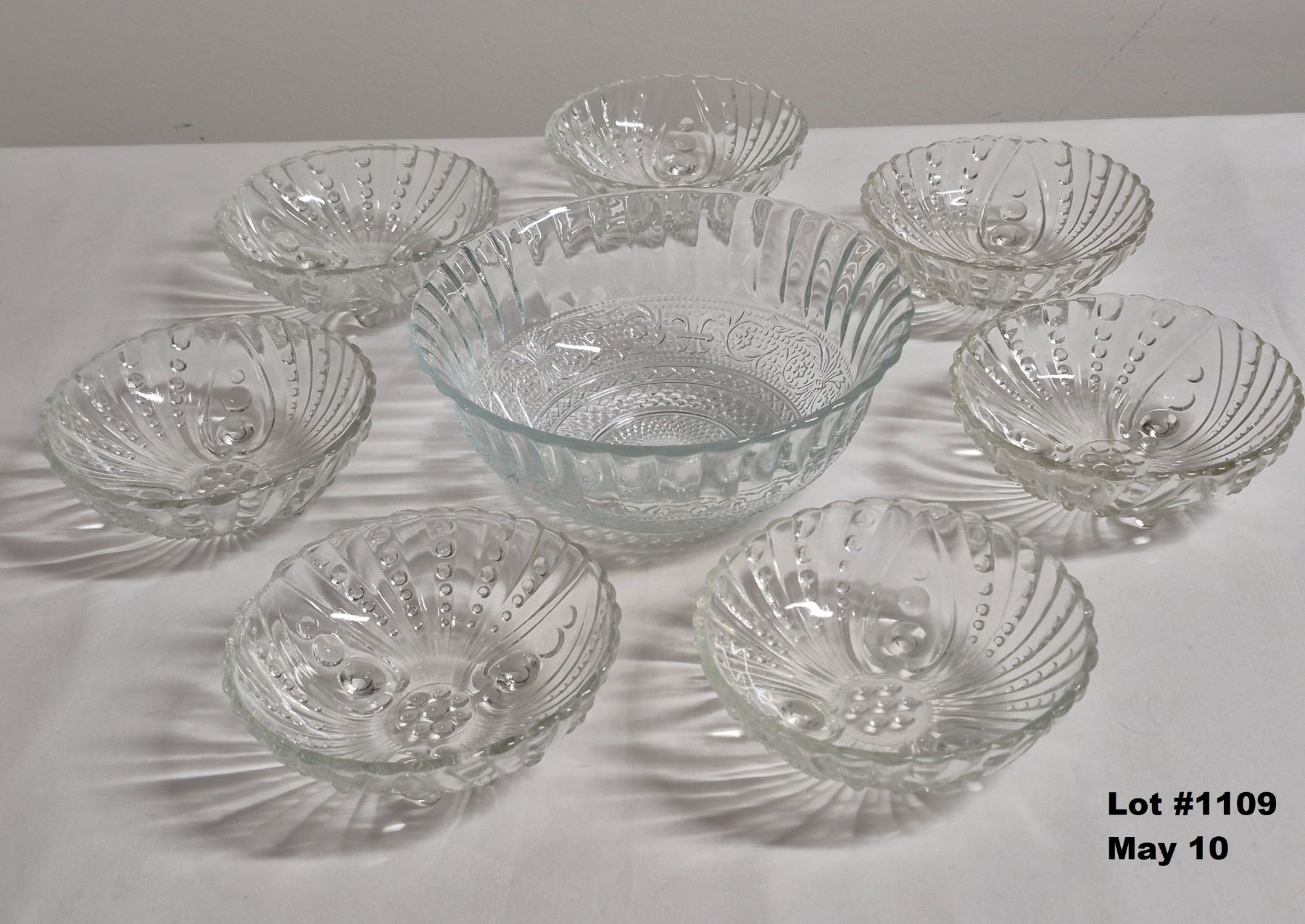 Vintage-Pearls and Swirls-Pressed Glass Footed Fruit Bowls (7) and (1) Decorative serving bowl