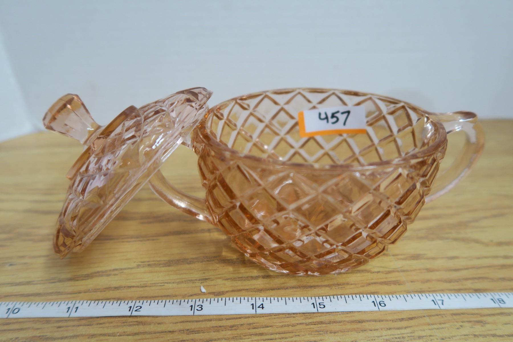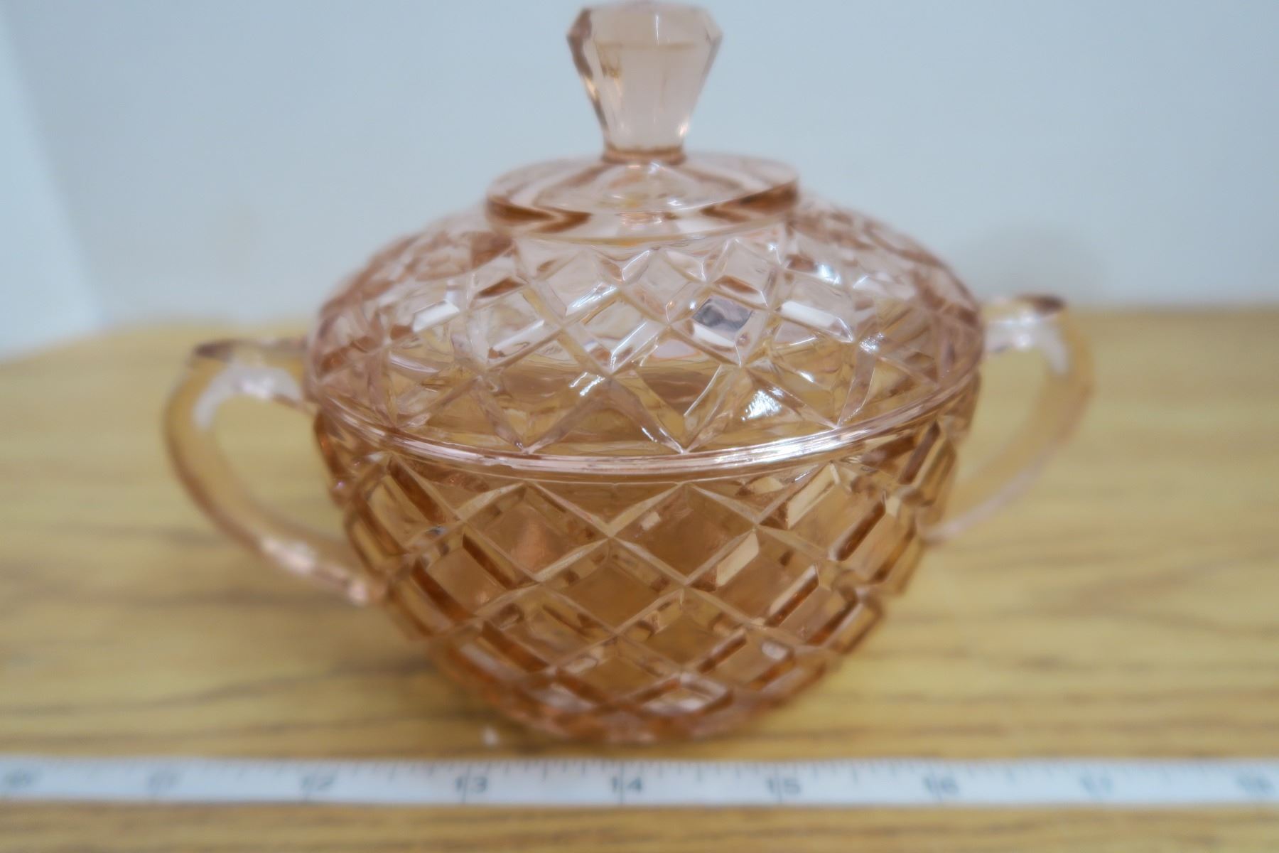 Vintage Pink Glass Diamond Patterns Double Handle Liddded Sugar Bowl