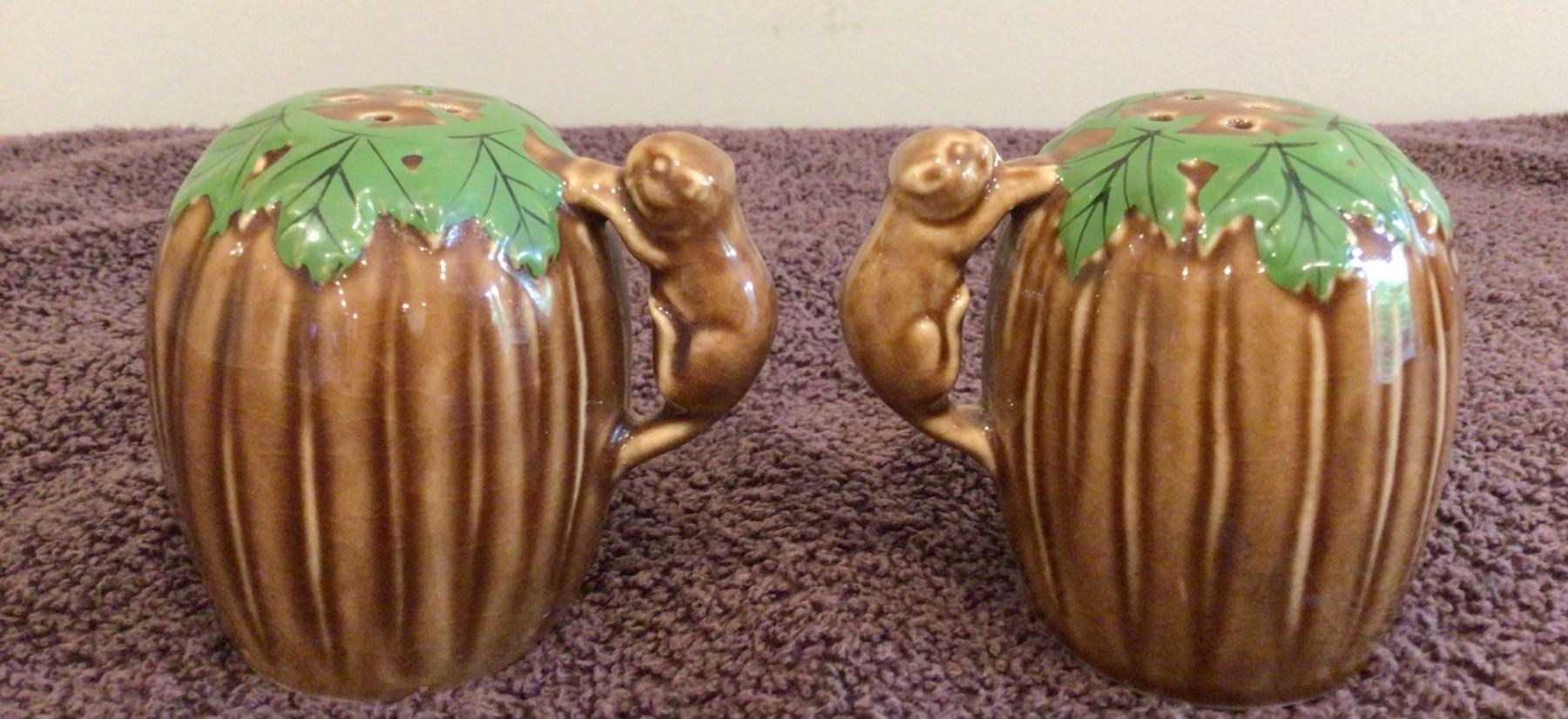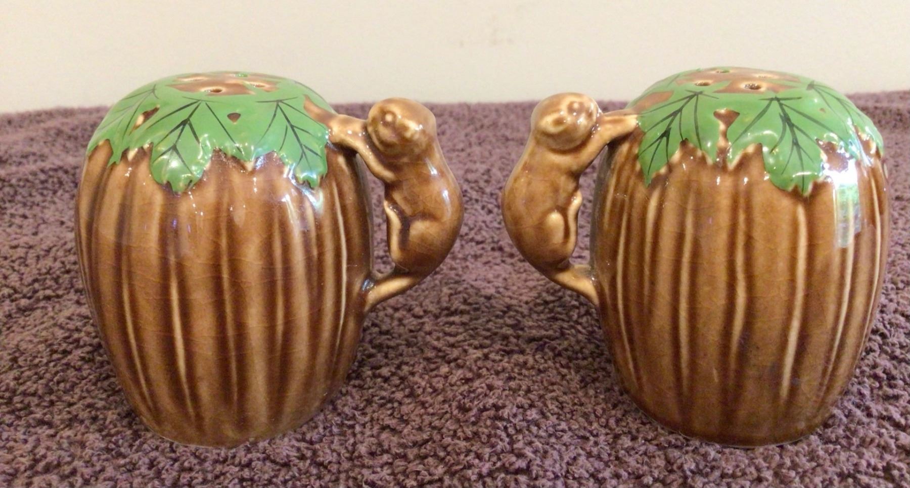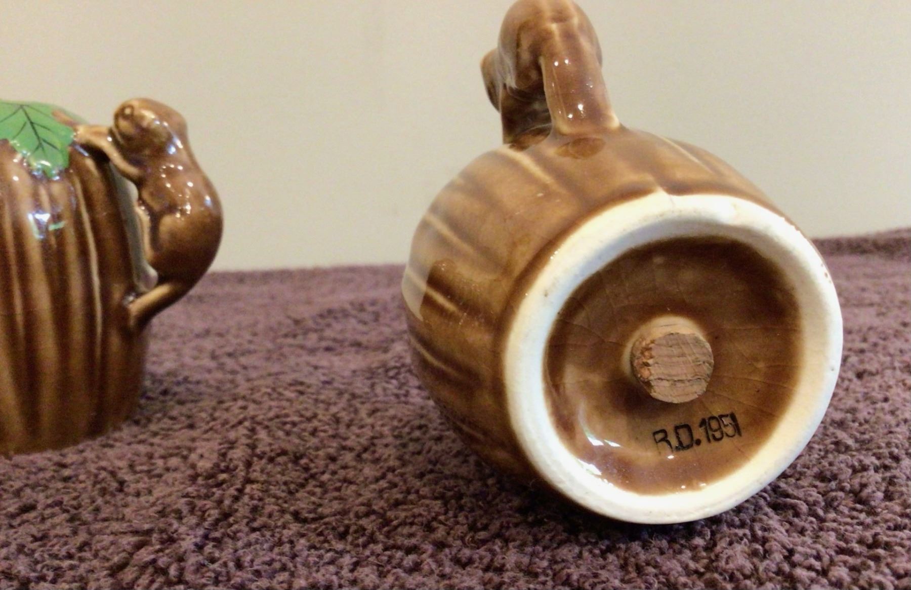 Vintage R.D. 1951 Pottery salt and pepper shakers. Majoolica beavers handles.