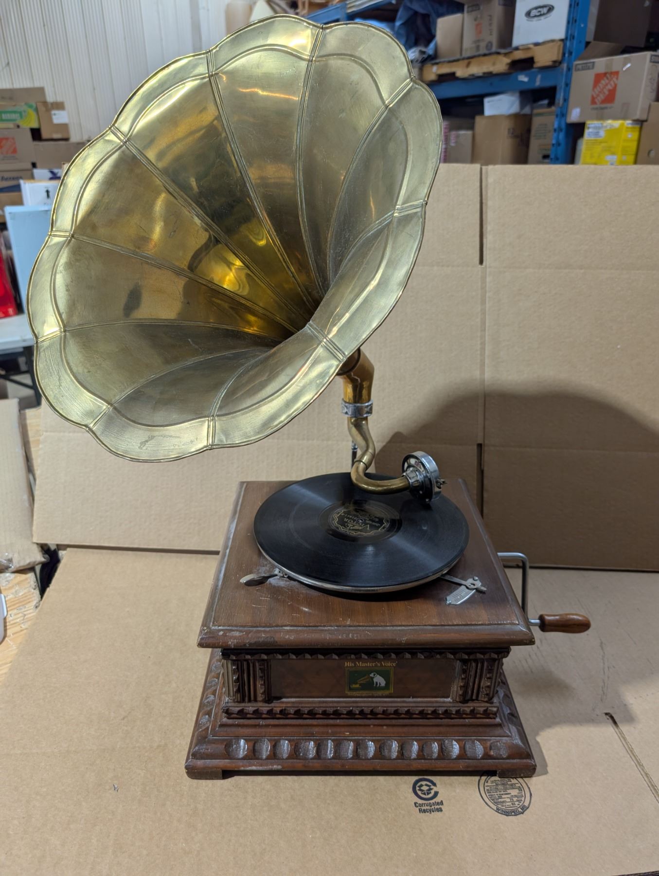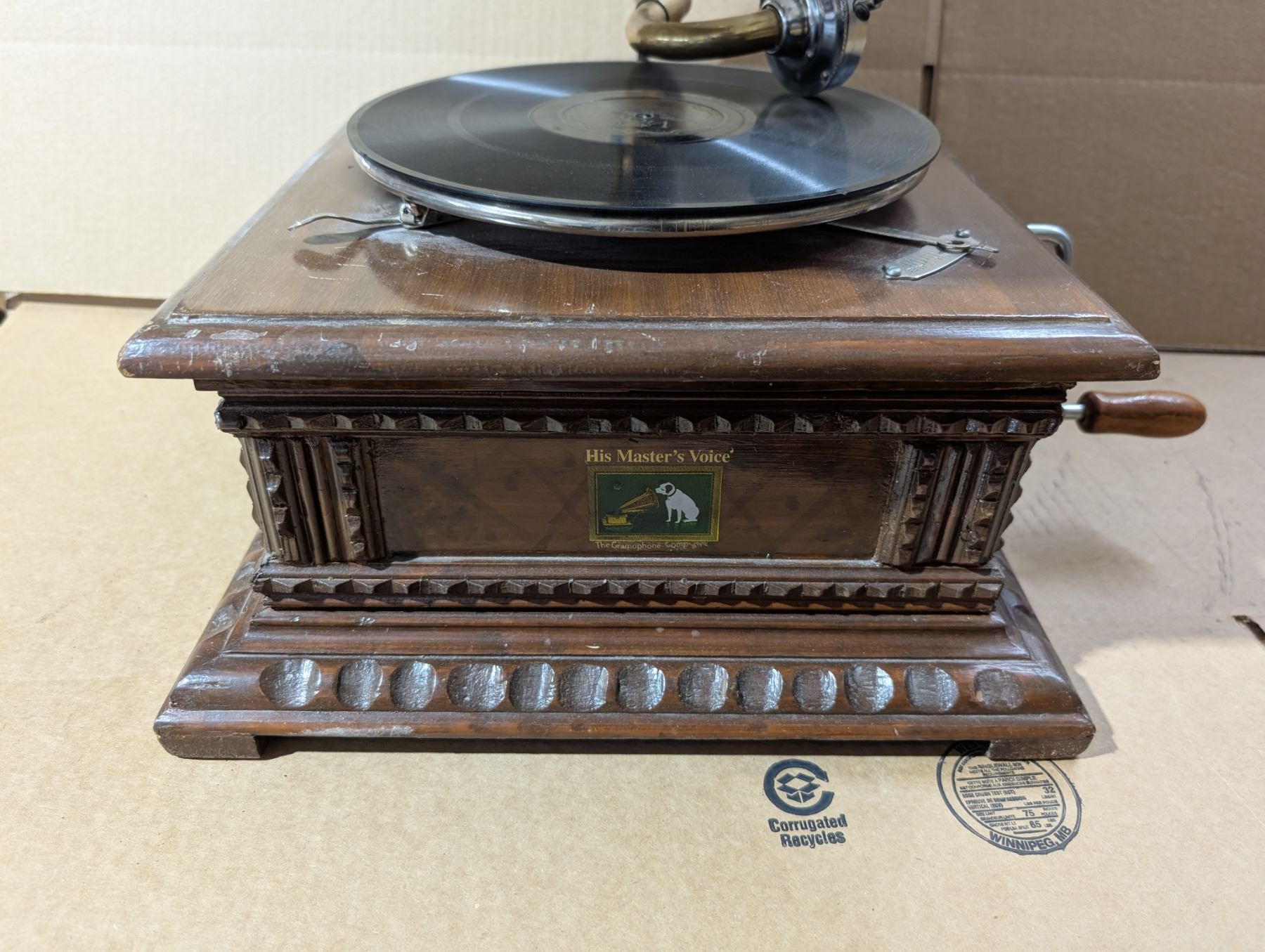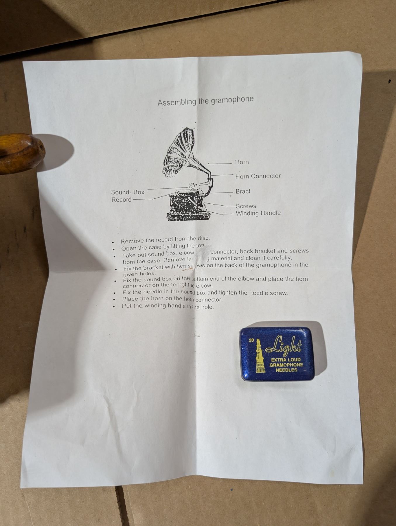 Vintage REPRODUCTION Gramophone w/ Record, Sound Horn, extra Parts, and Original Paper. (WORKS)