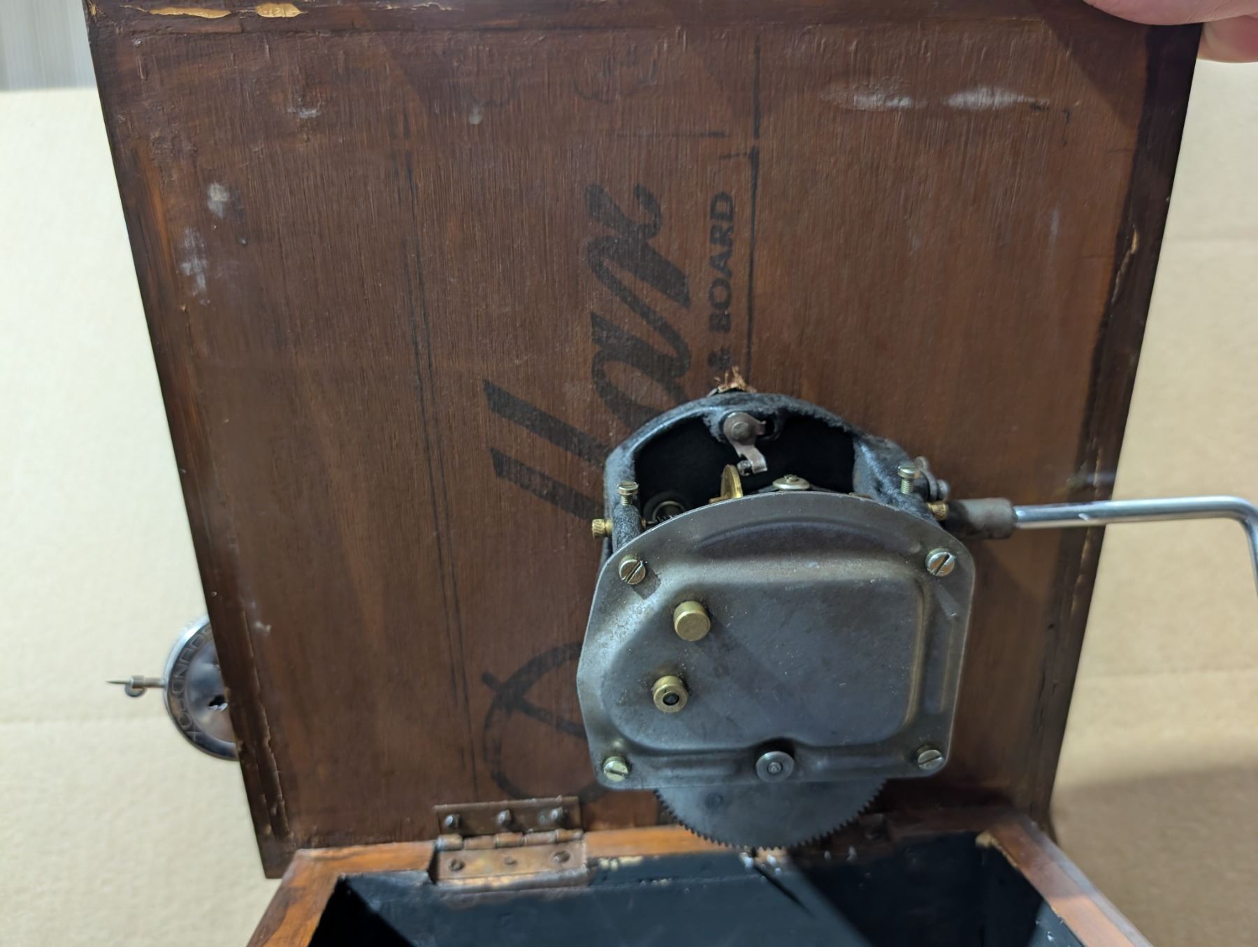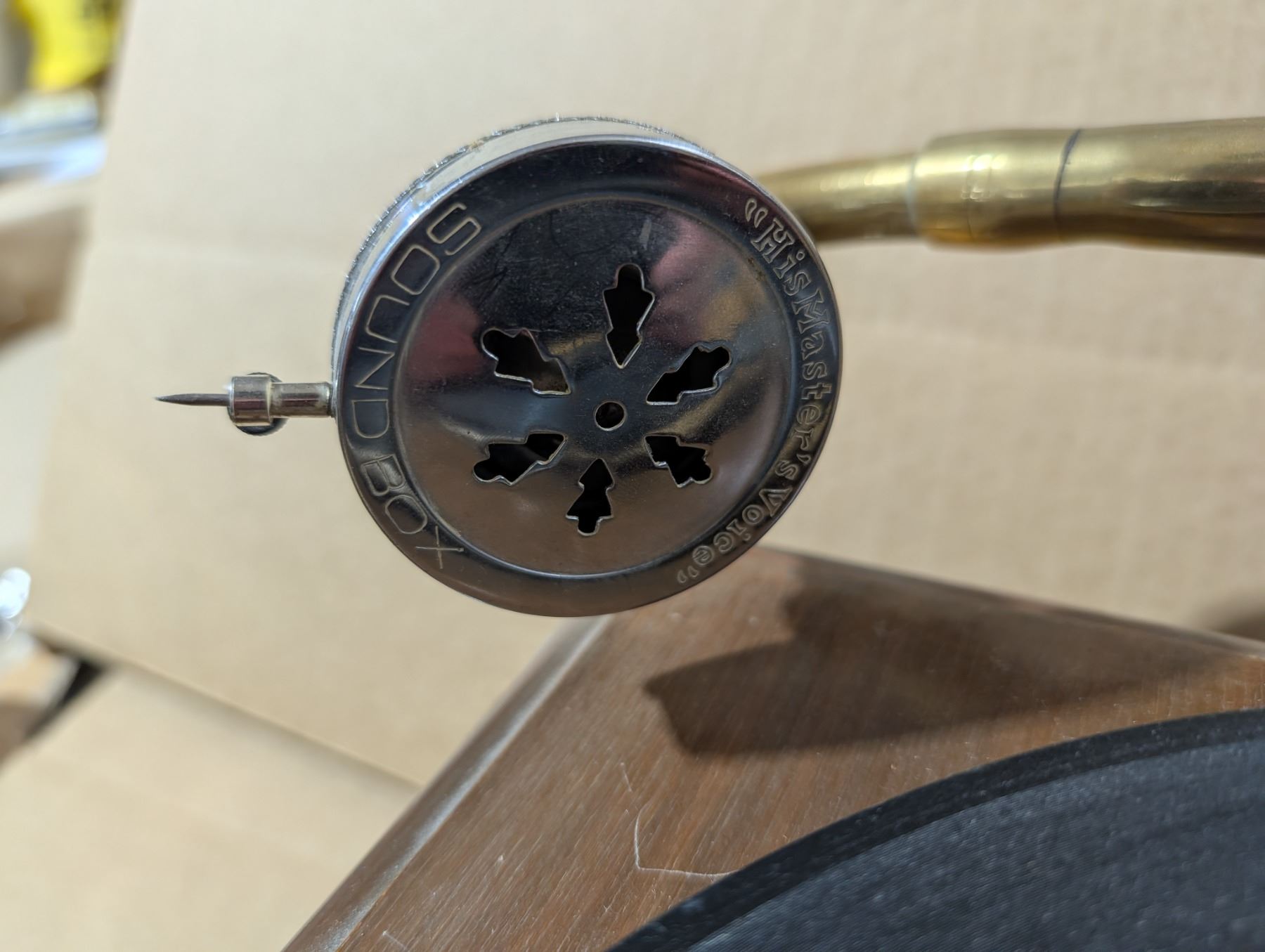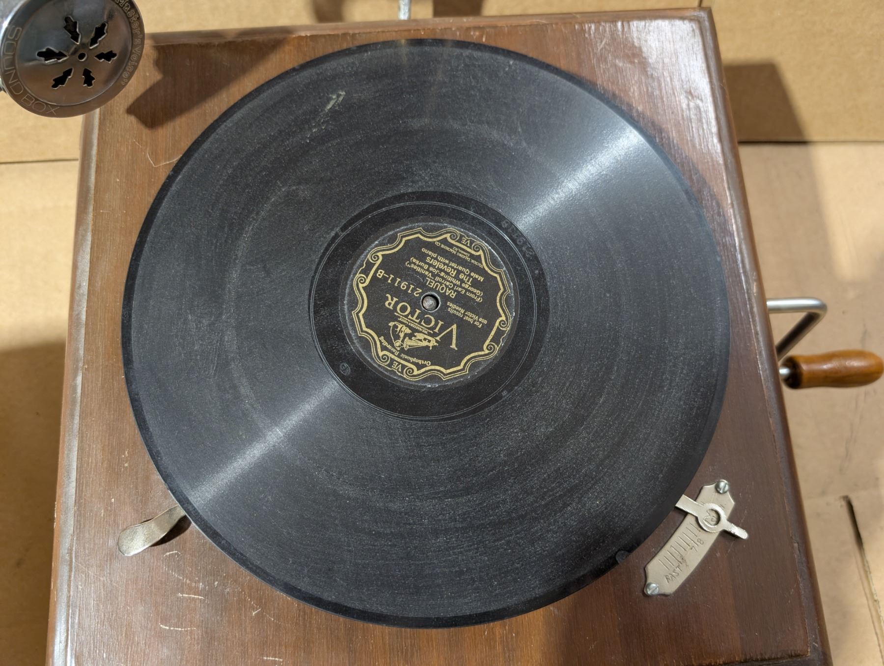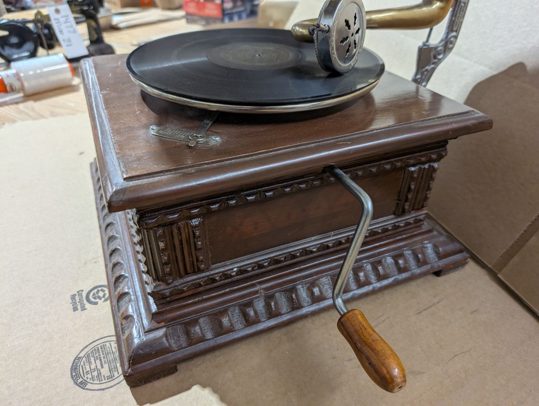 Vintage REPRODUCTION Gramophone w/ Record, Sound Horn, extra Parts, and Original Paper. (WORKS)
