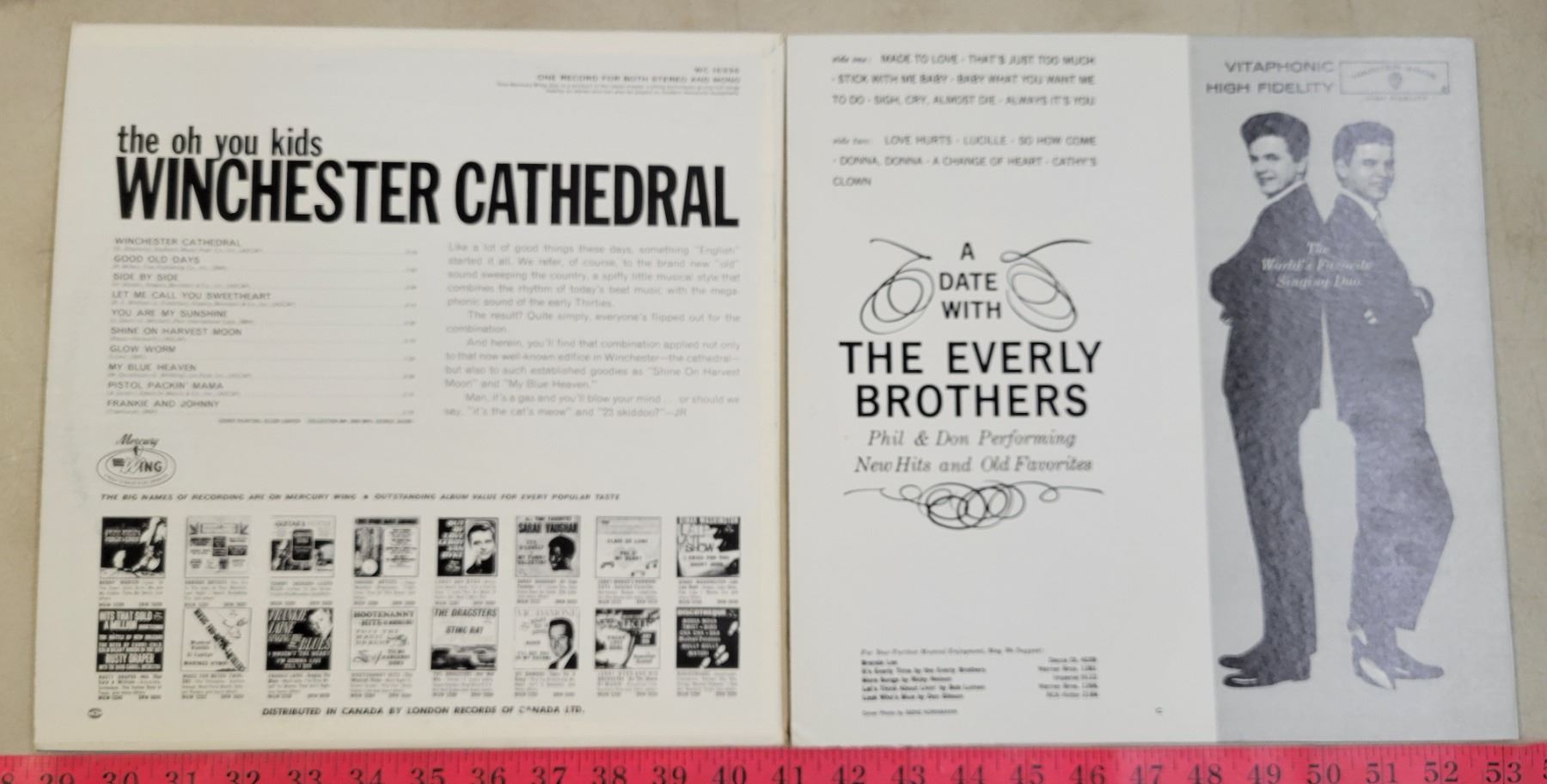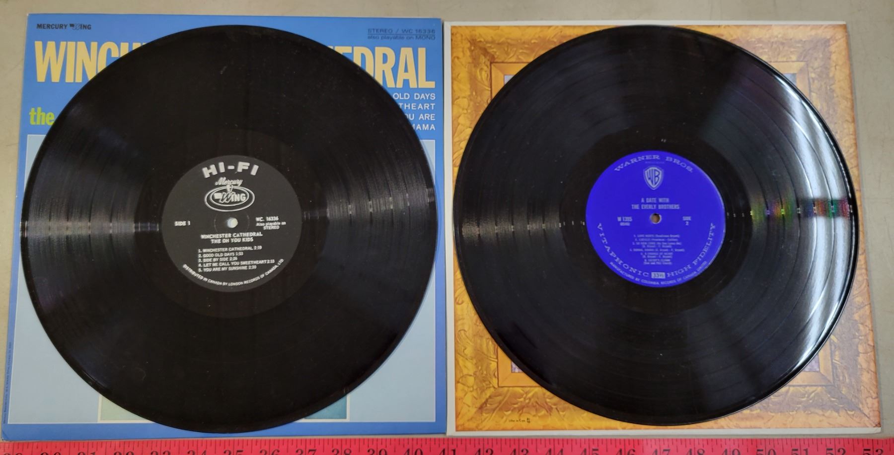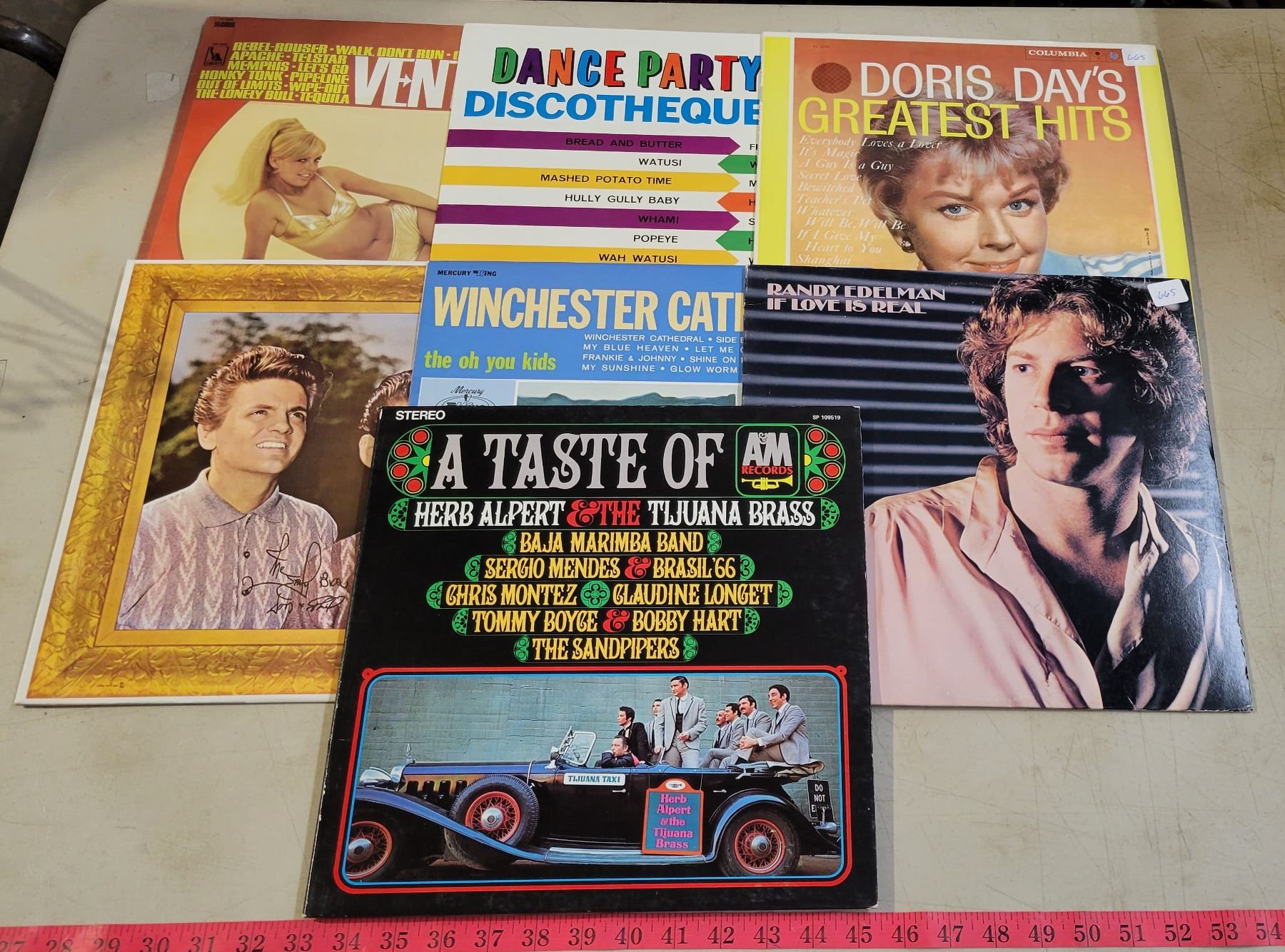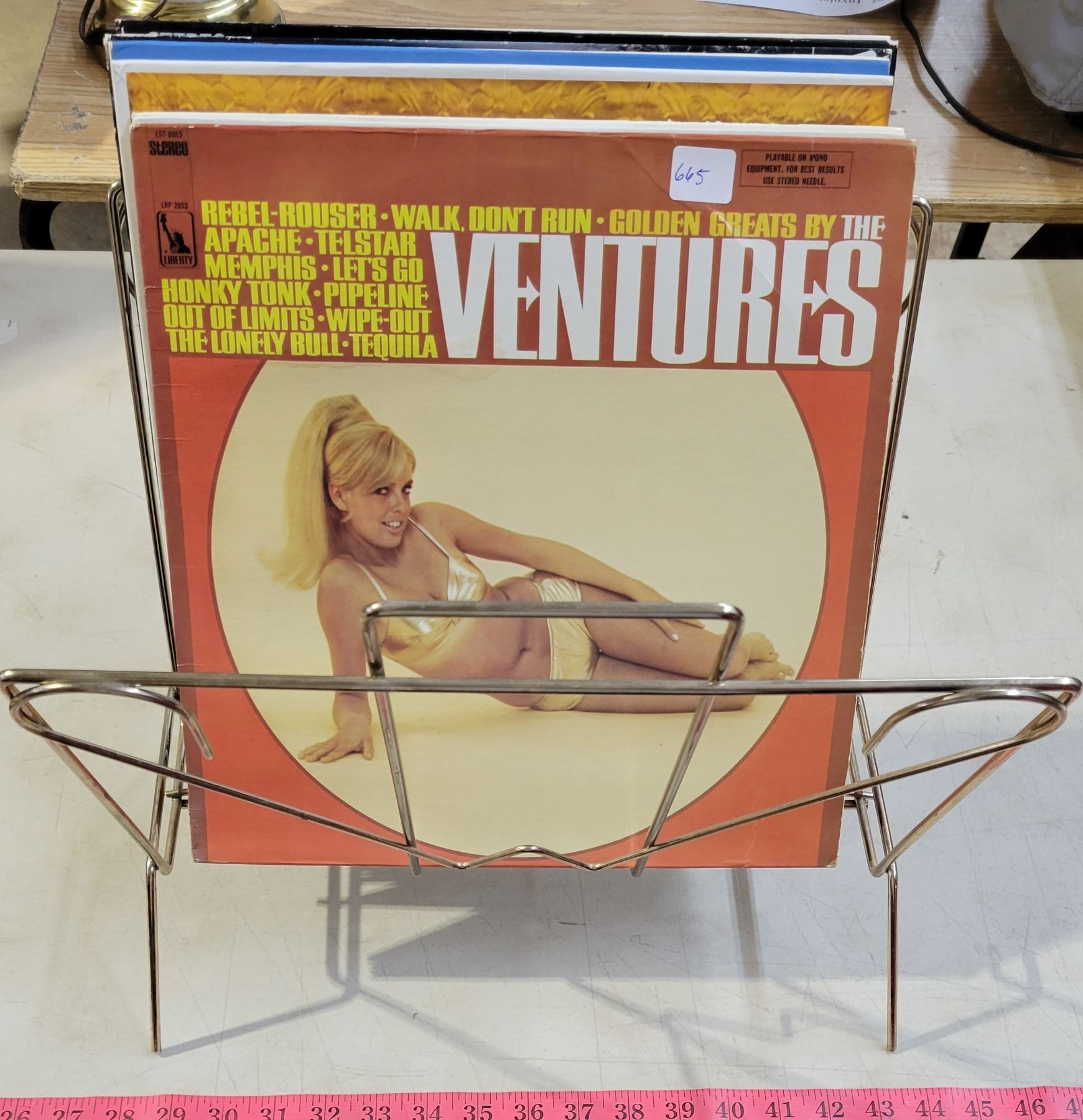 Vintage Record Holder with 7 Records; Ventures, Winchester Cathedral, Everly Brothers, etc.