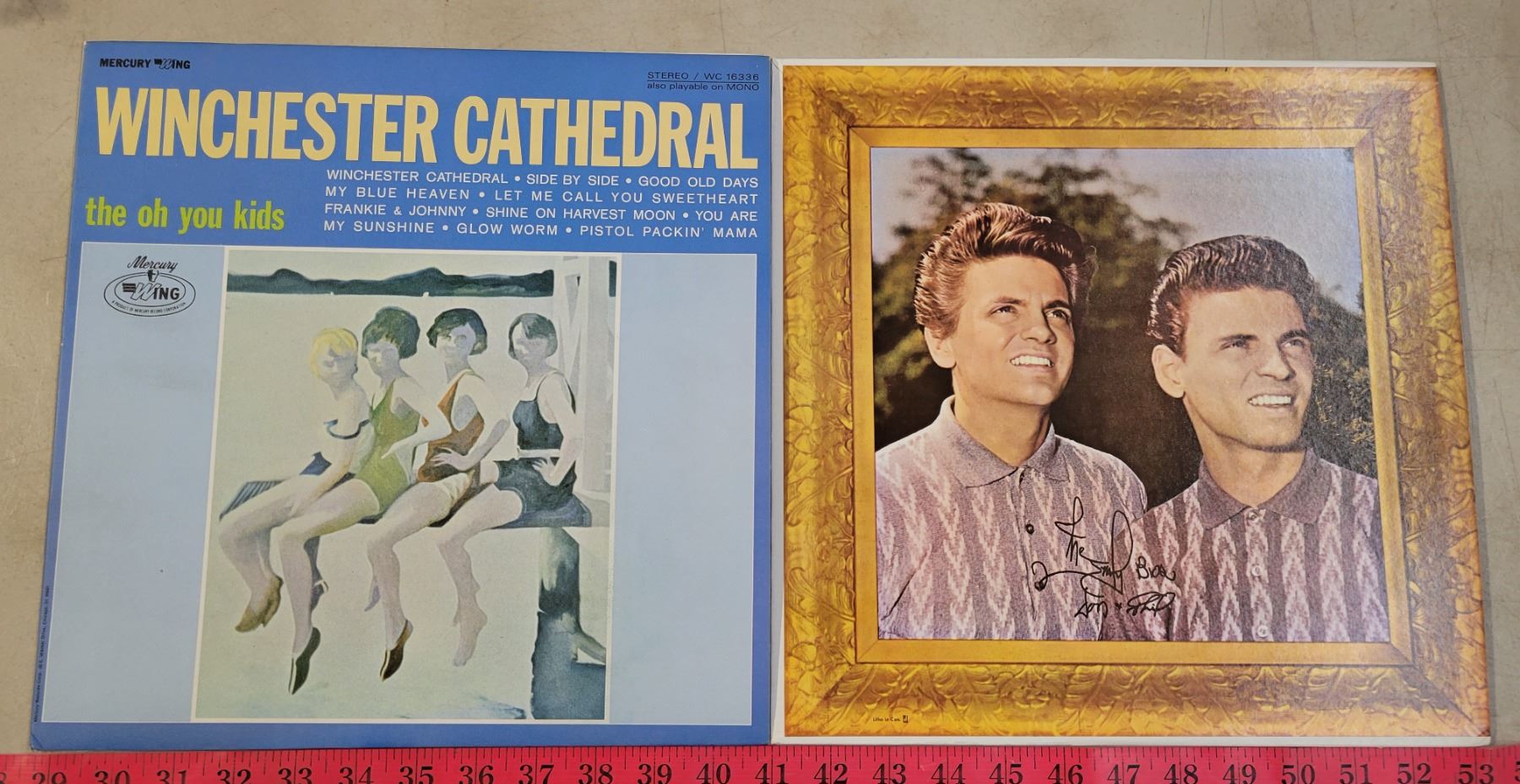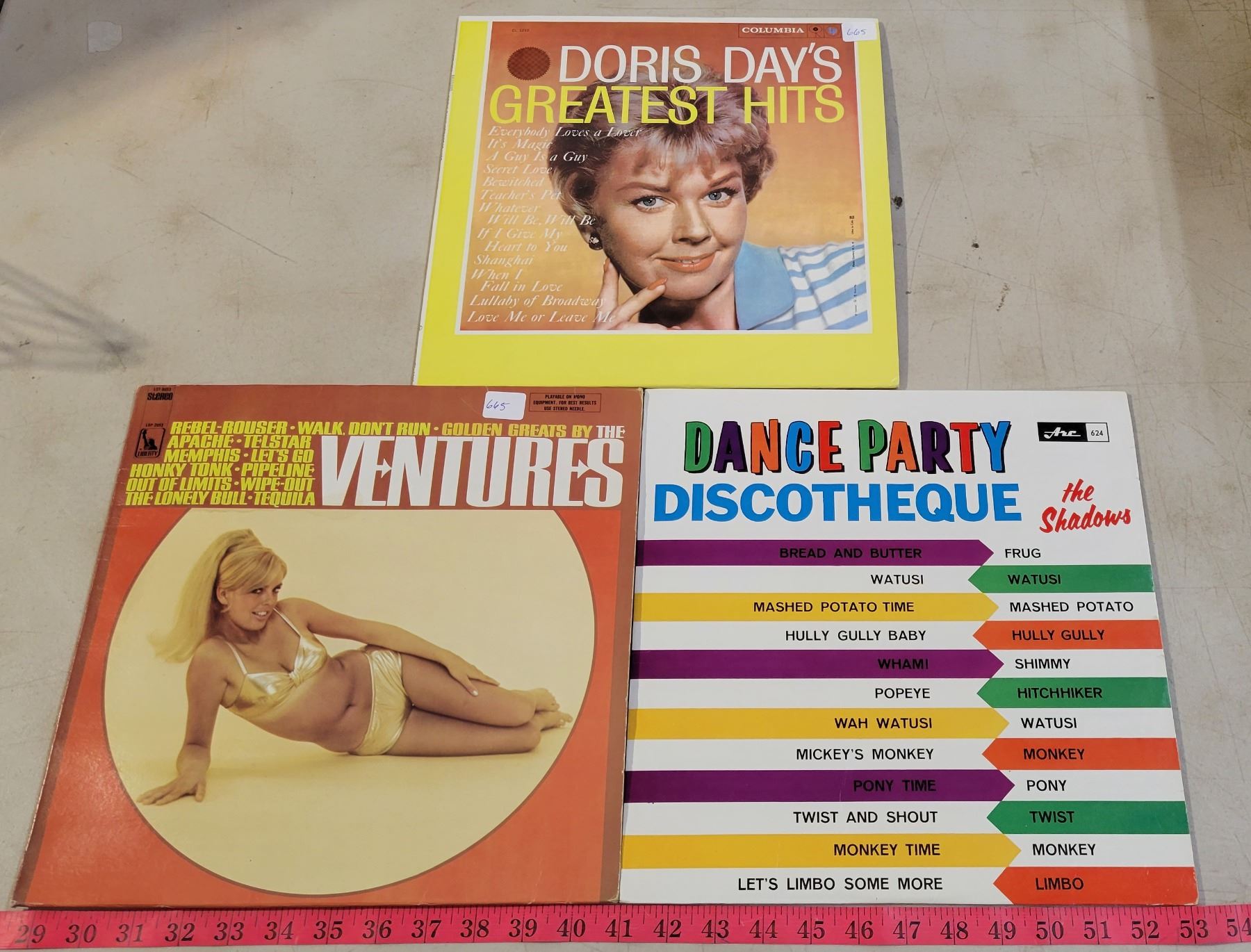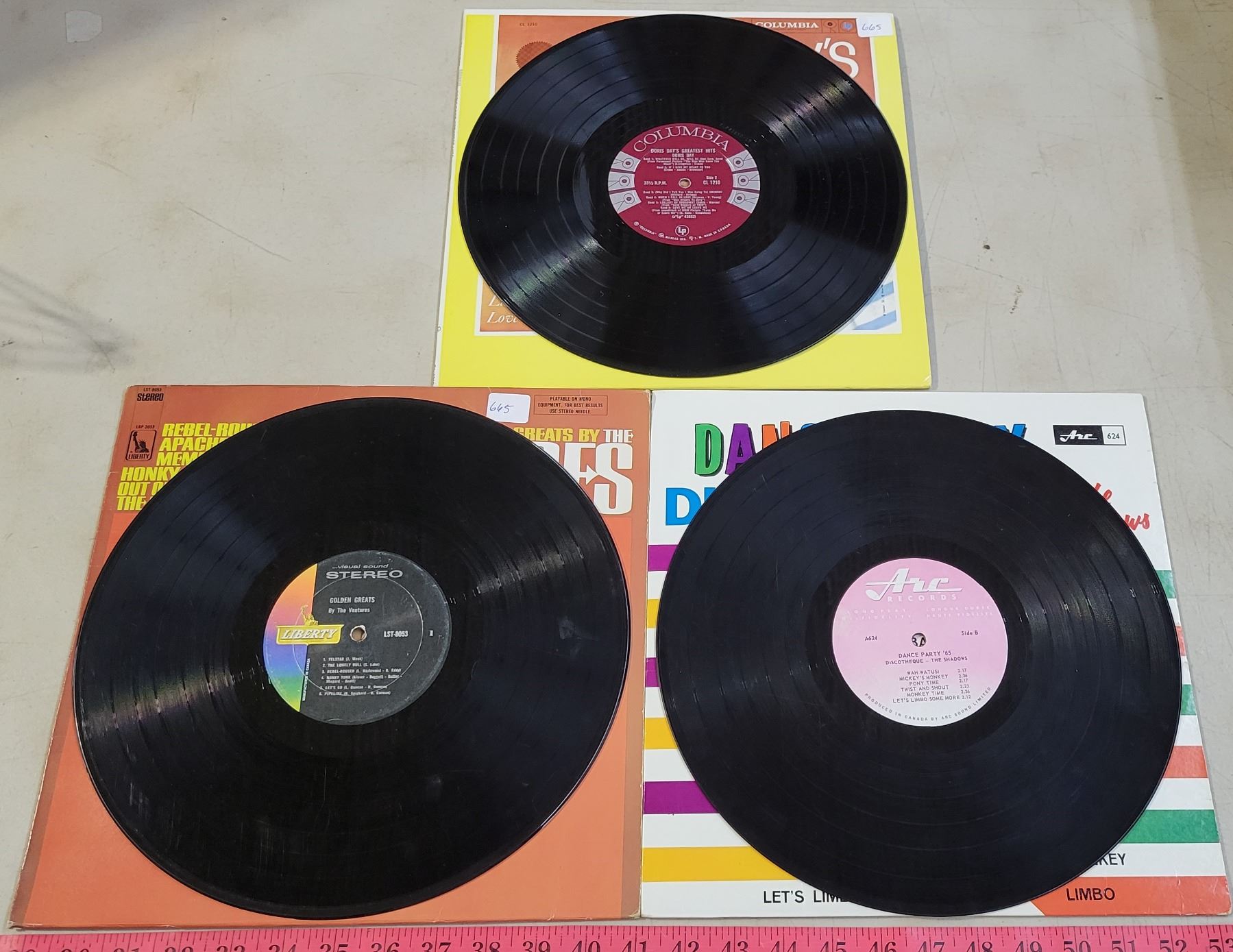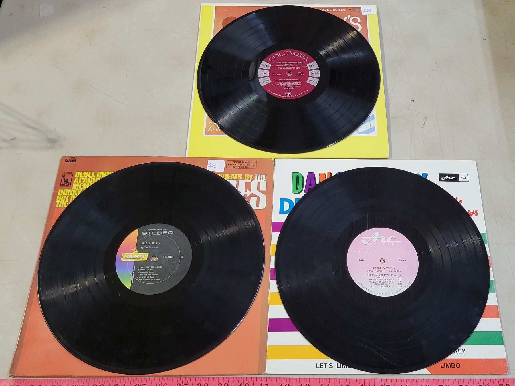Vintage Record Holder with 7 Records; Ventures, Winchester Cathedral, Everly Brothers, etc.