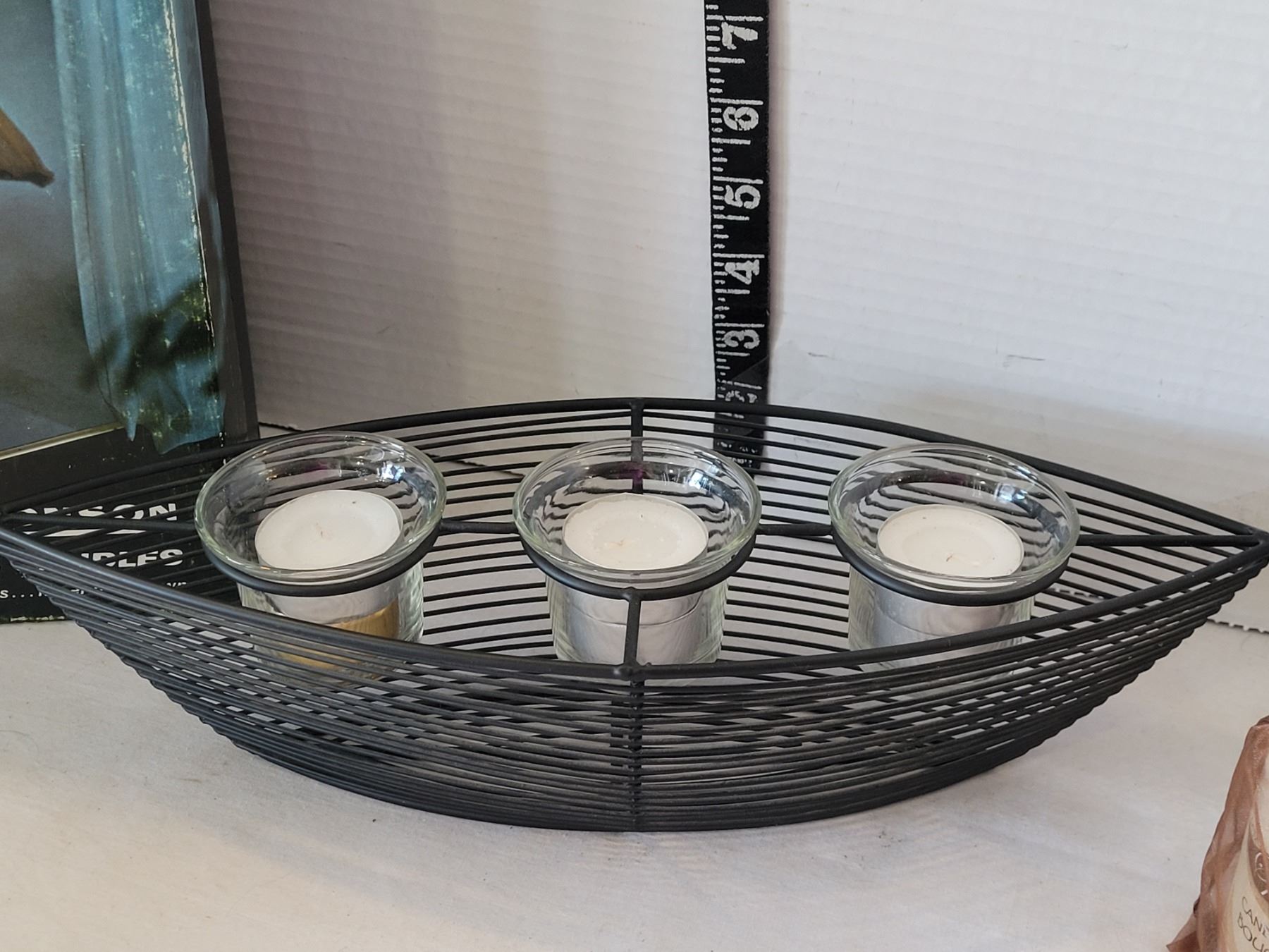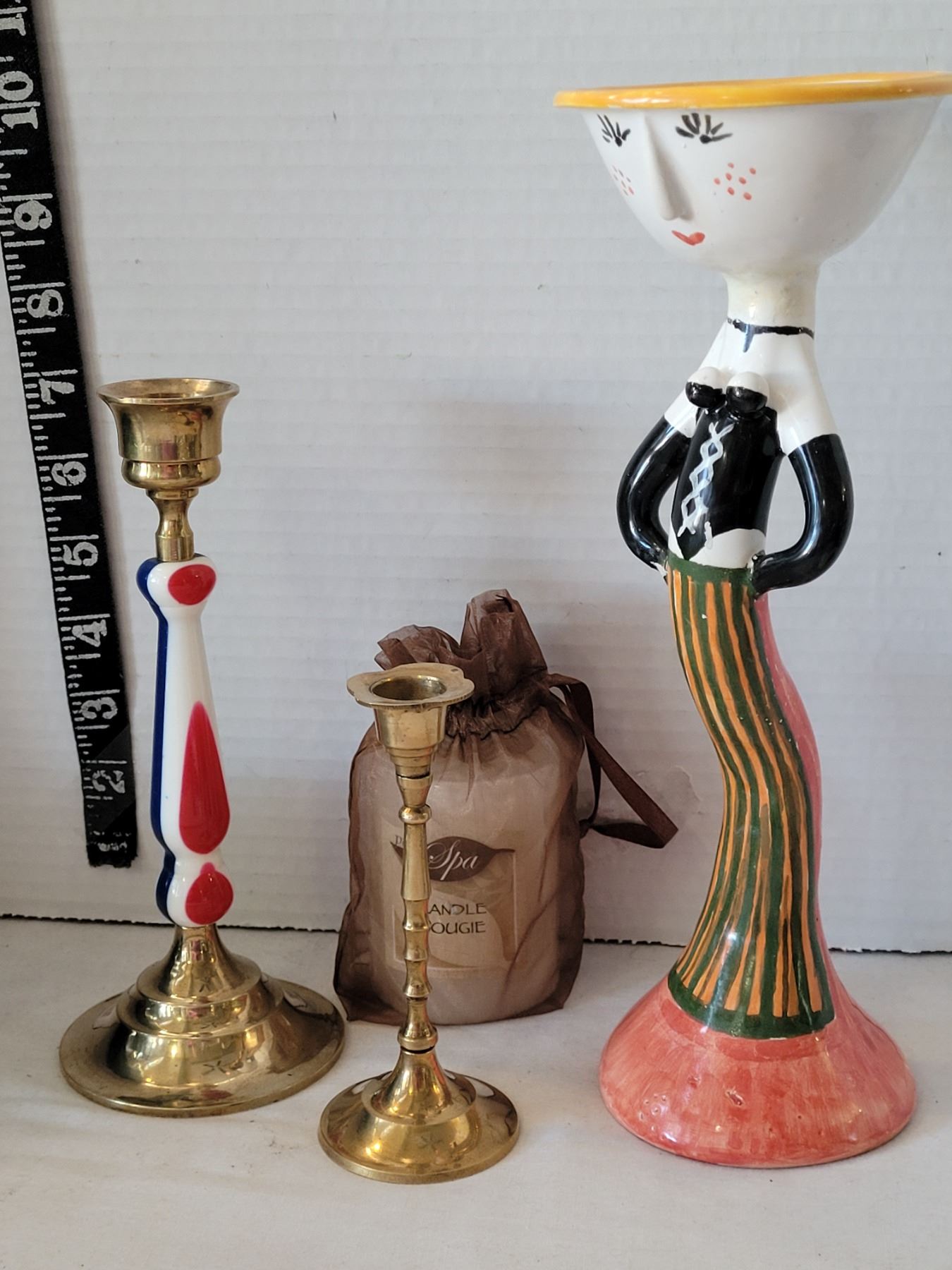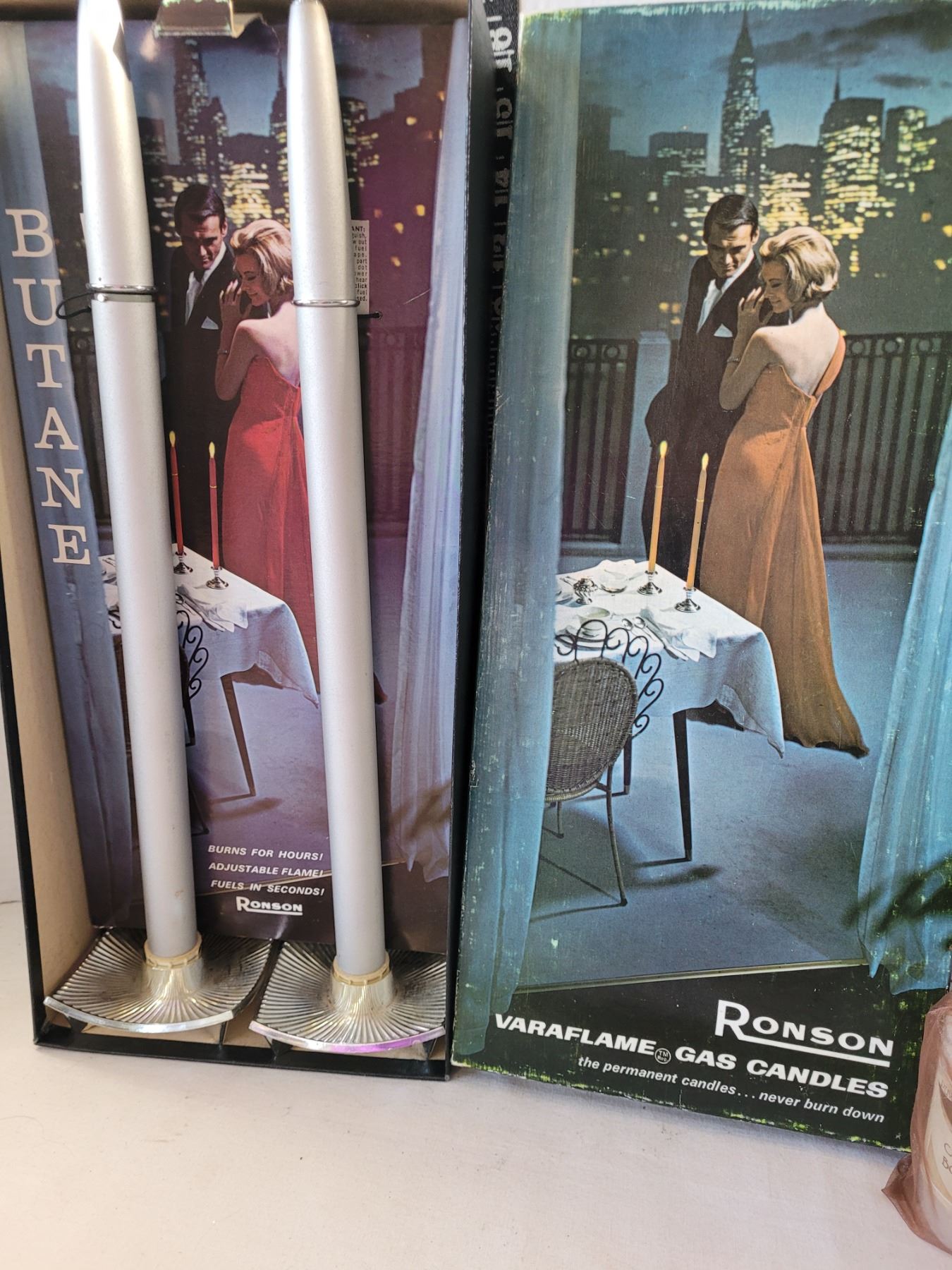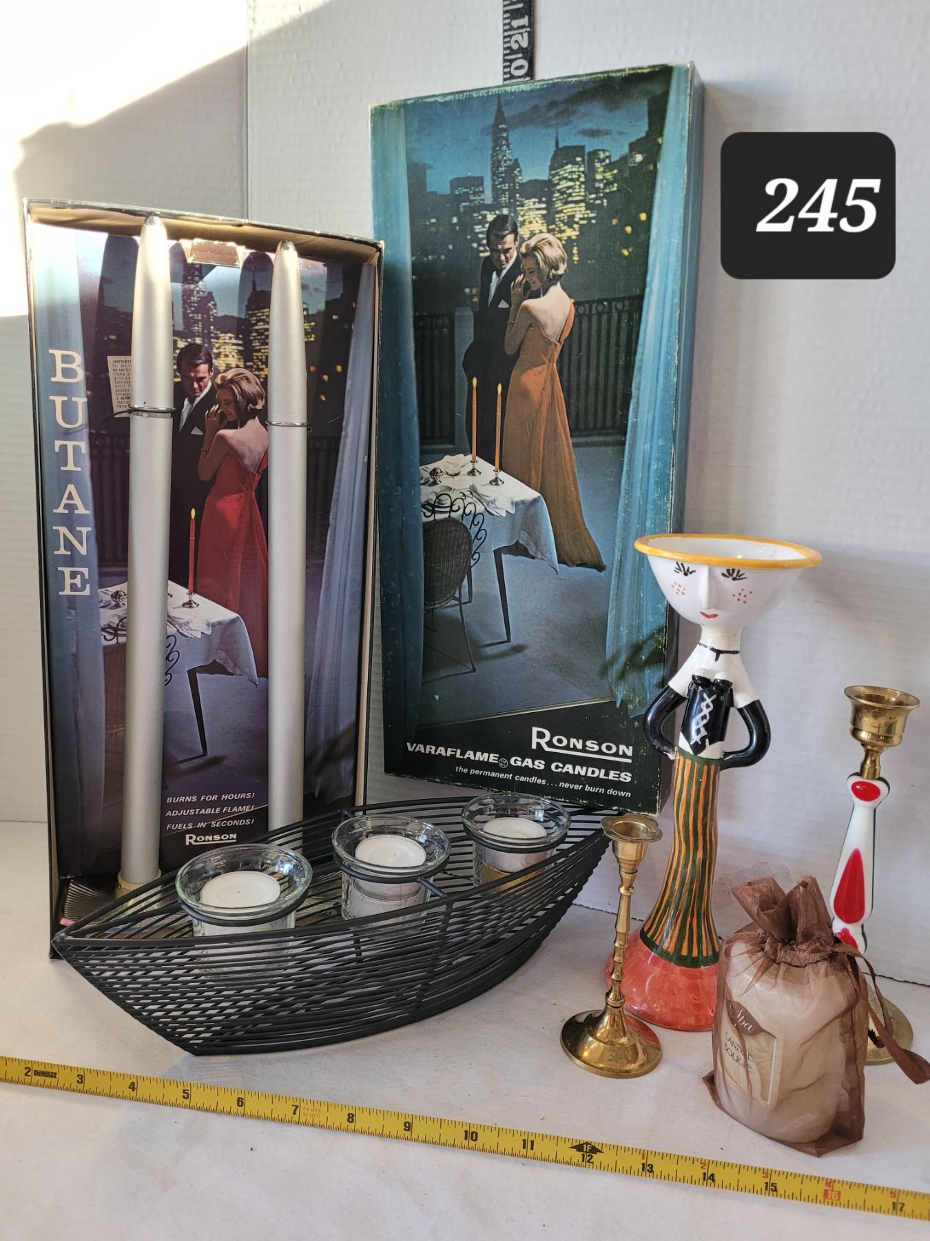 Vintage Ronson varaflame gas candles, brass candle sticks & boat style votive holder.