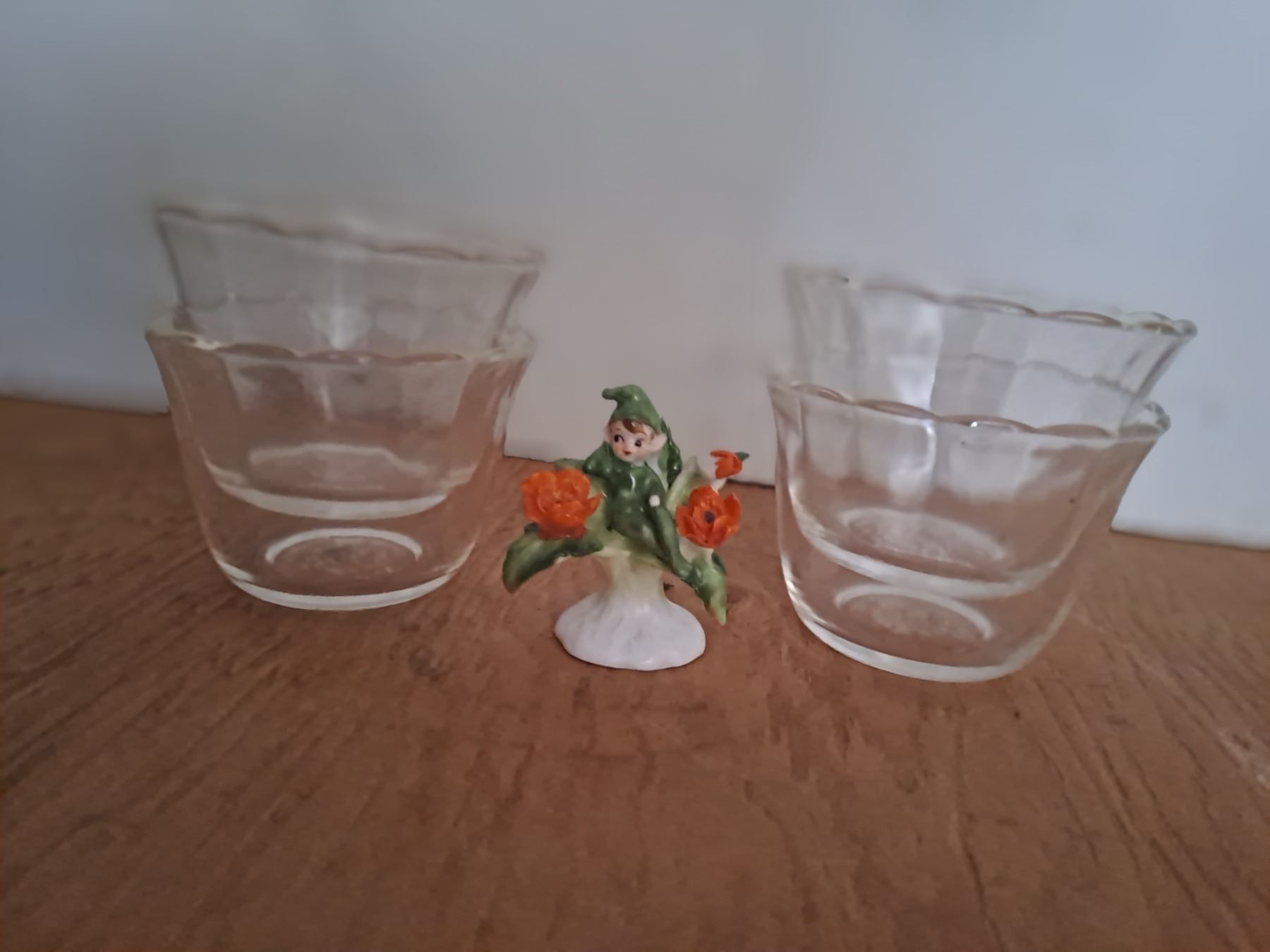 Vintage Set of four Fire King Desert Fruit Bowls and Vintage Cute Kawaii Ceramic Kitsch big eye fiddle green flower pixie Santa