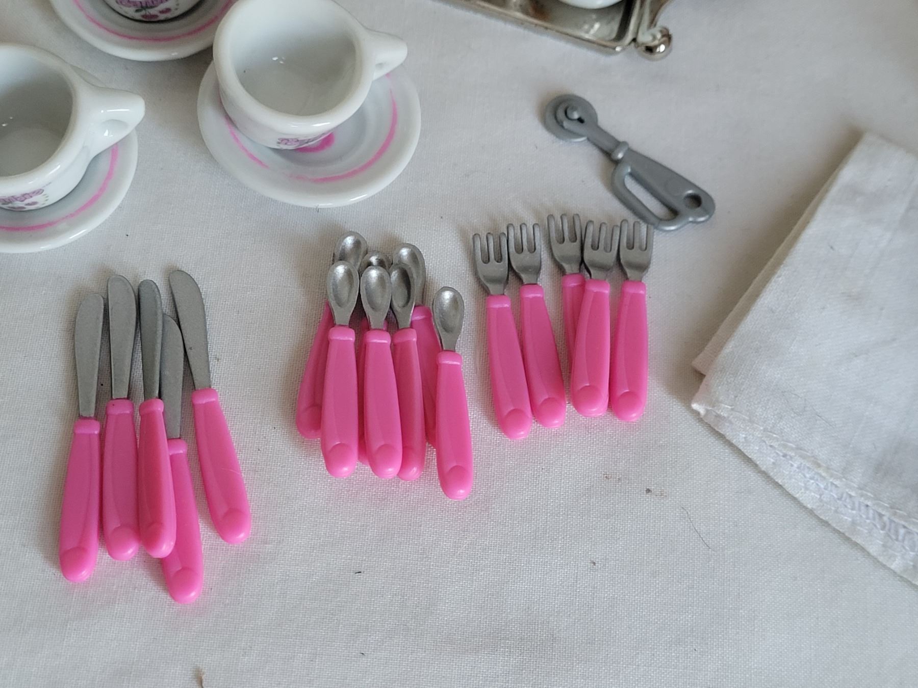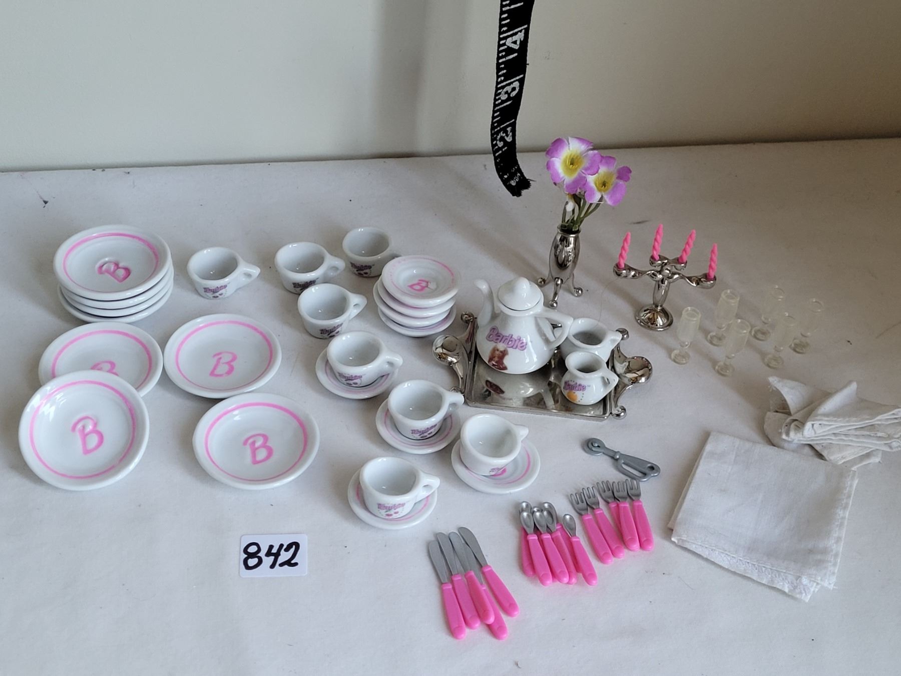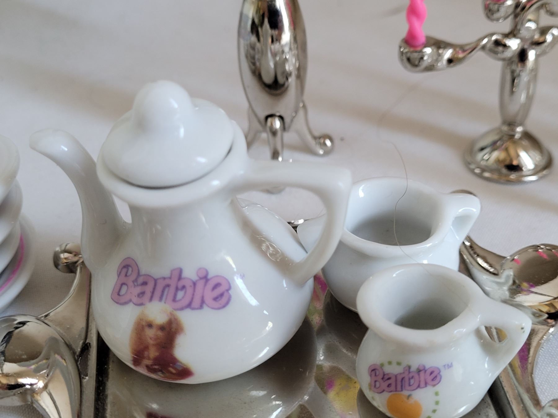 Vintage Strombecker Barbie porcelain dishes, metal tray,vase, & candelabra, table cloth, napkins & c