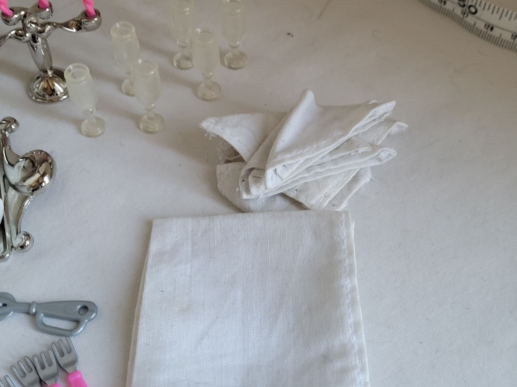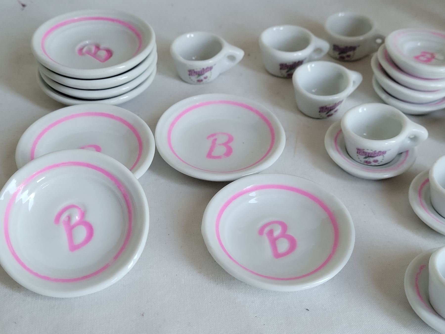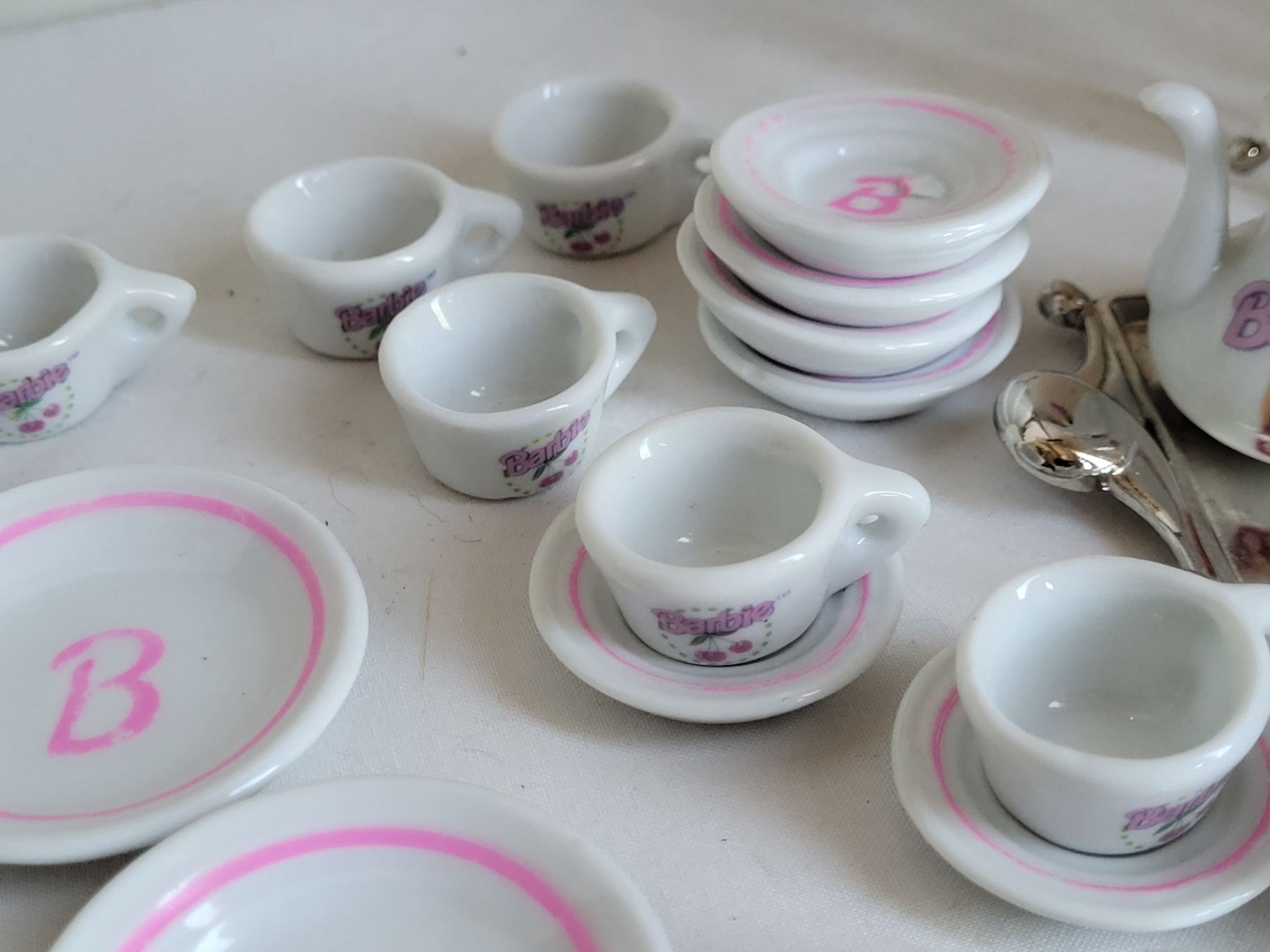 Vintage Strombecker Barbie porcelain dishes, metal tray,vase, & candelabra, table cloth, napkins & c