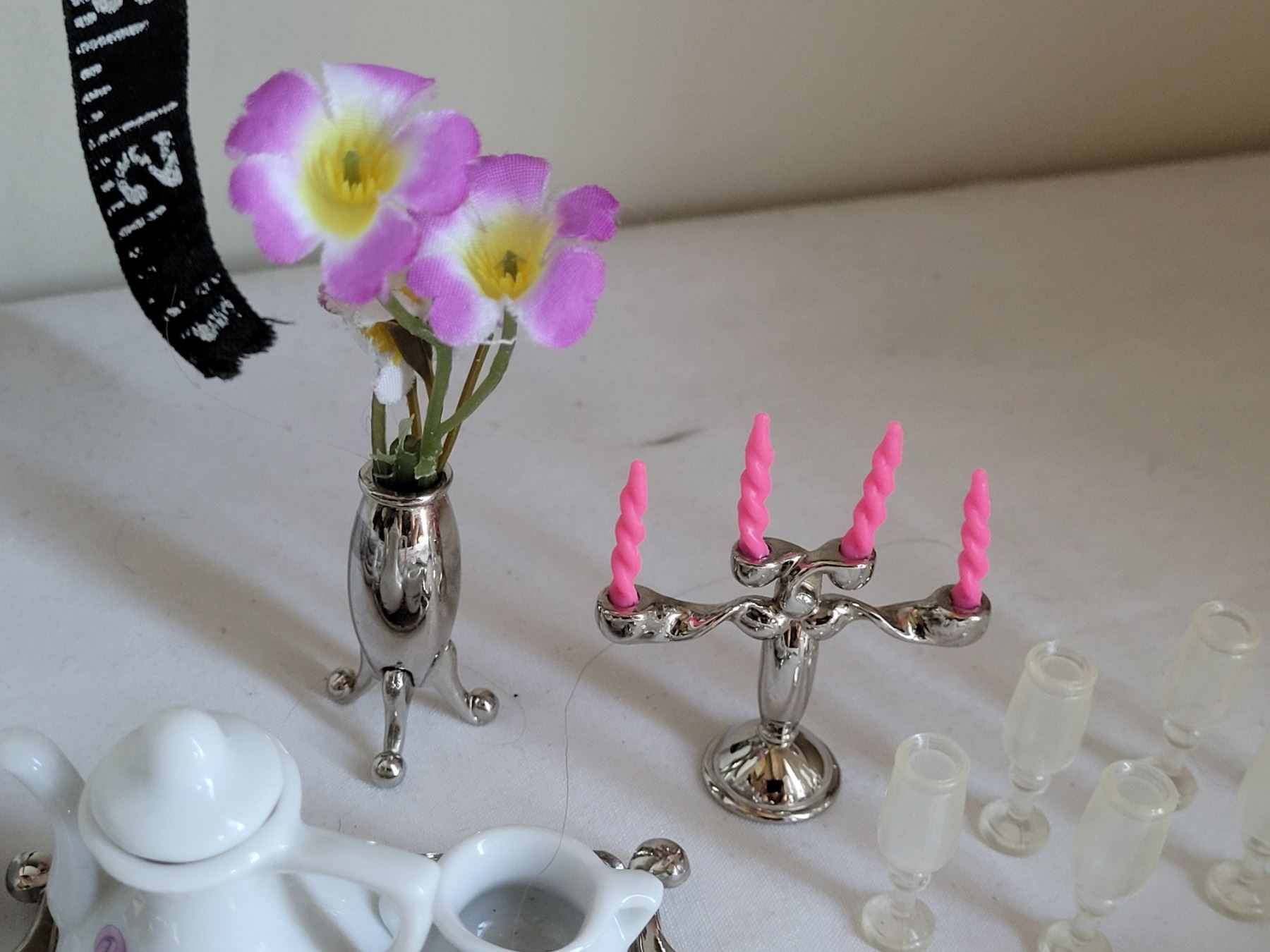 Vintage Strombecker Barbie porcelain dishes, metal tray,vase, & candelabra, table cloth, napkins & cutlery.