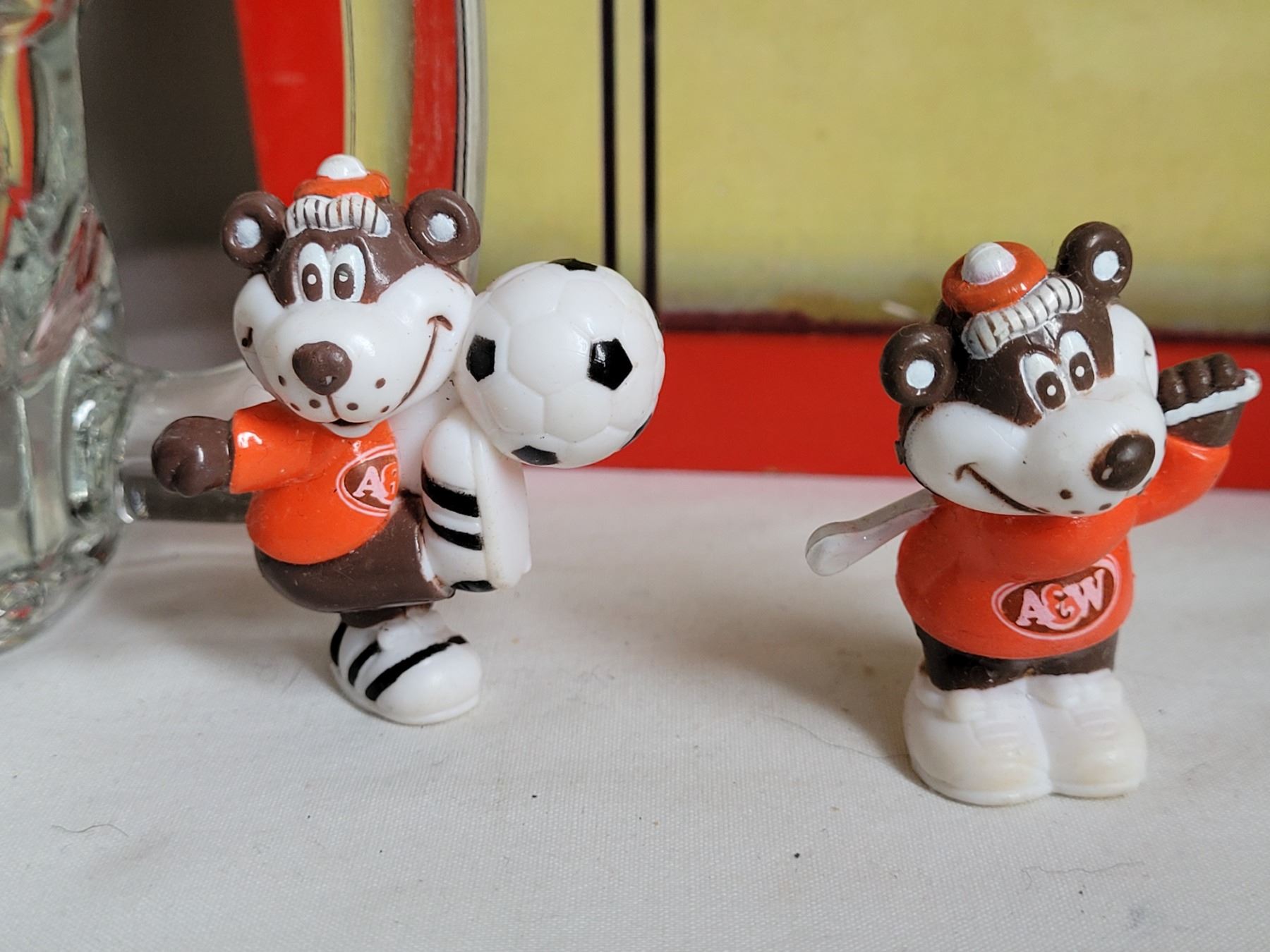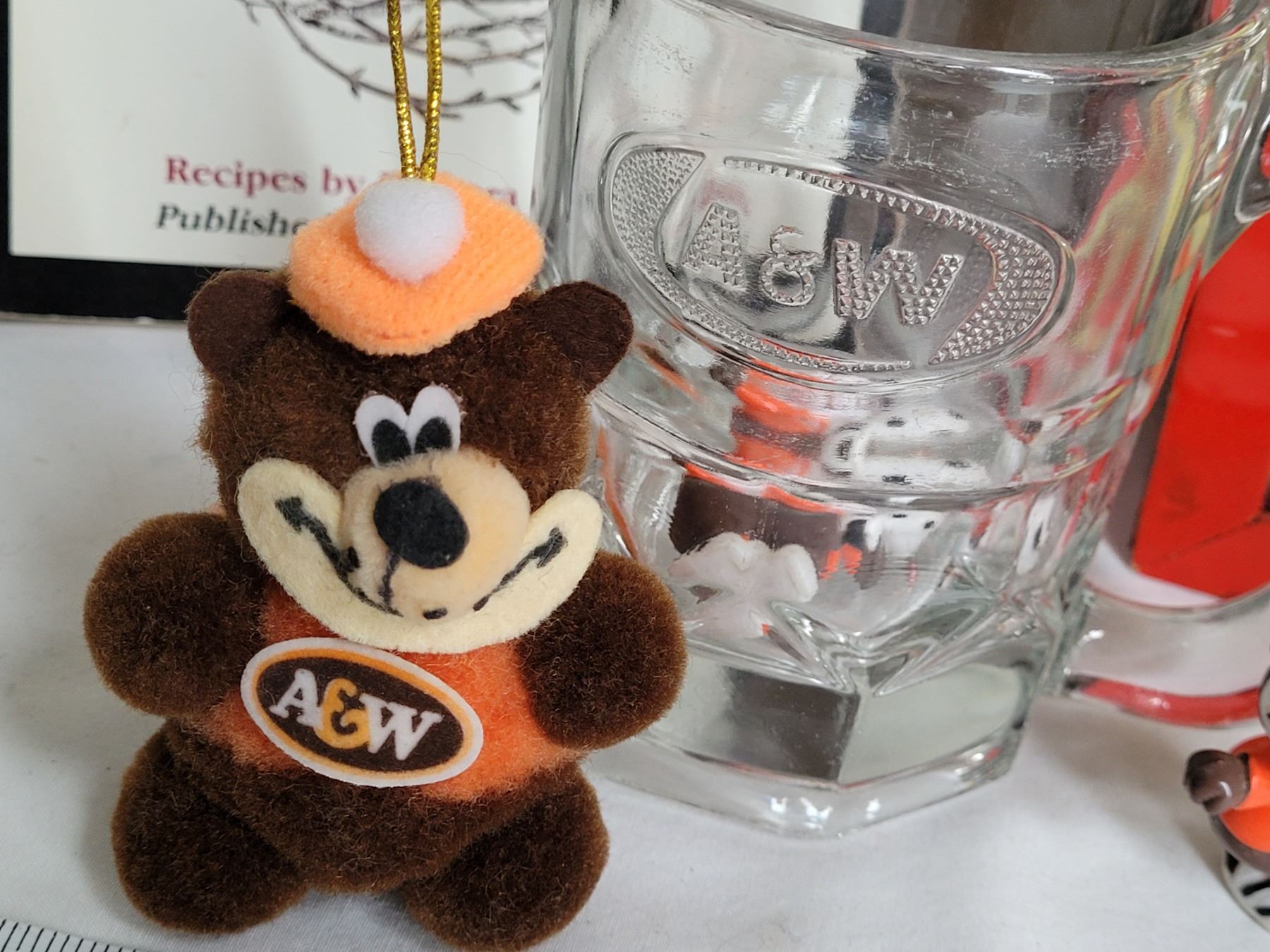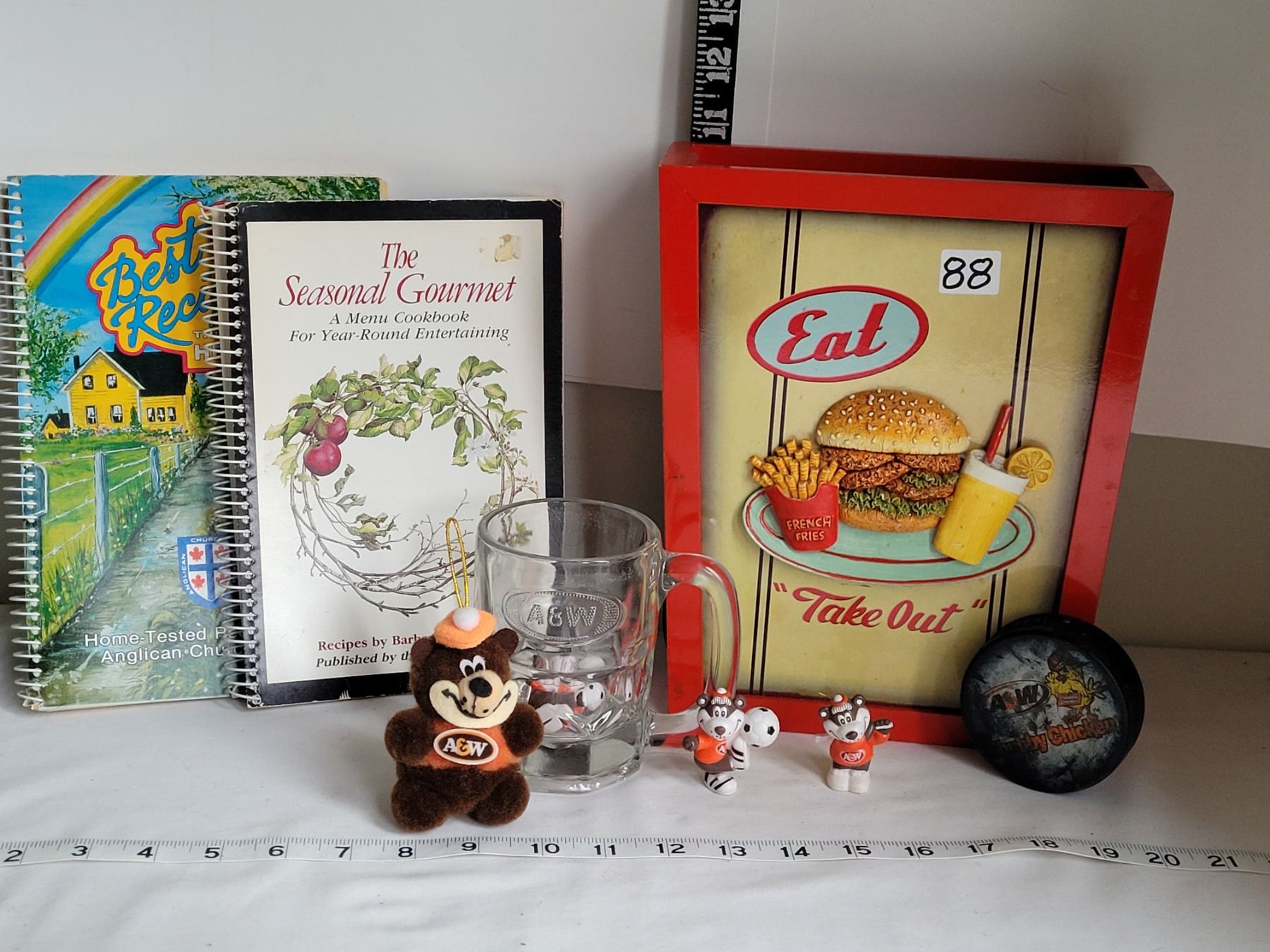 Vintage Take Out menu box, A&W mug, mascot root bear, Chubby Chicken hockey puck & recipe books.