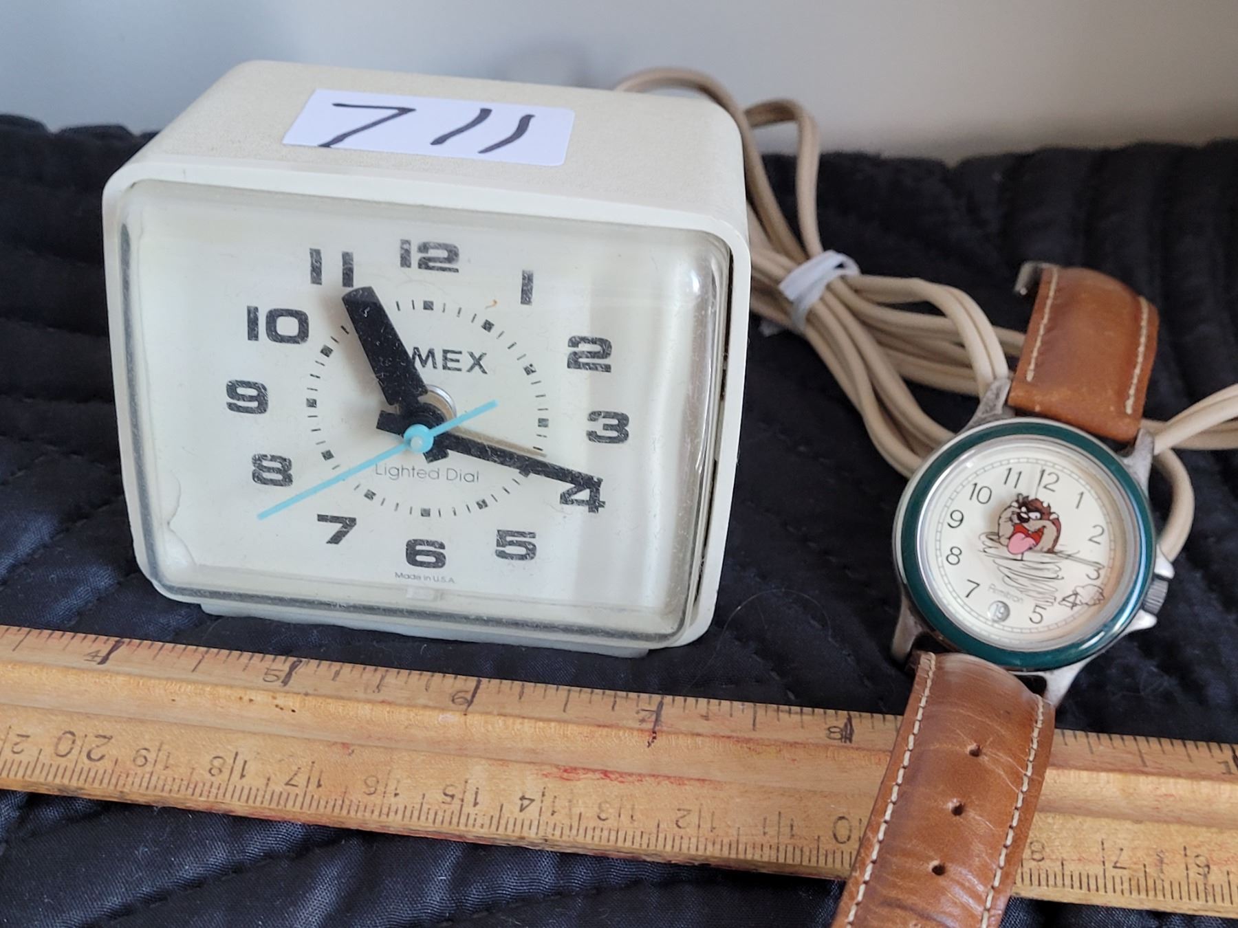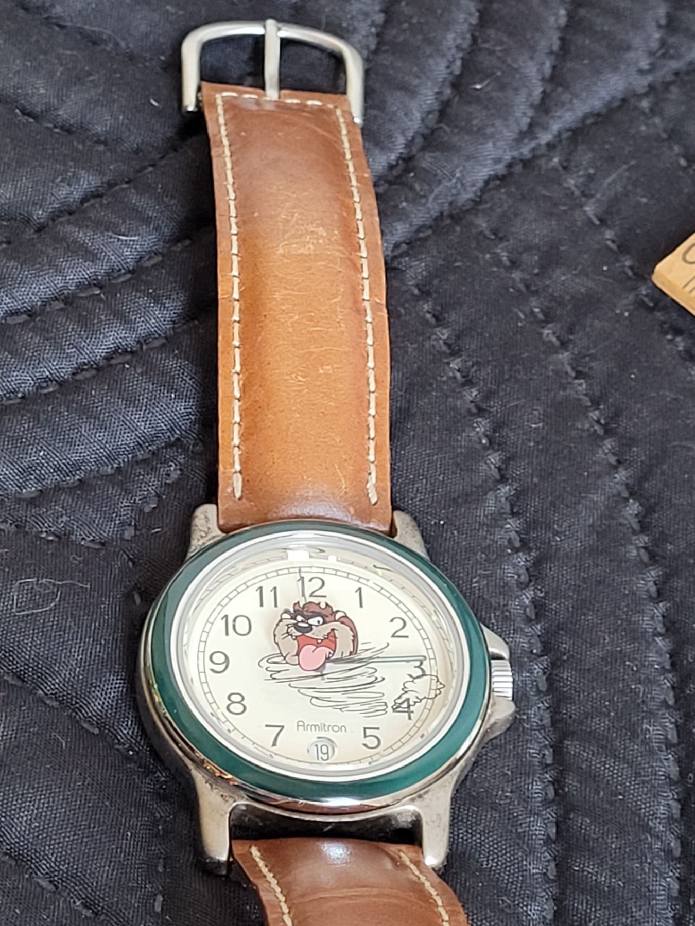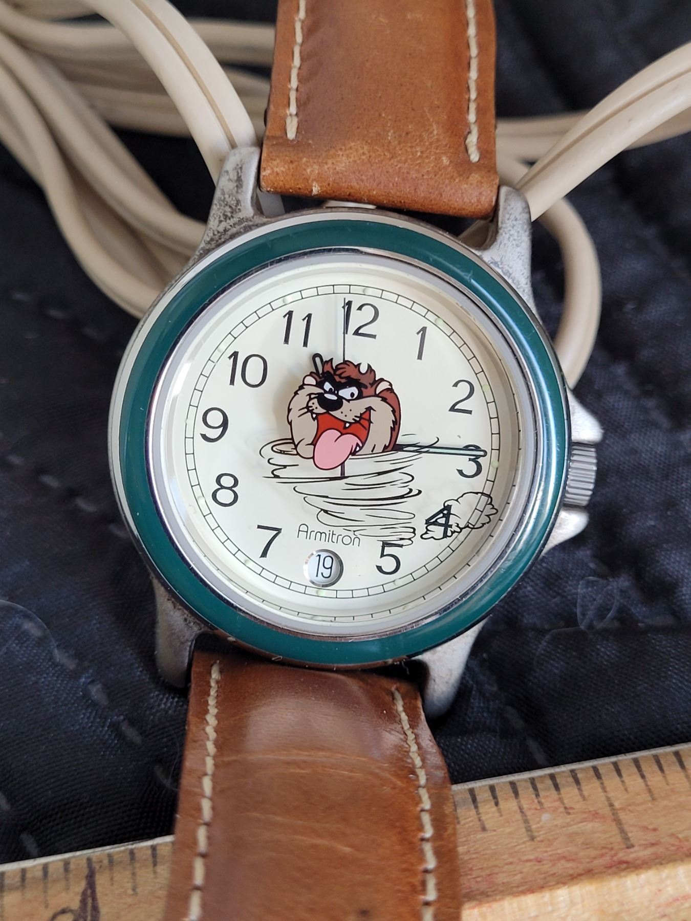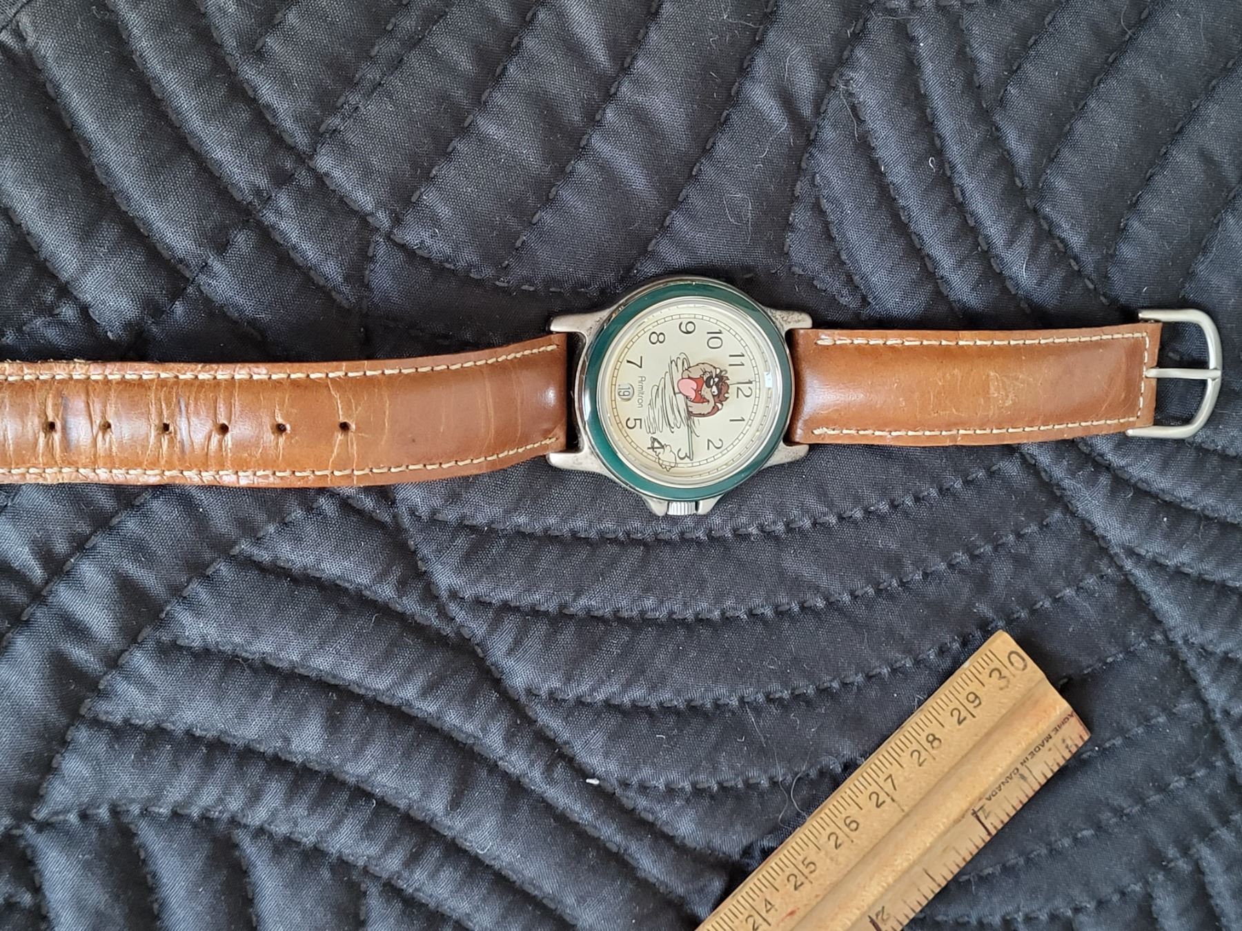 Vintage Timex clock. (working) Tasmanian Devil watch on a leather strap.