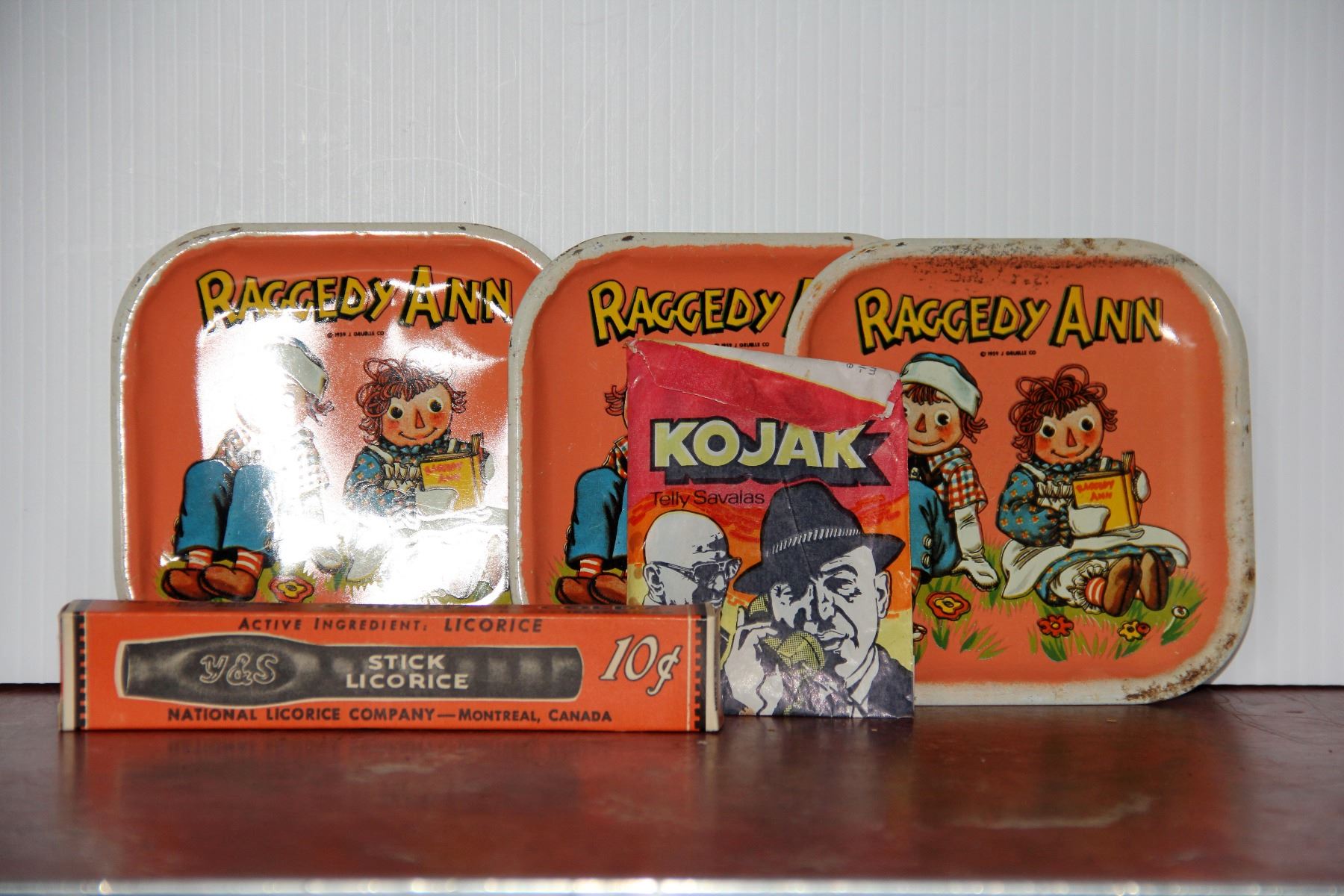 Vintage Tin Toy Raggety Ann Plates, Kojak Bubble Gum and Licorice Stick
