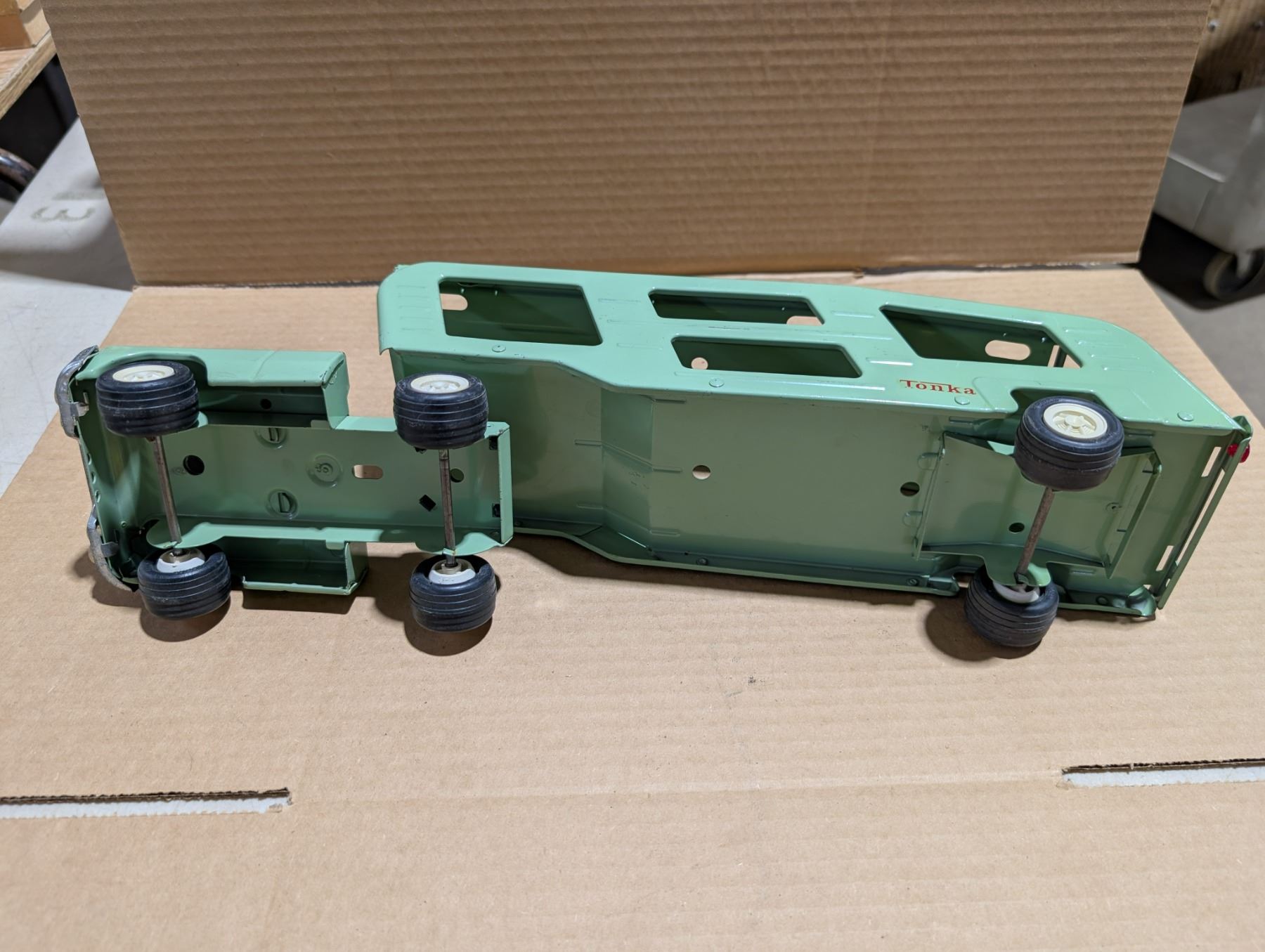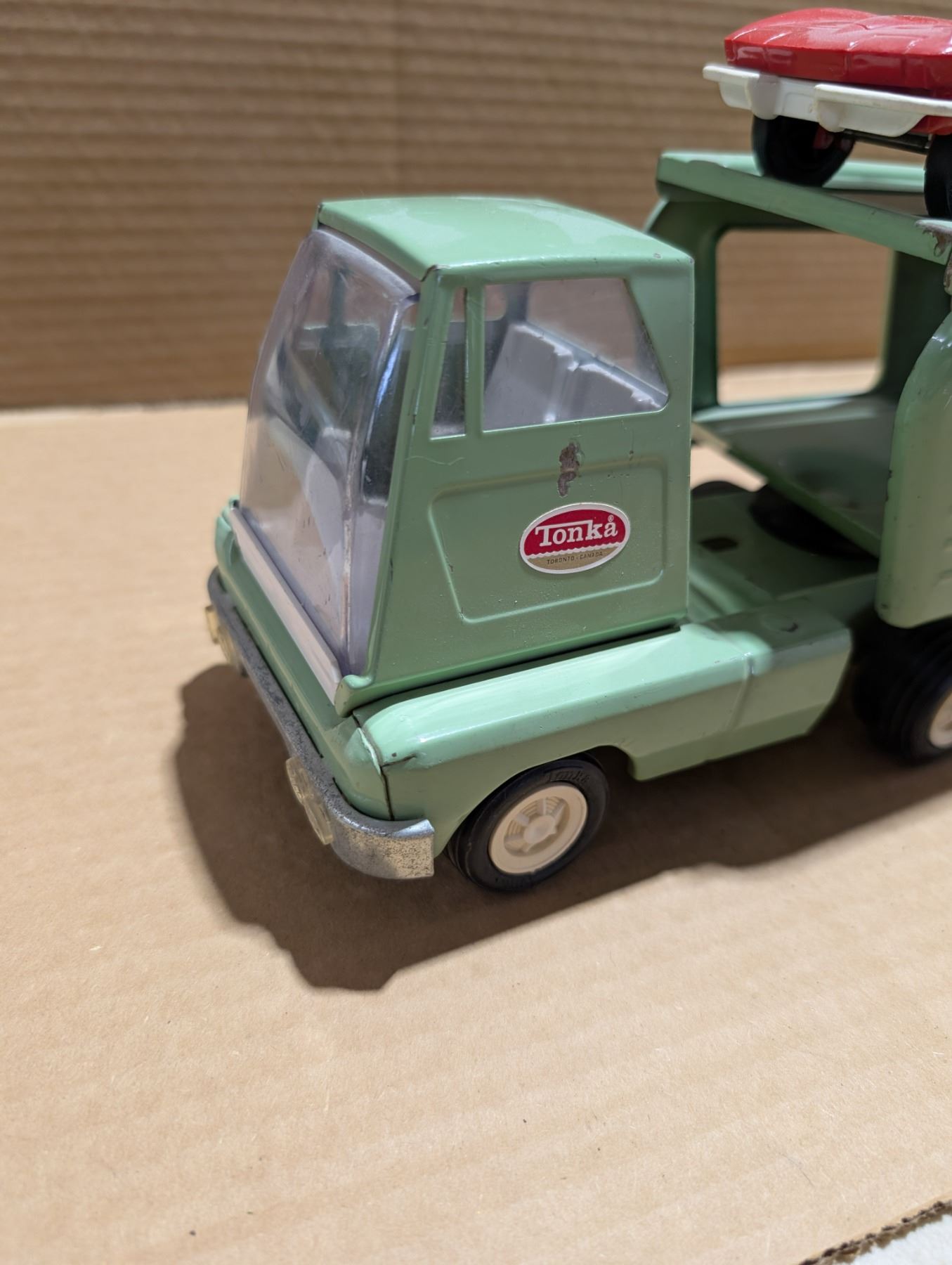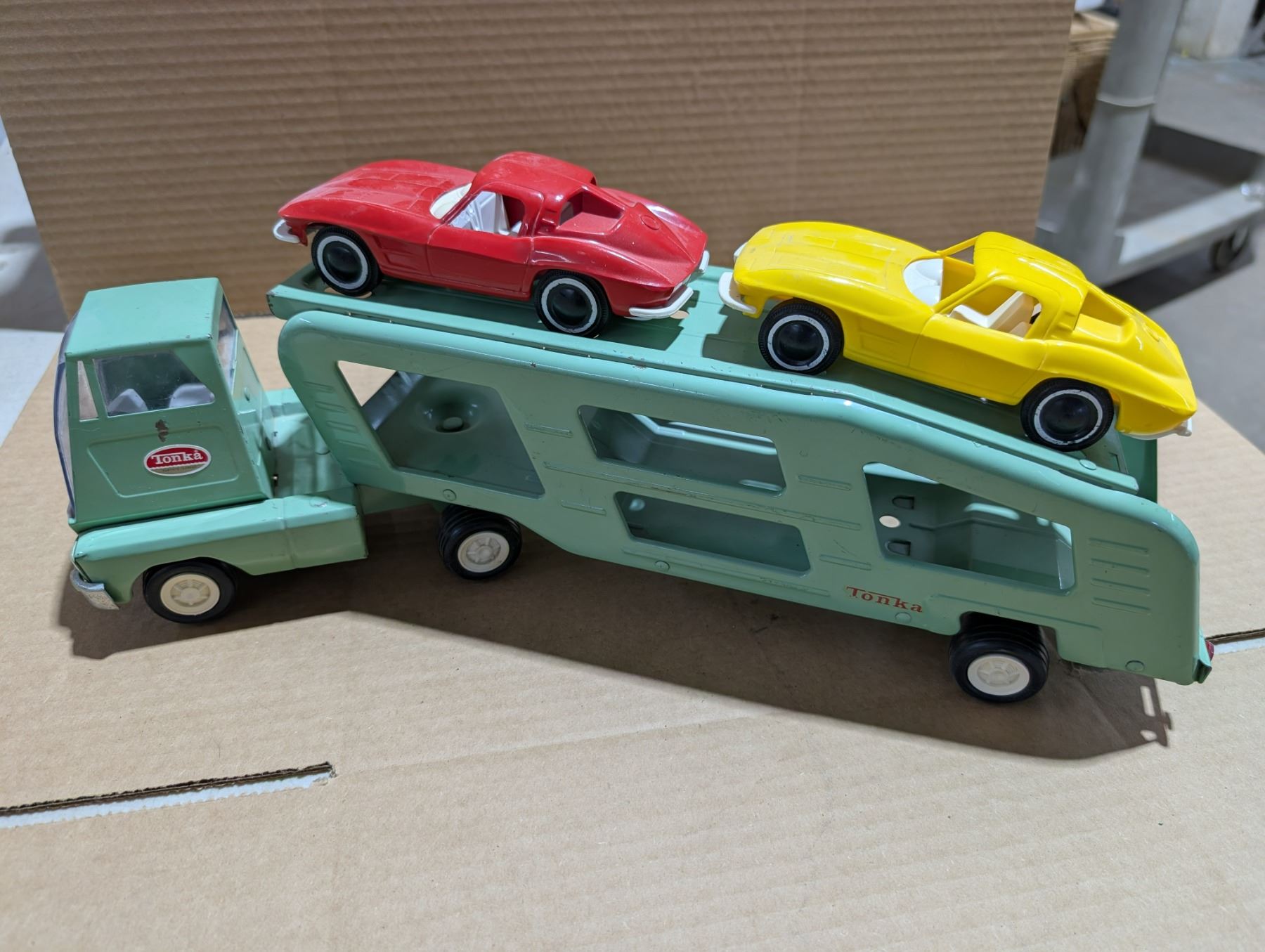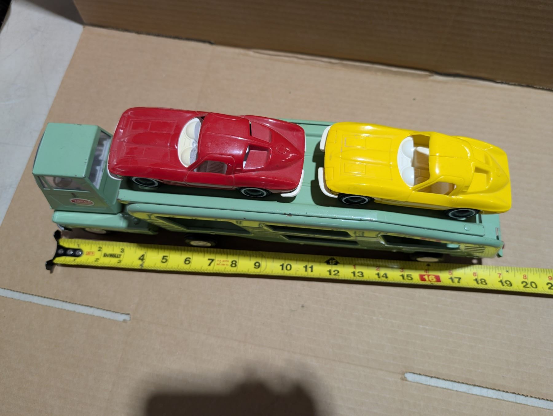 Vintage Tonka Truck w/ Automotive Transport and (2) Plastic toy Cars
