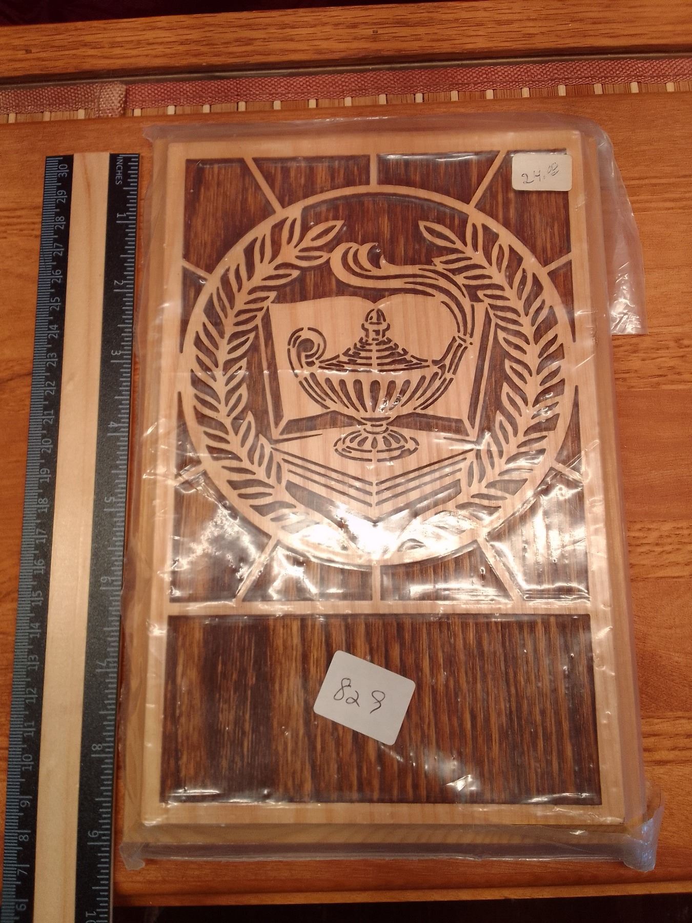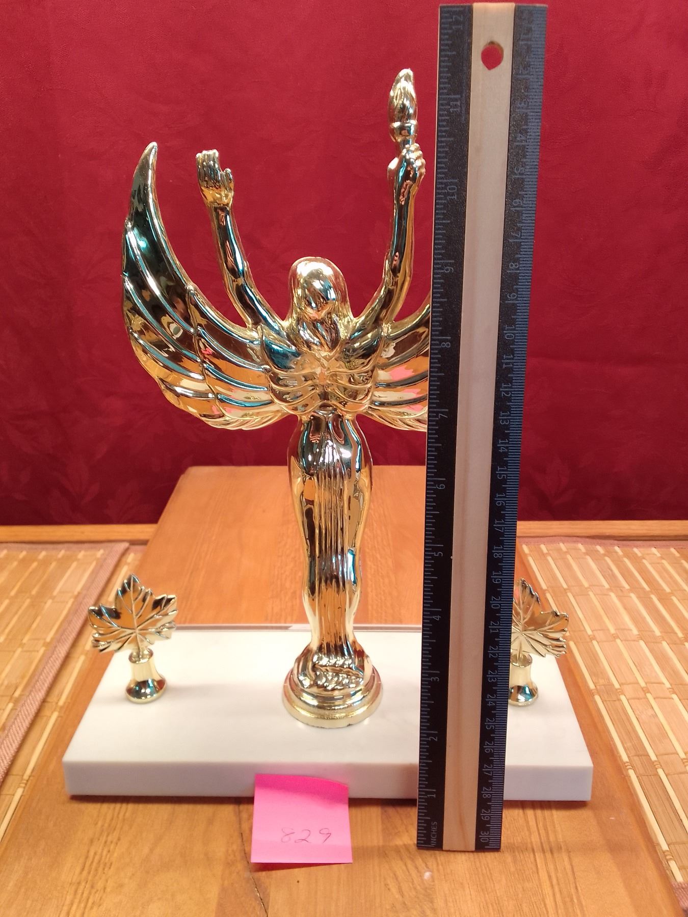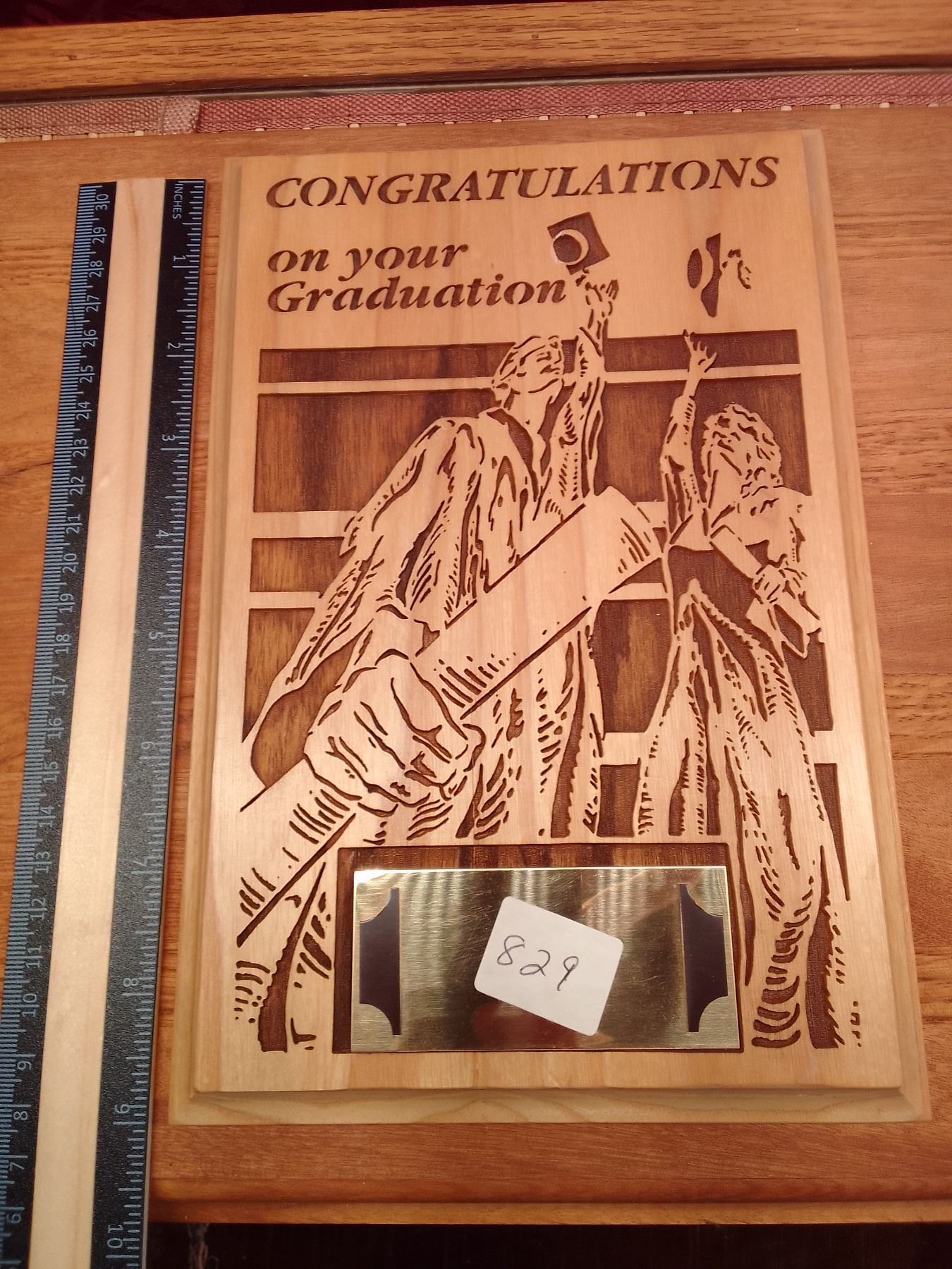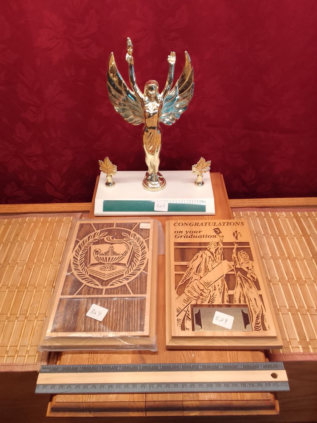 Vintage Victory Trophy Topper & Graduation Plaques Set - Lot includes gold winged victory figure on base with maple leaves, plus two wooden graduation plaques: one with lamp of knowledge emblem, one with "Congratulations on your Graduation" scene. Perfect for awards or nostalgic decor.